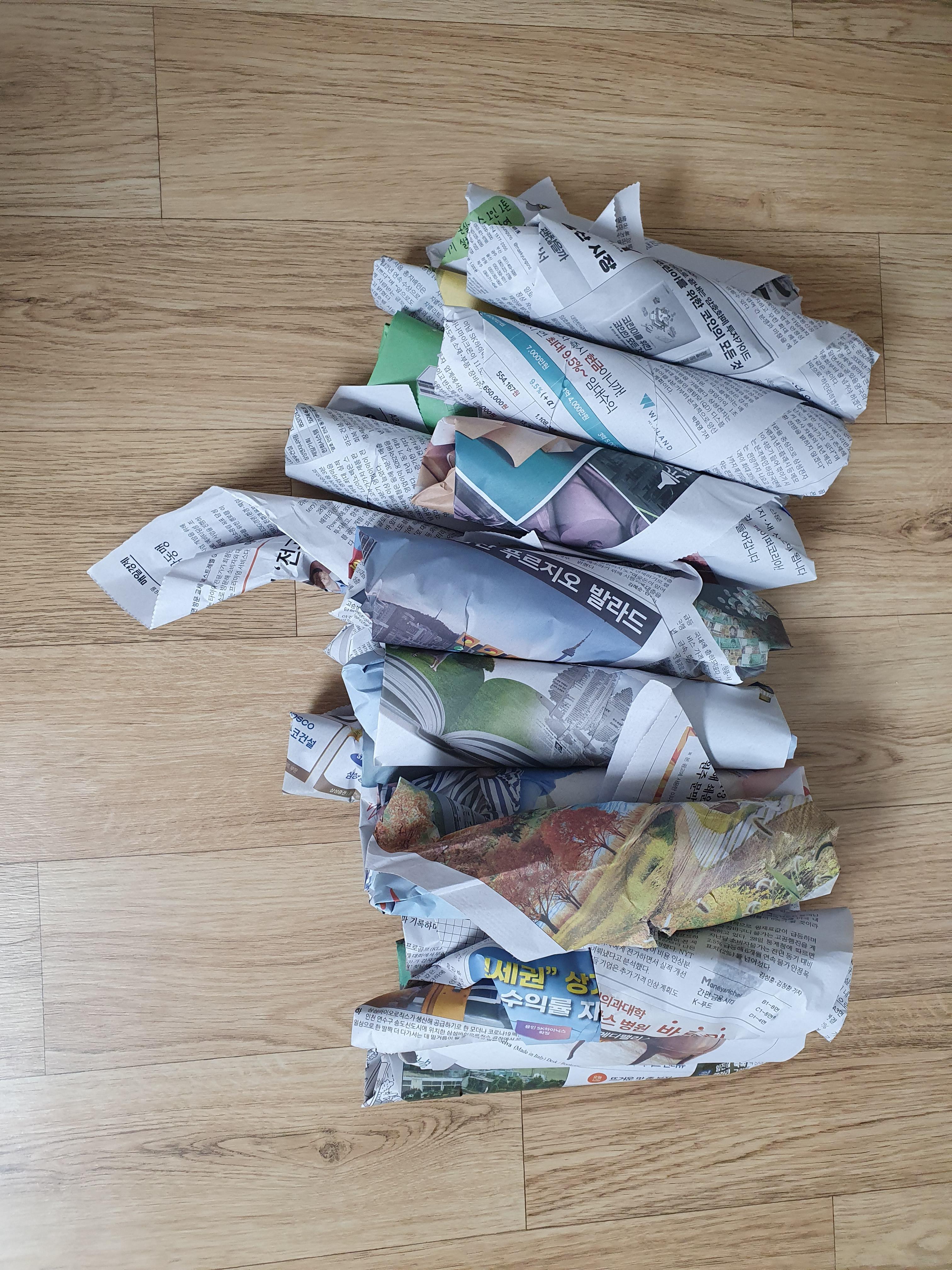 신문지로 옥수수 하나를 넣고 돌돌 말았습니다. 껍질과 술 그대로 옥수수에 말았습니다.
