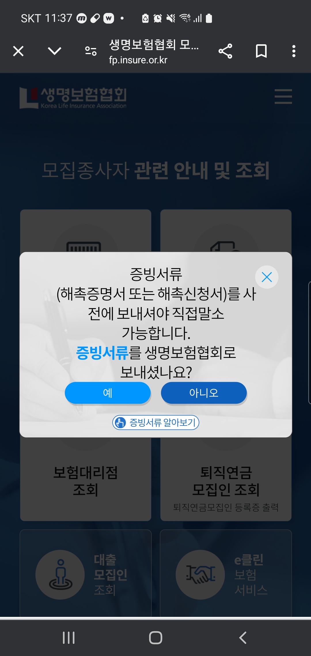증빙서류를 보냈냐는 팝업이 뜹니다. 내용증명서를 보냈으니 예를 누릅니다.