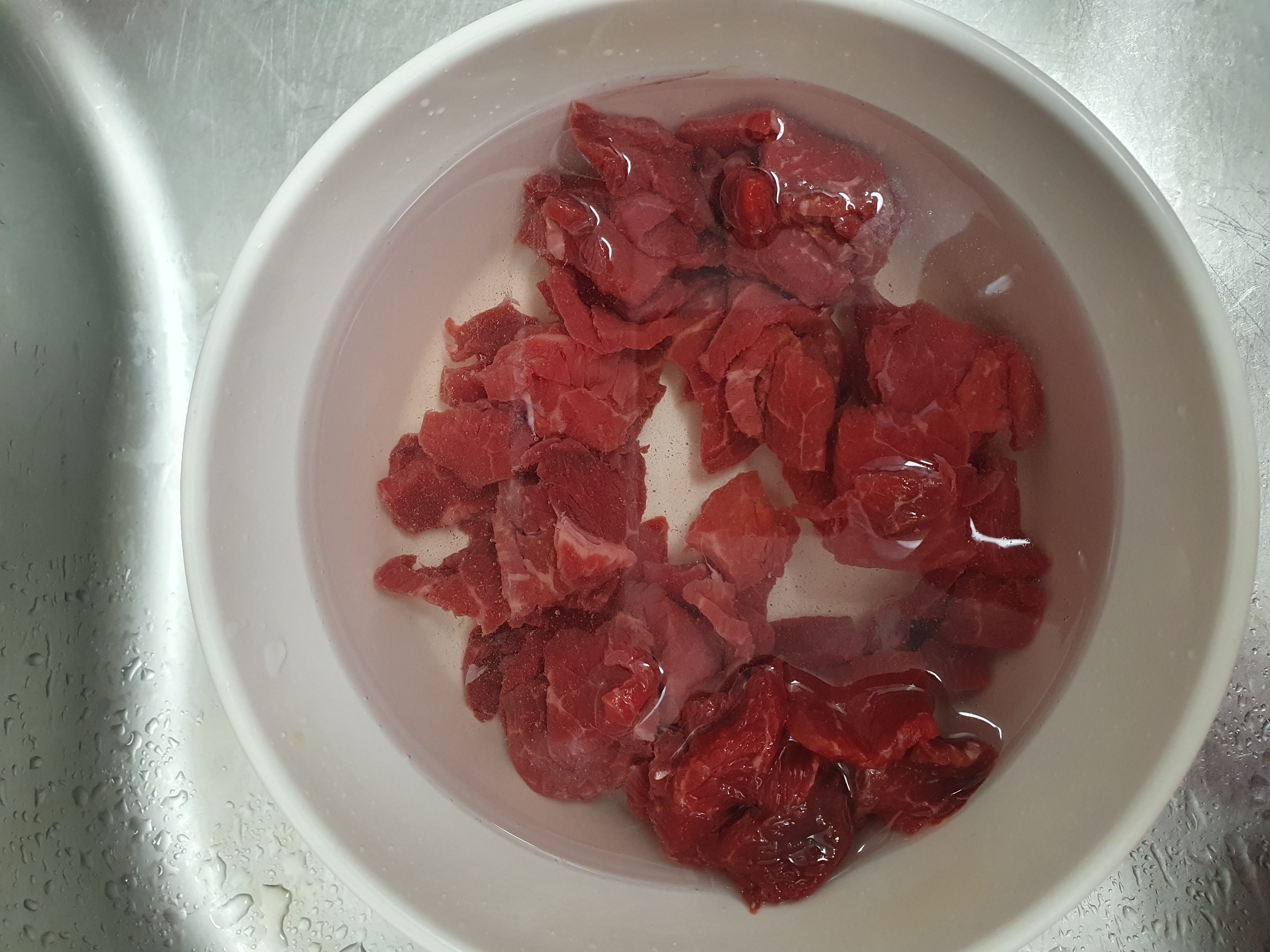 소고기 국거리용 한 근을 사서 3분의 1만 핏물을 빼 줍니다. 나머지는 2개로 소분해서 냉동실에 넣었구요.