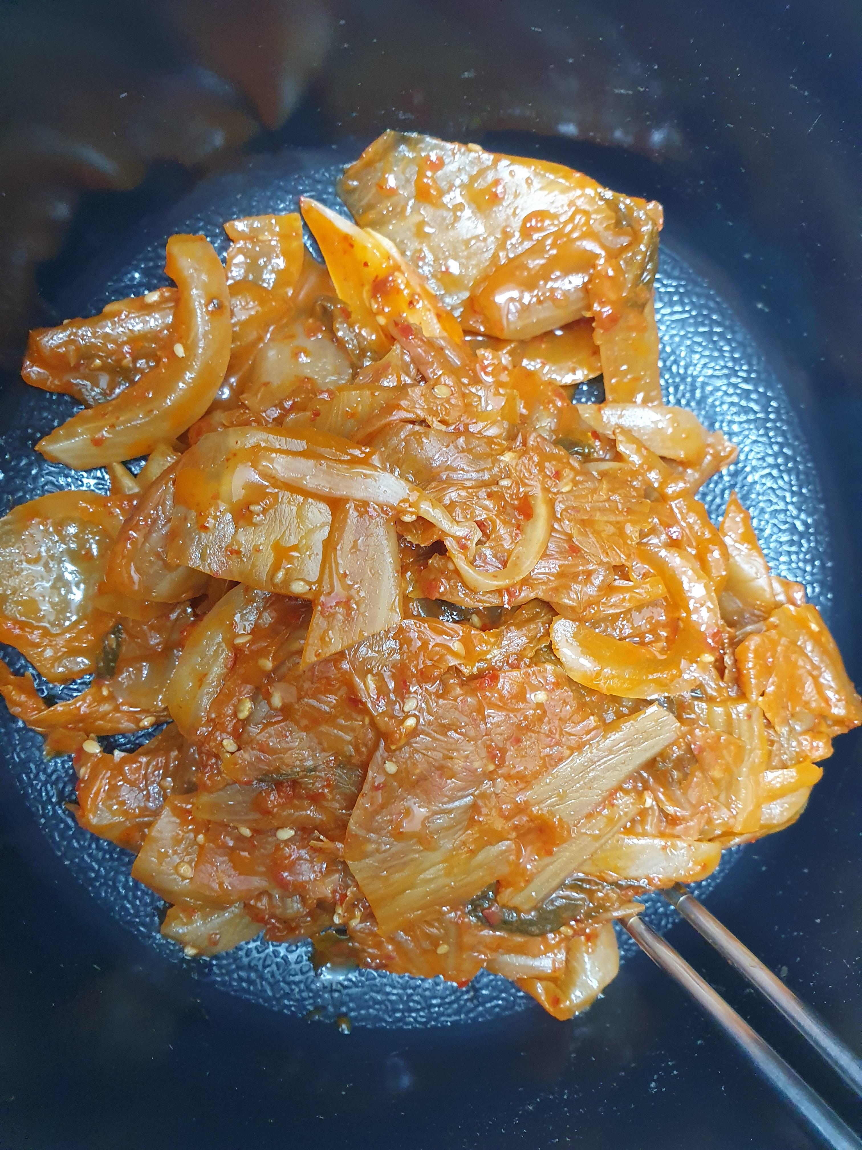 부추김치가 많이 쉰 상태로 있었습니다. 이 세 개의 김치찌개를 넣어서 김치찌개를 만들었습니다.