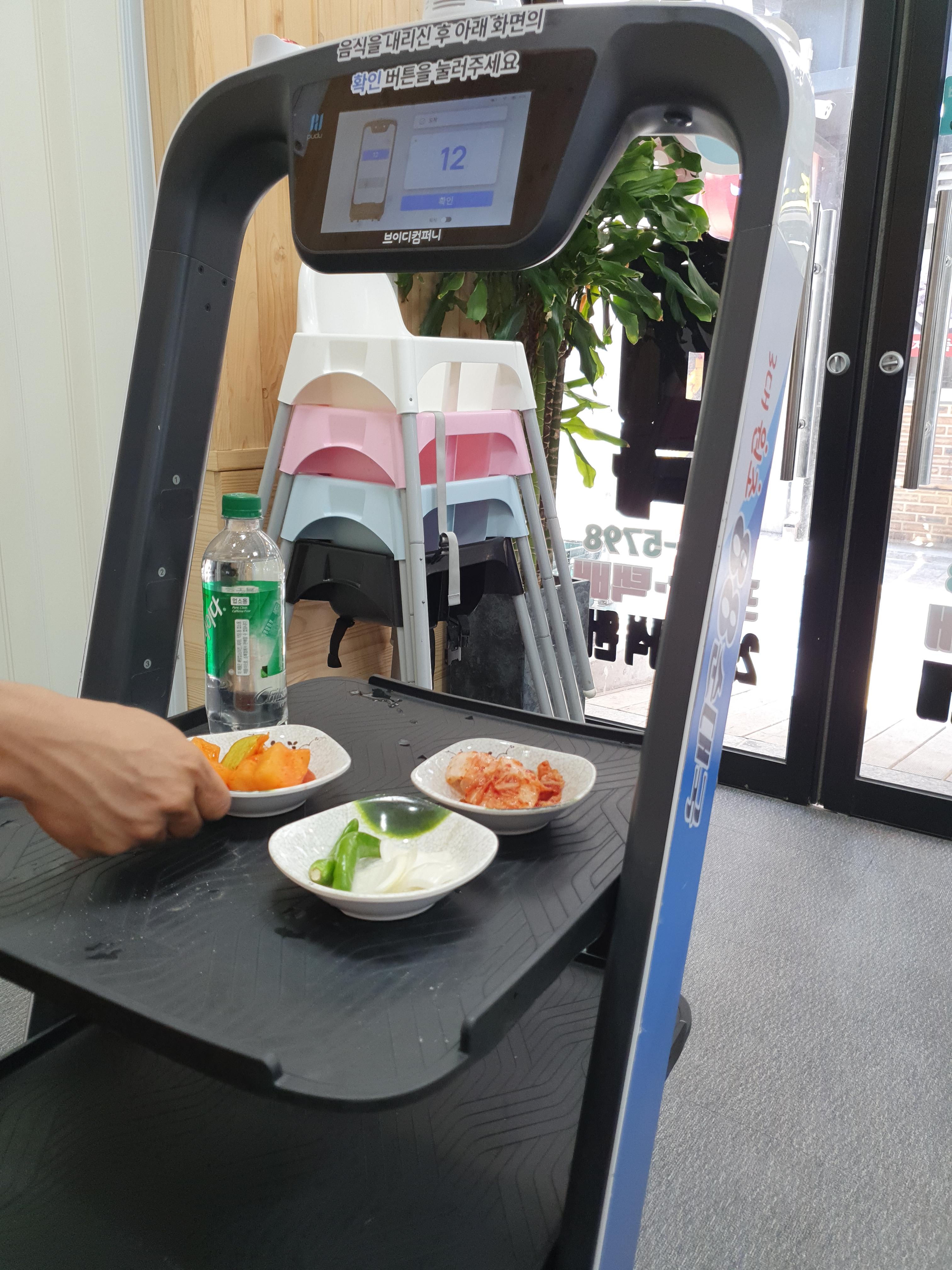로봇이 반찬을 갔다주네요. 몇 년 전에 왔을 때는 사람이었는데.