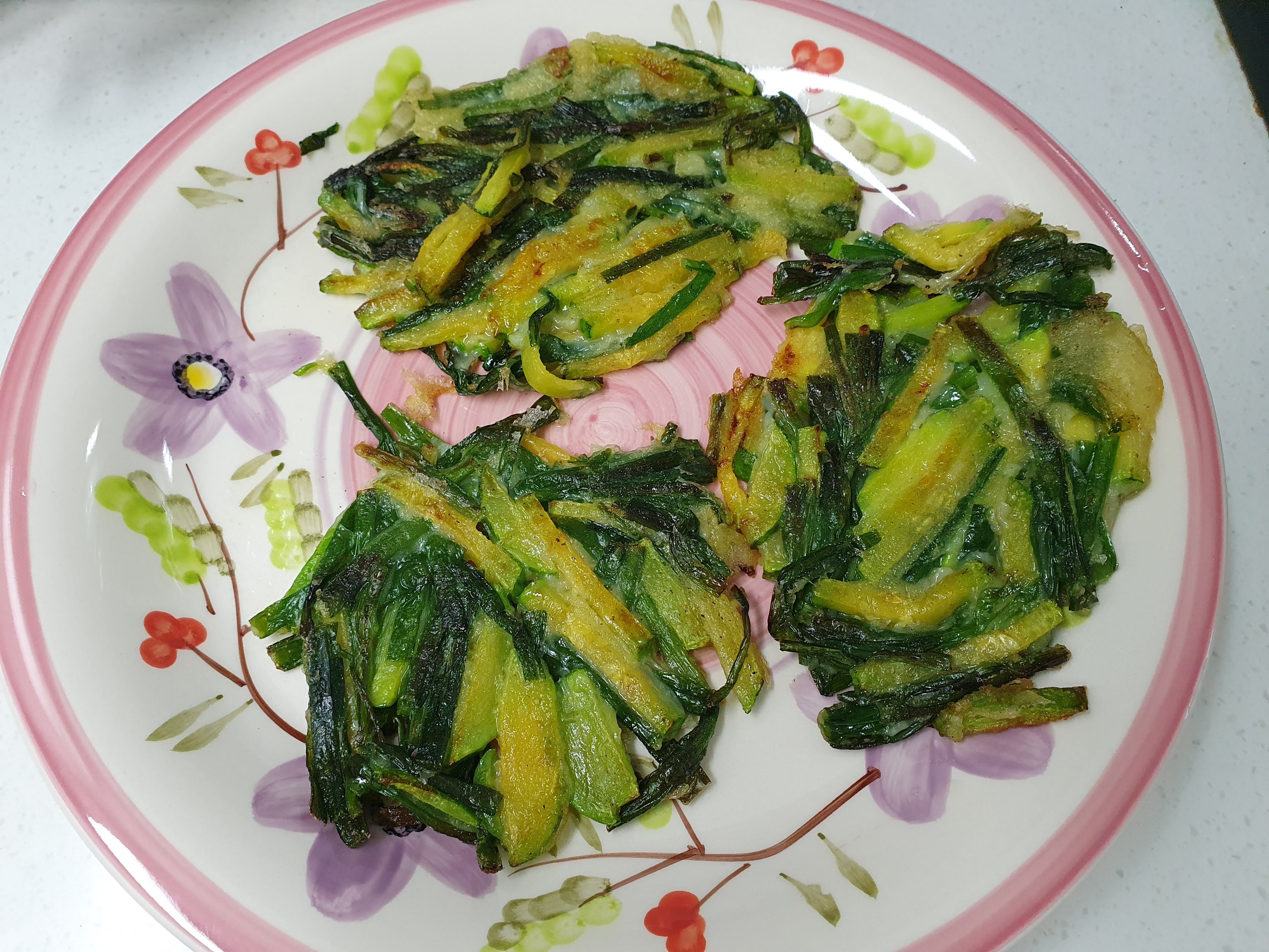 어머님이 부추 한 단을 주셔서 부추전을 만들어 봤습니다. 부추가 착상에 좋기도 하구요. 밀가루는 착상에 안 좋으니까 옥수수가루와 카레가루를 조금 풀었습니다. 그리고 부추만 넣으면 반죽이 잘 안 붙을 거 같아서 냉장고에 있는 호박도 썰어 넣어 봤구요.