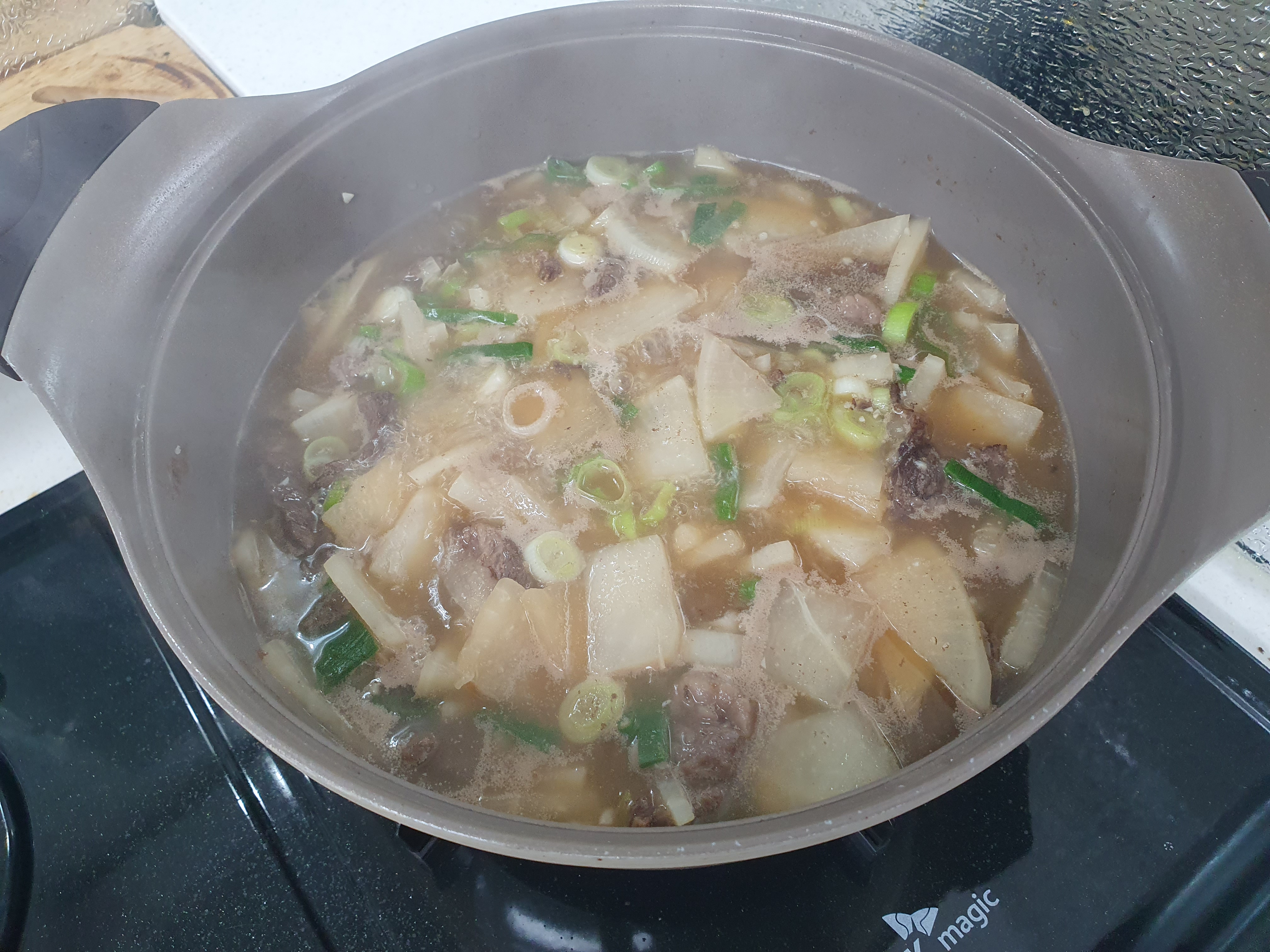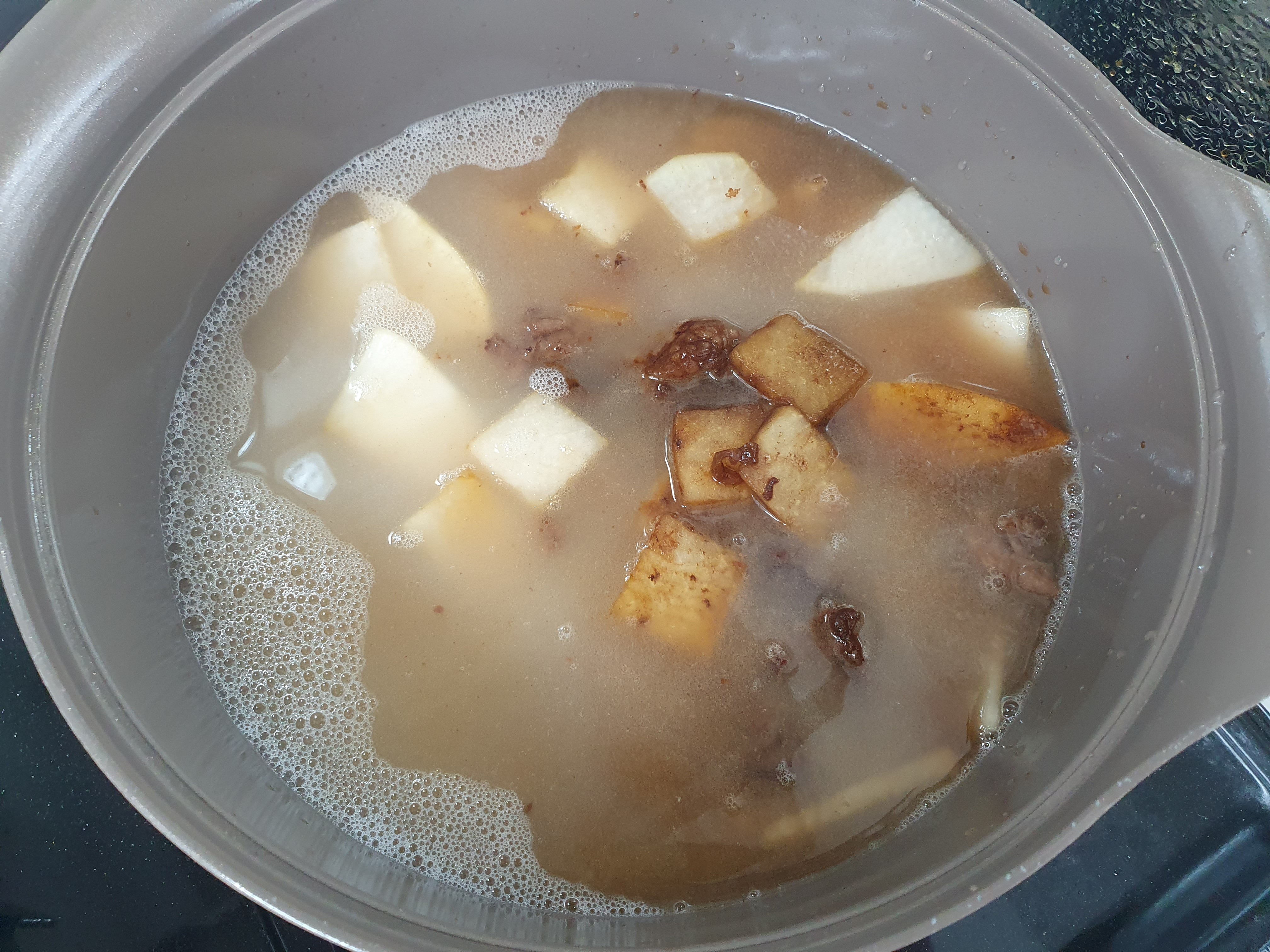 쌀뜬물에 볶은 소고기, 무를 넣고 팔팔 끓여 줍니다.