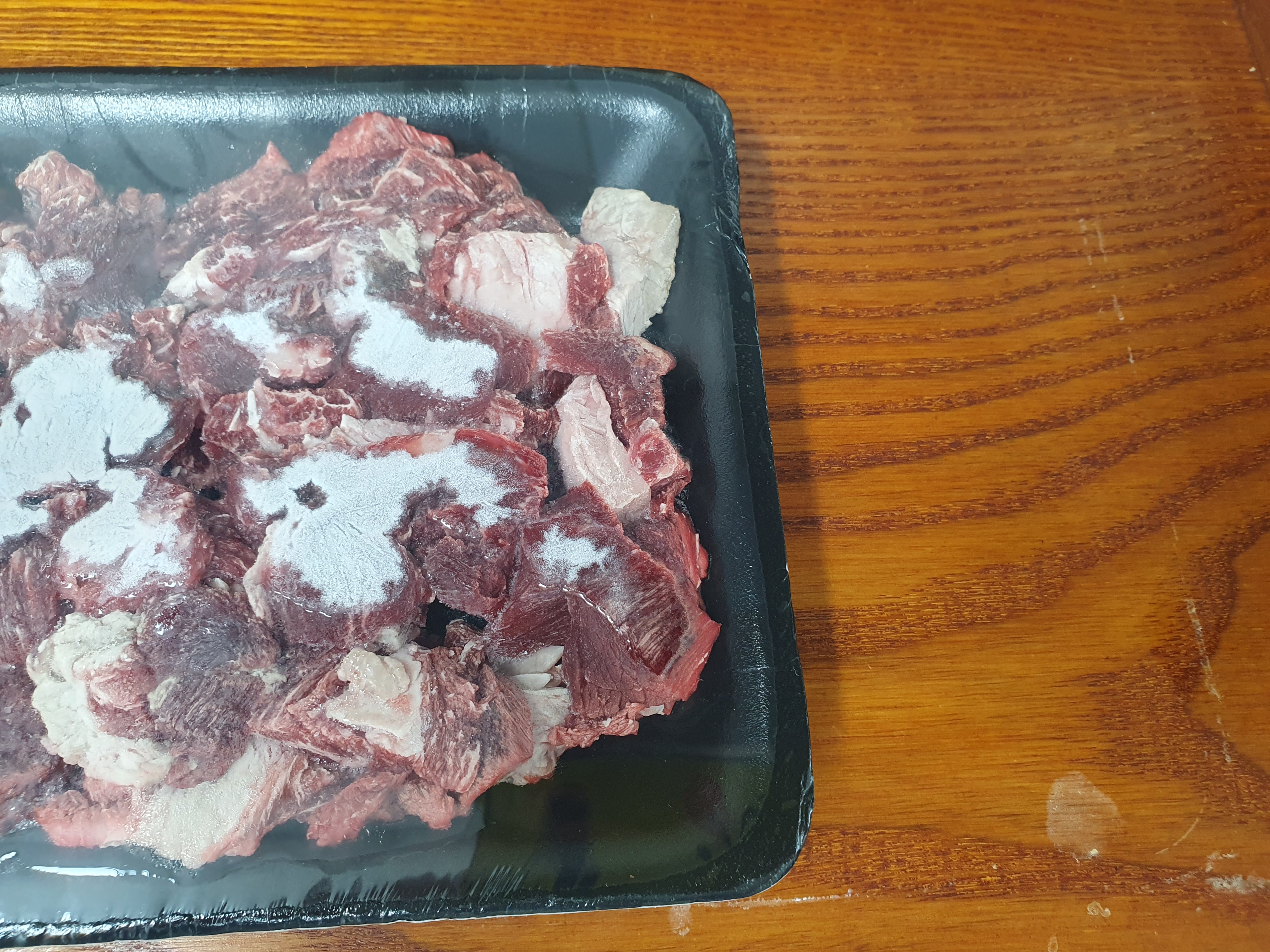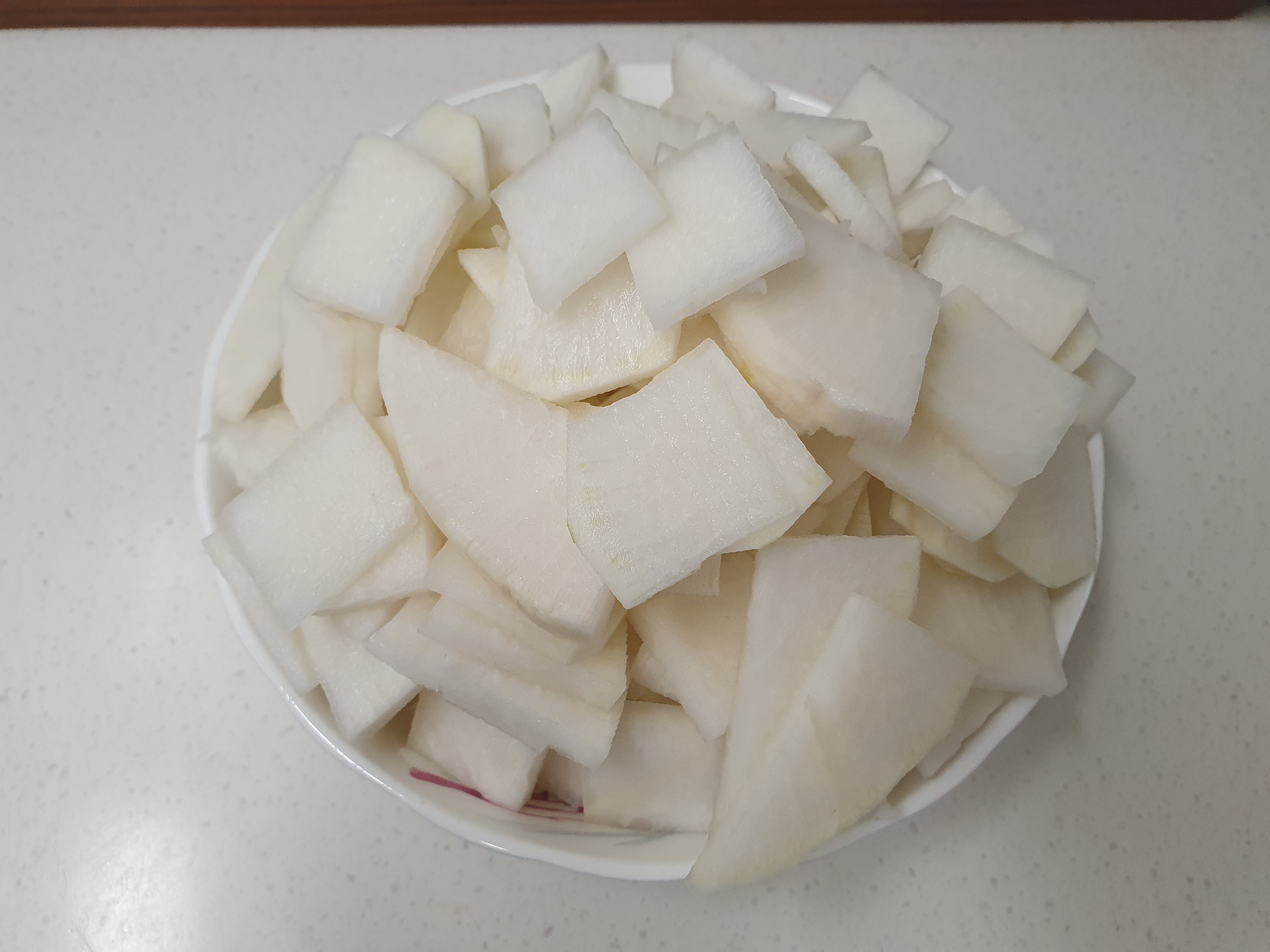 먼저 소고기를 준비하고, 해동되기를 기다리는 동안에 무와 파를 썹니다.