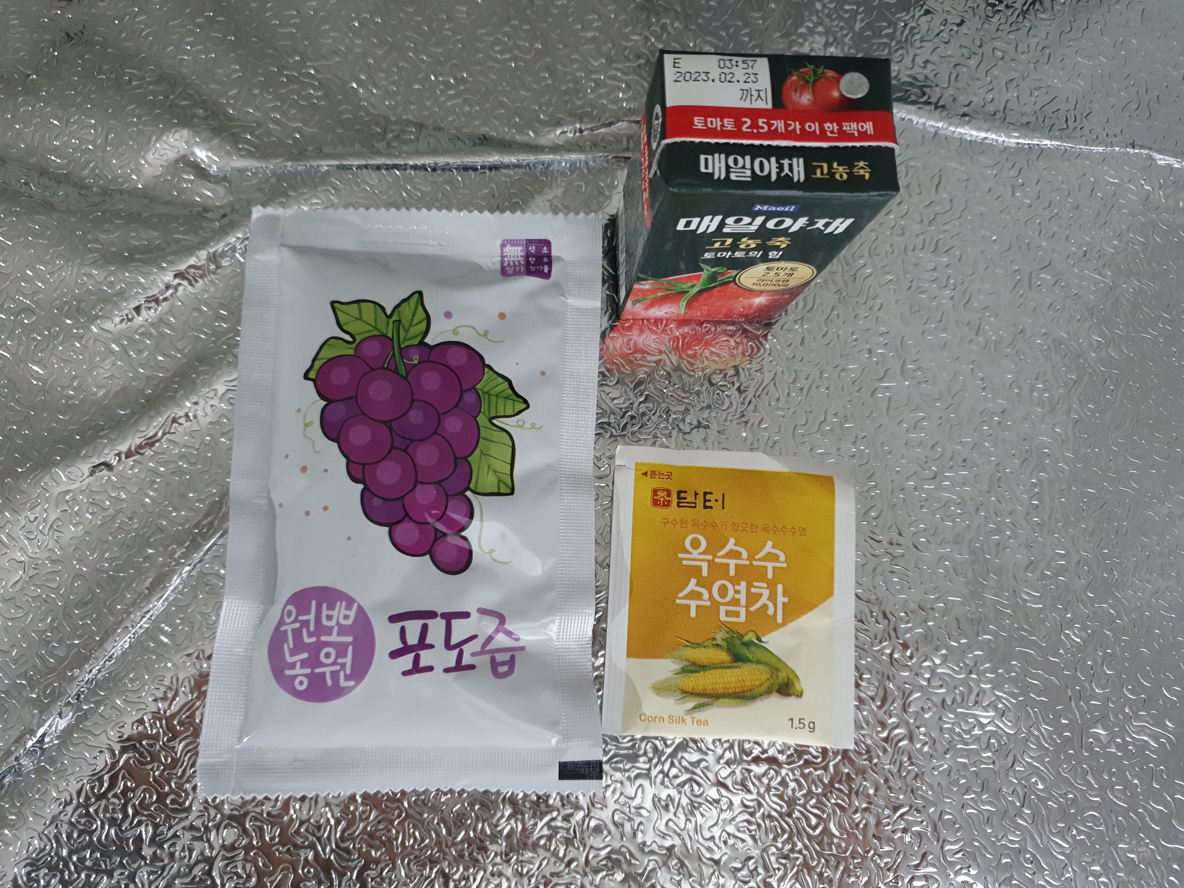 토마토즙과 포도즙, 옥수수차도 매일 먹습니다. 포도즙은 6개월 전에도 먹었는데 어제까지 두유 먹다가 다시 포도즙 먹기 시작합니다.