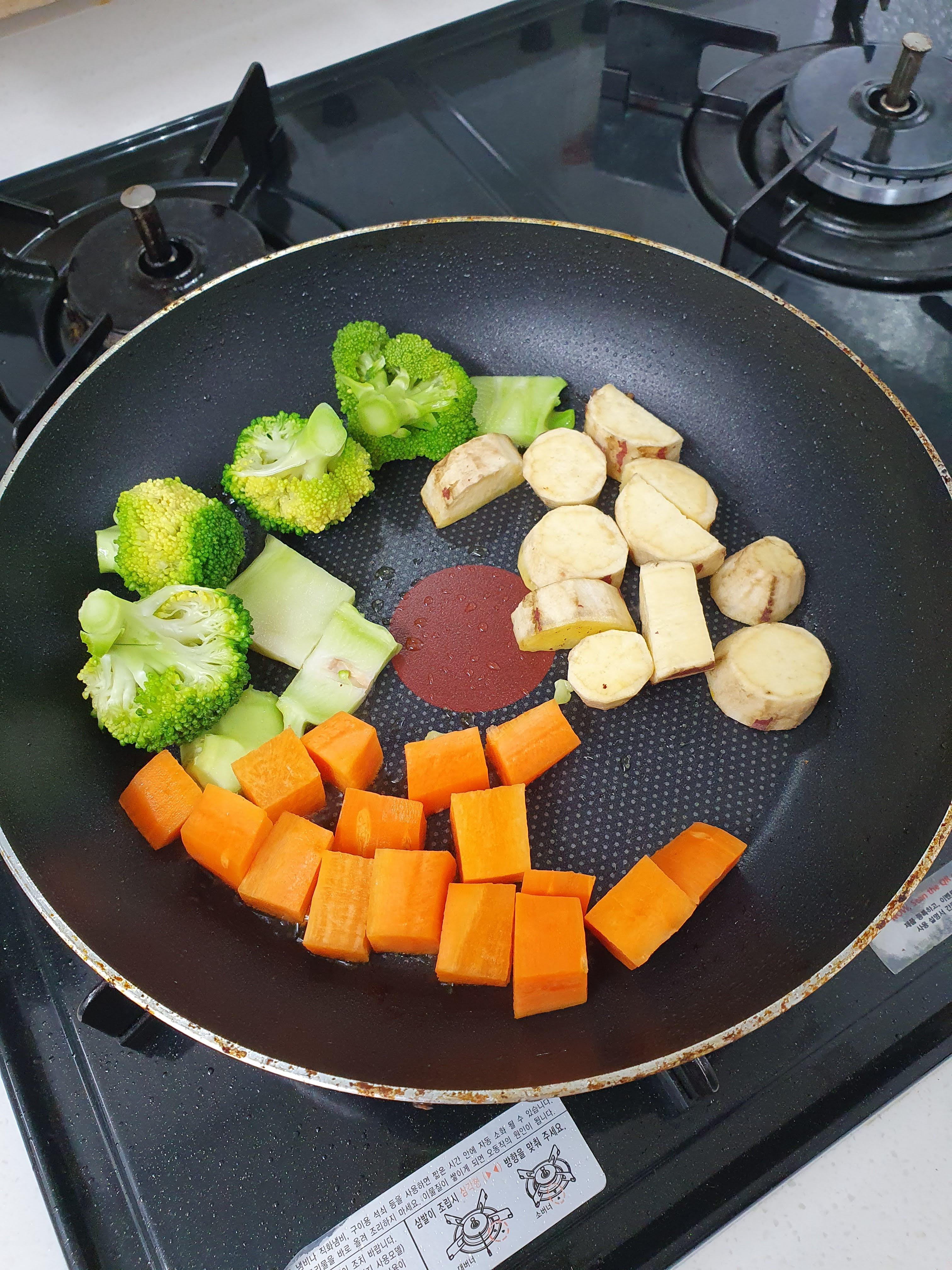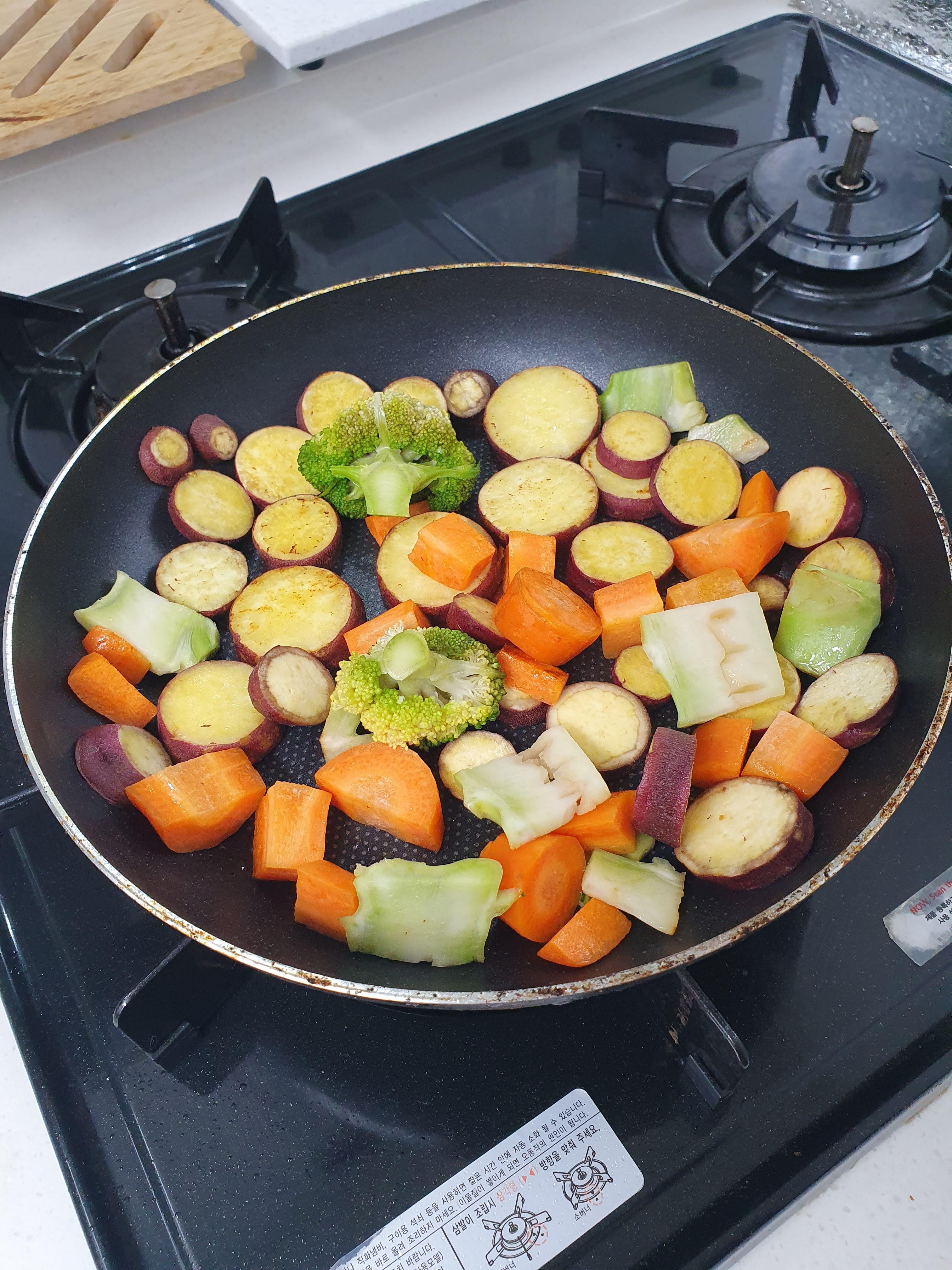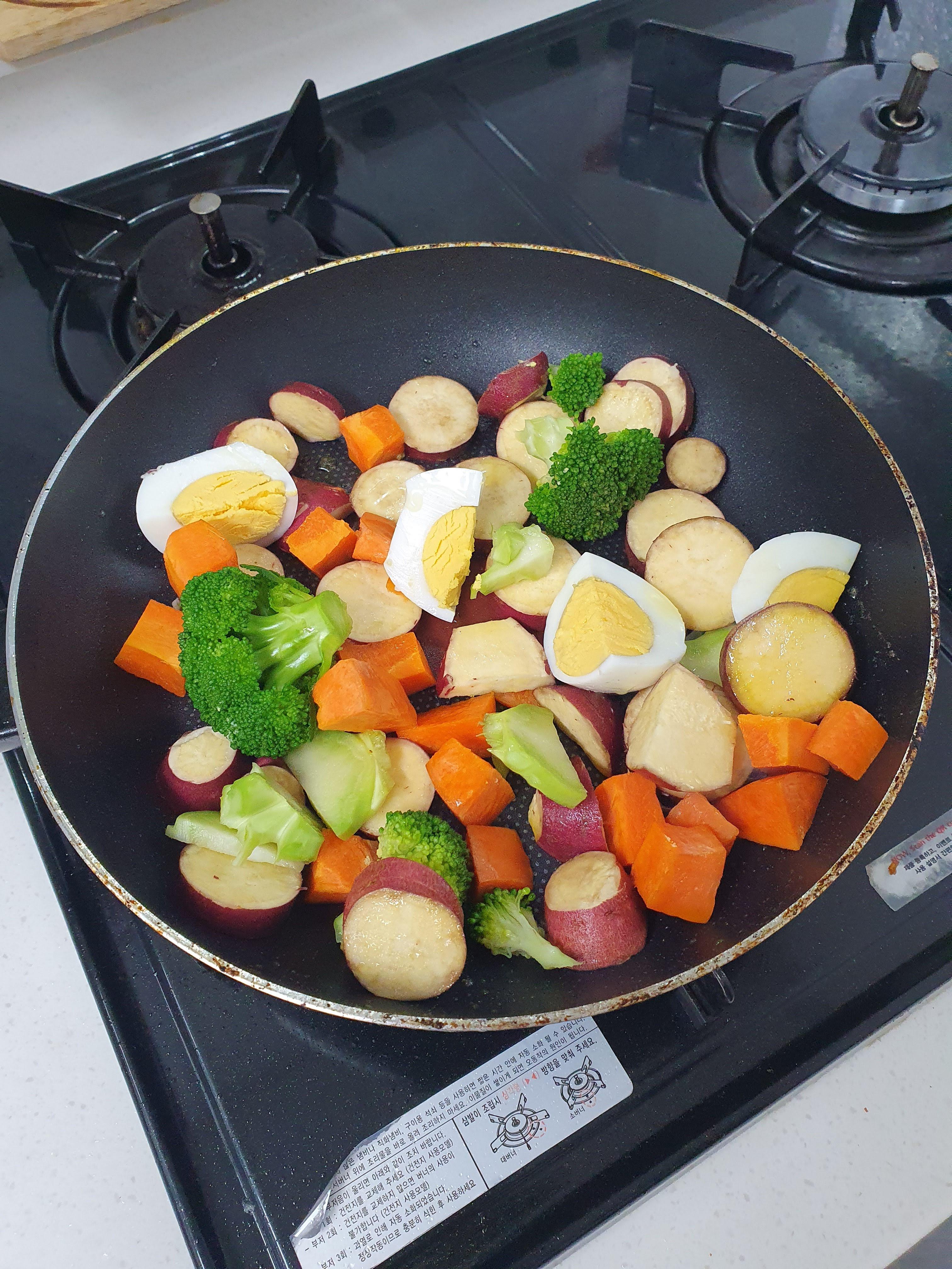 5월 28일 화요일에는 아침에 고구마, 브로콜리, 당근 위에 올리브유를 뿌린 다음에 프라이팬으로 조금 볶은 다음에 먹었습니다. 고구마와 당근은 너무 딱딱하면 먹기가 부담스러워서 프라이팬에 볶아서 먹는 편입니다.
