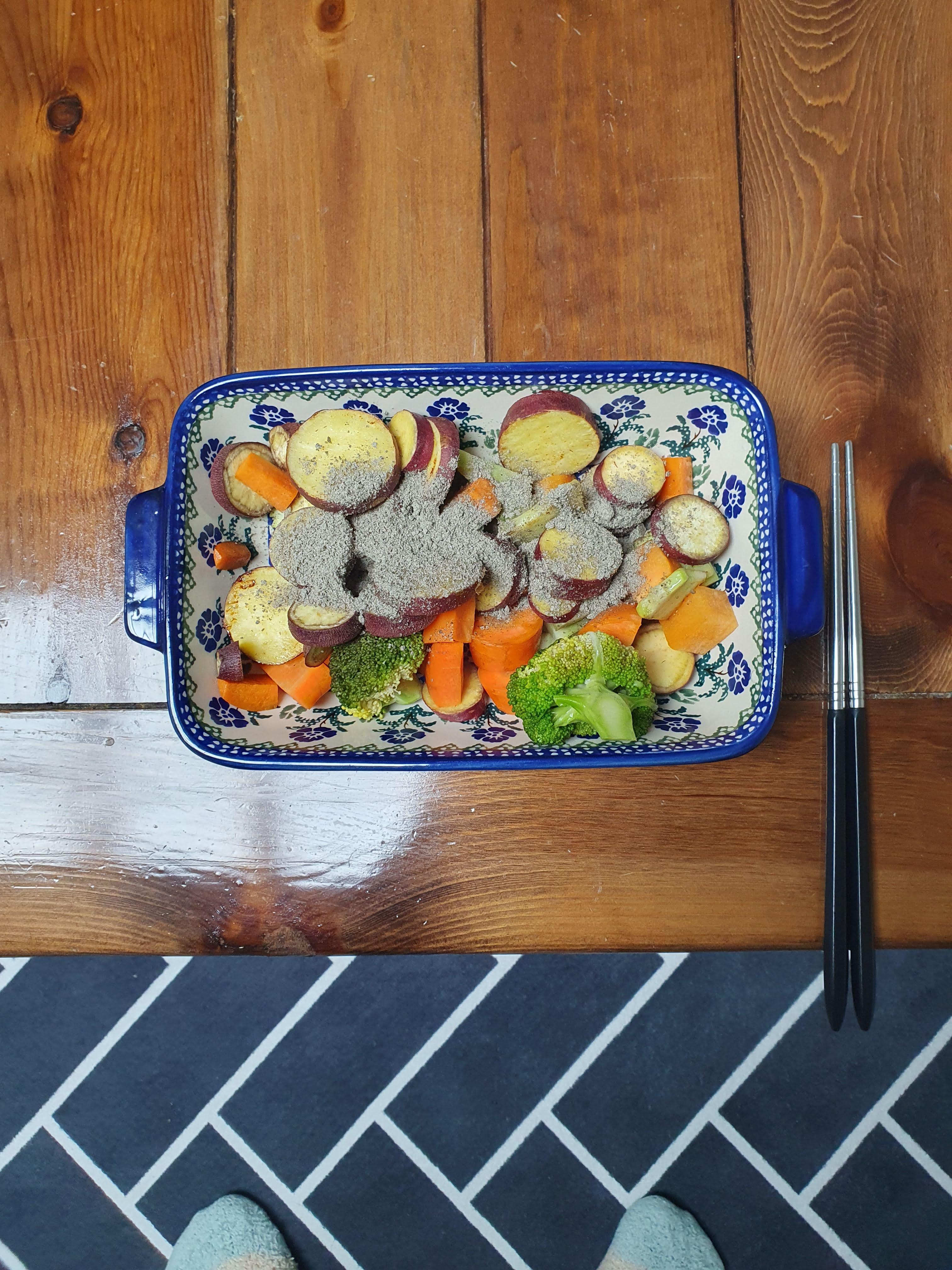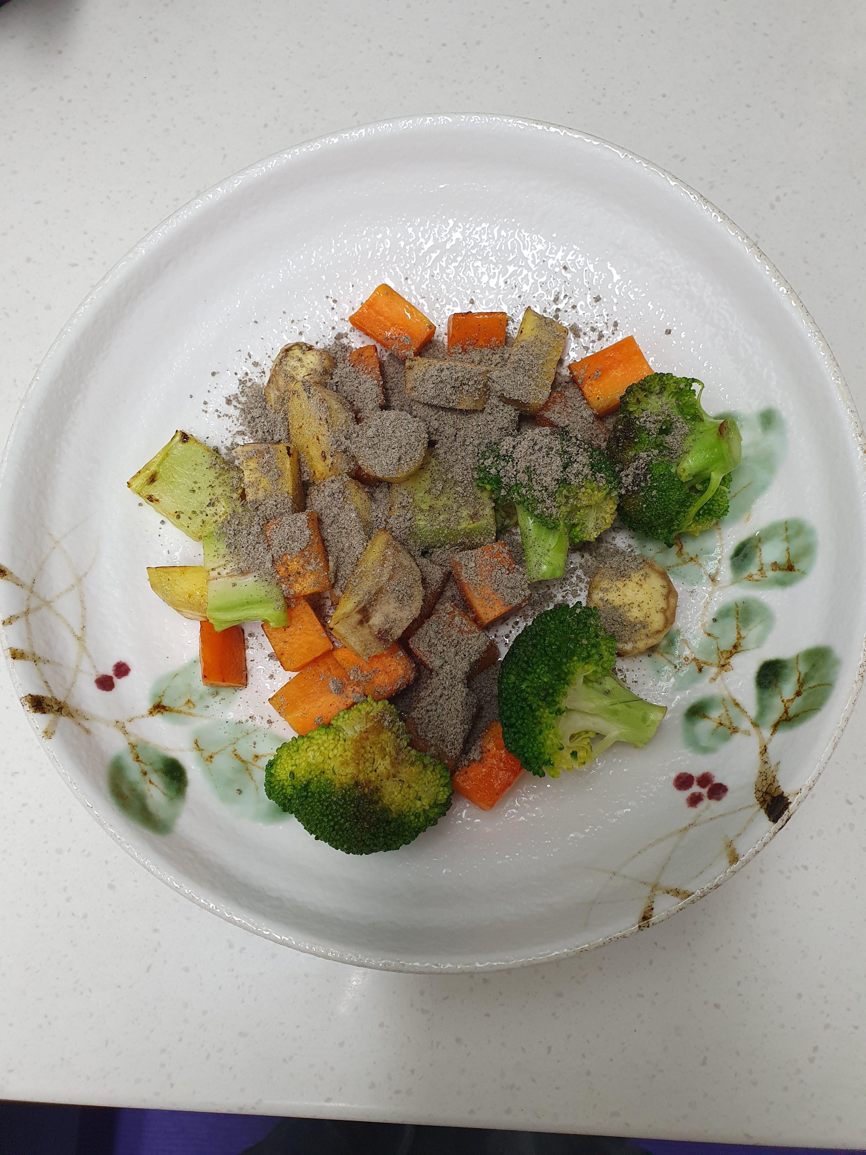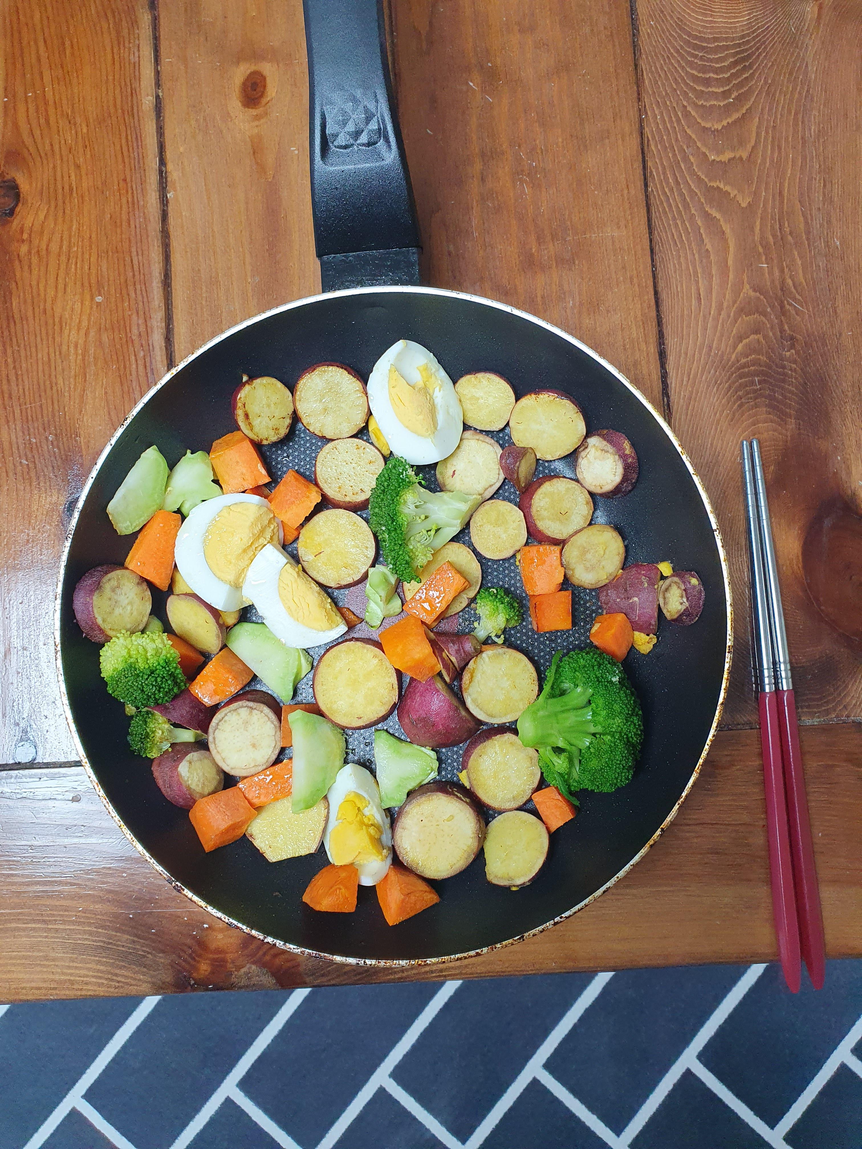 5월 28일 화요일에는 아침에 고구마, 브로콜리, 당근 위에 올리브유를 뿌린 다음에 프라이팬으로 조금 볶은 다음에 먹었습니다. 고구마와 당근은 너무 딱딱하면 먹기가 부담스러워서 프라이팬에 볶아서 먹는 편입니다.