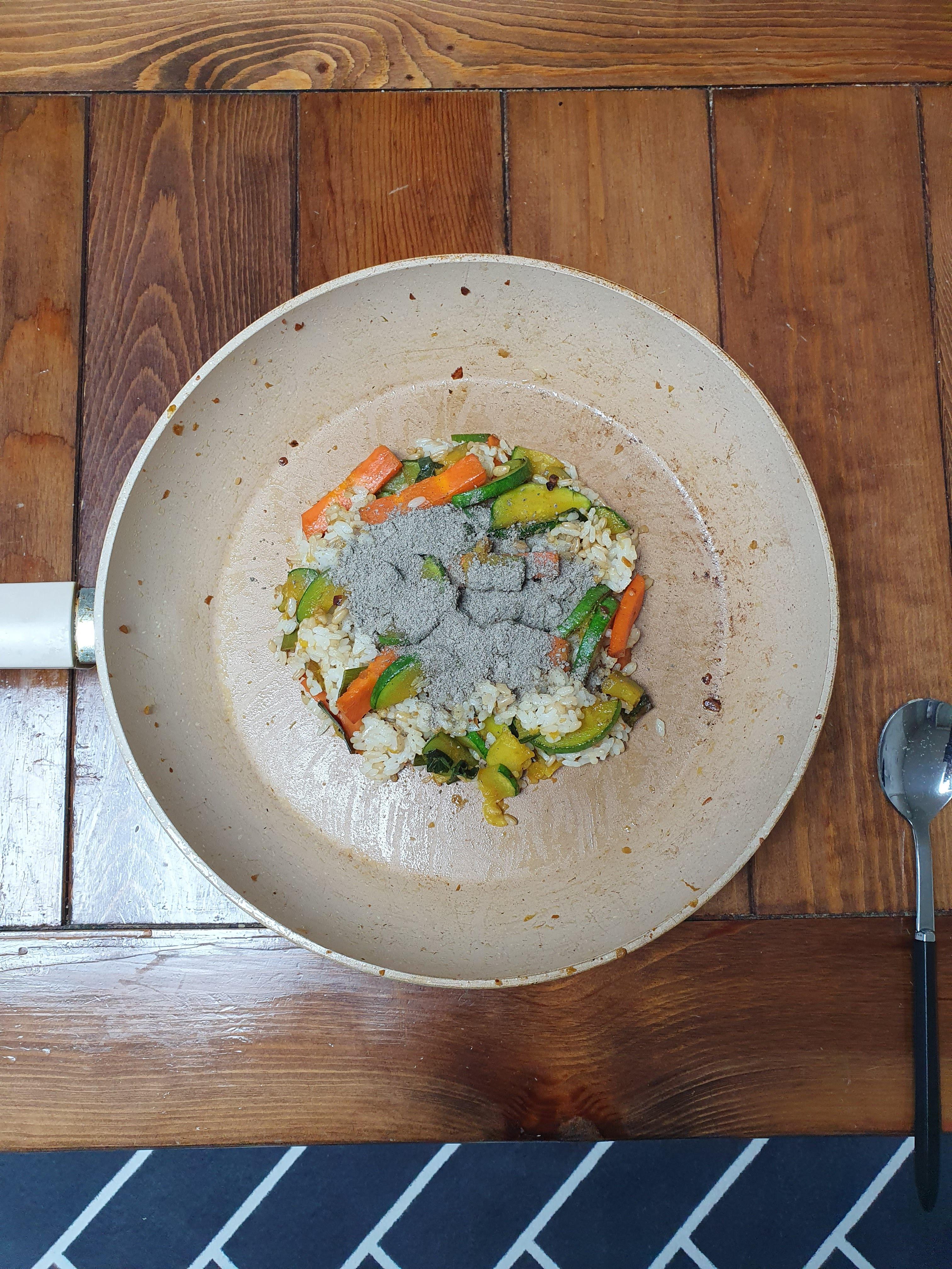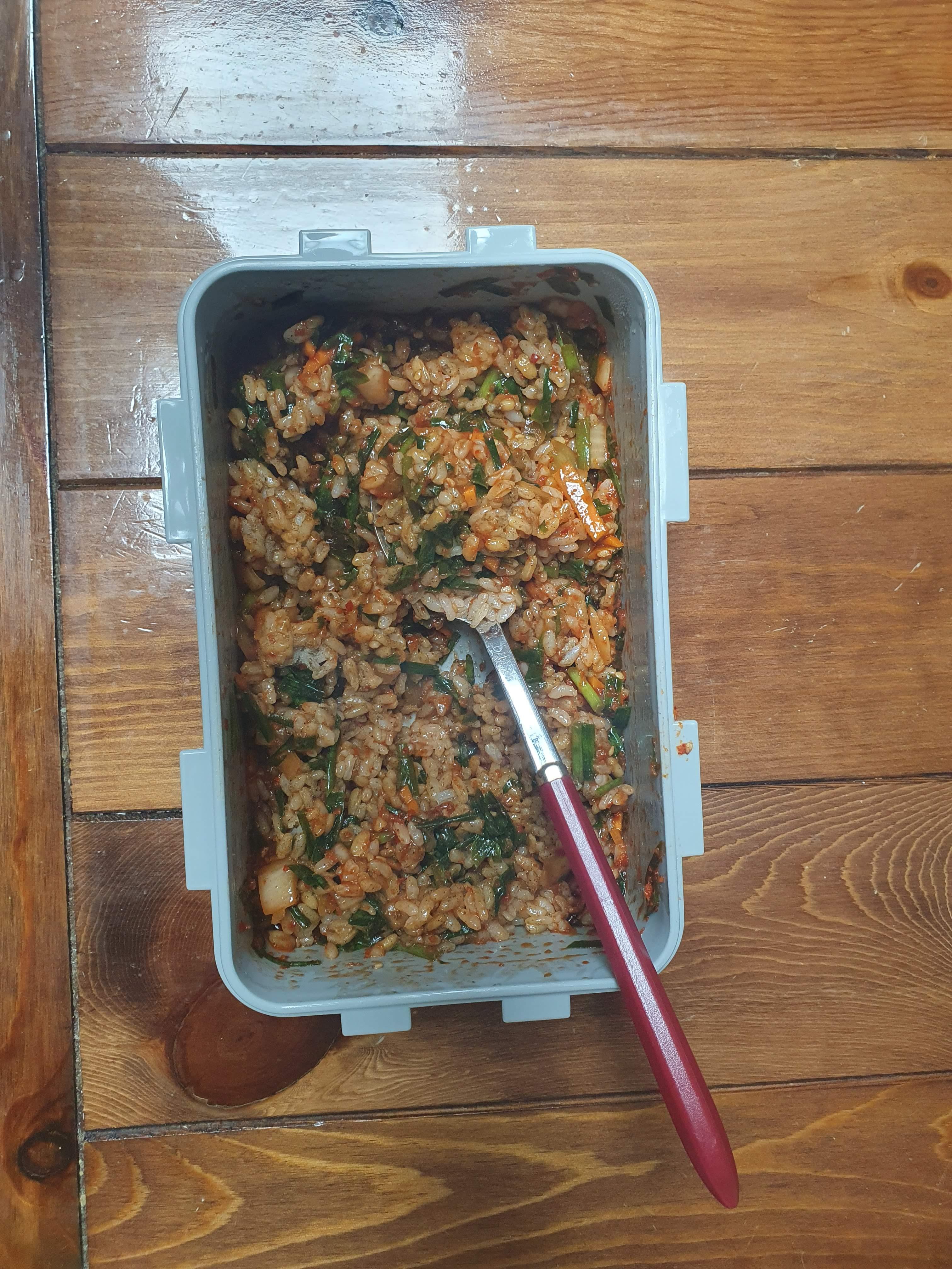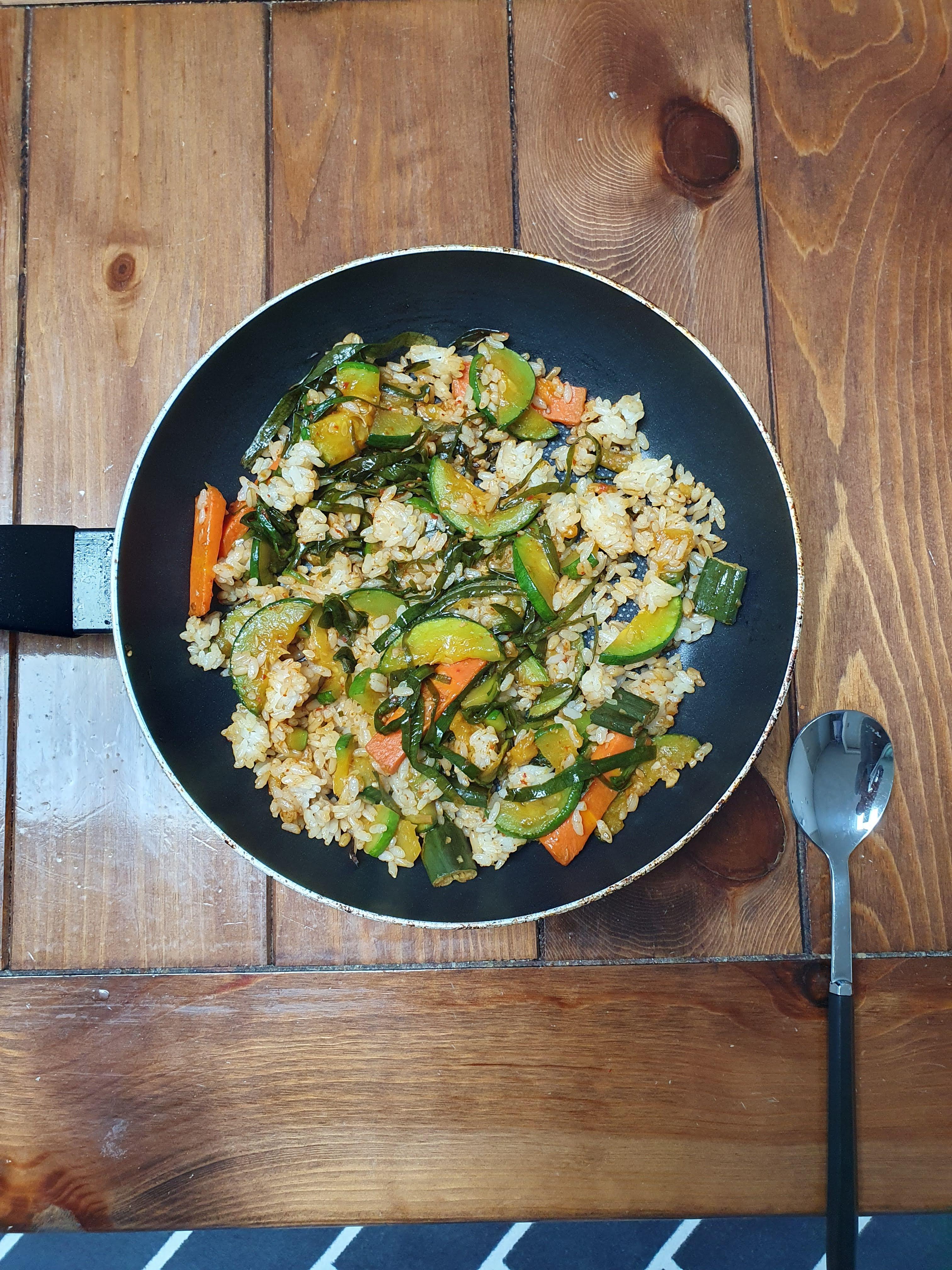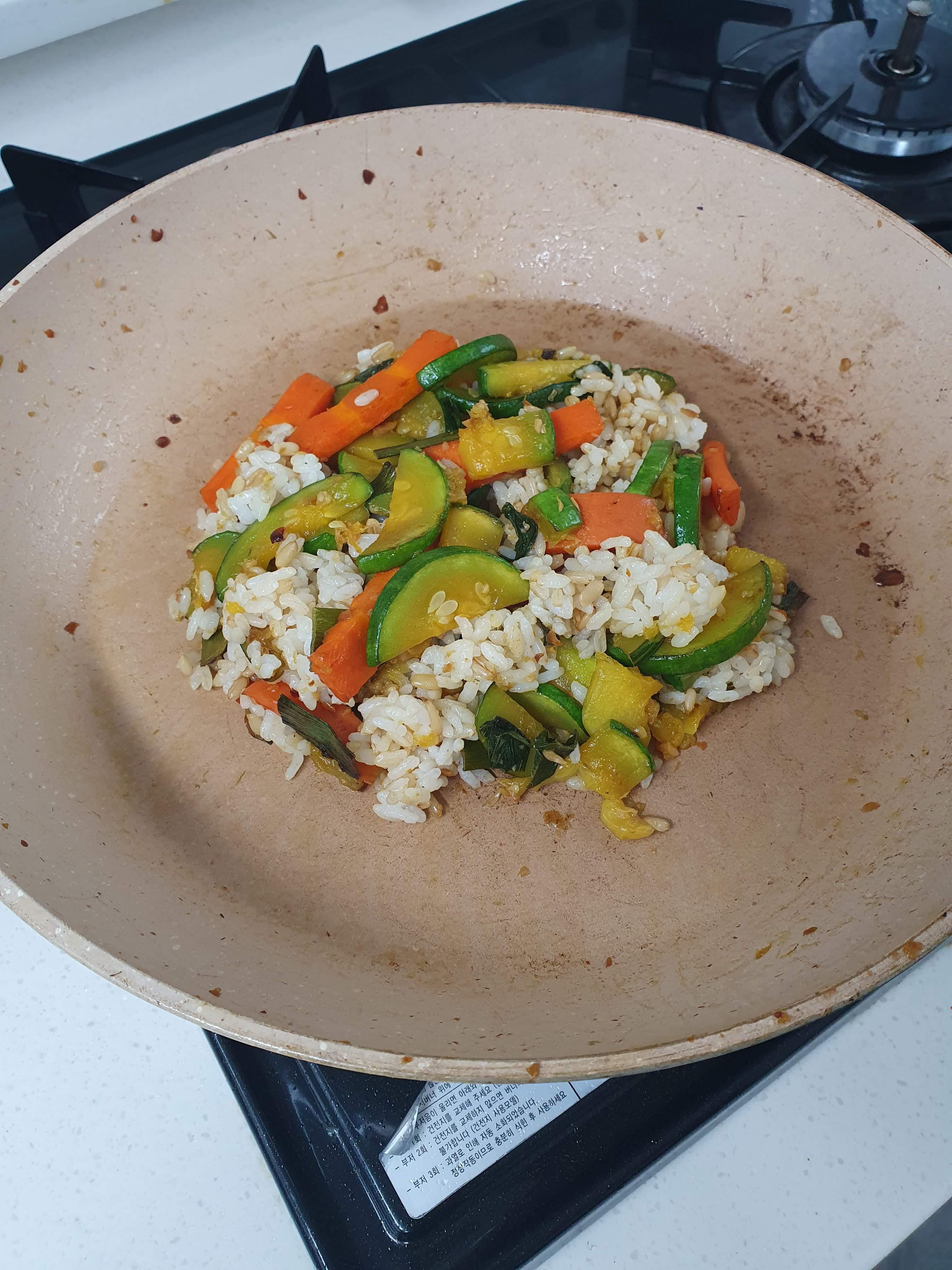 6.1. 토요일에는 아침에 샐러드를 먹고, 점심에는 호박부추 볶음밥을 먹었습니다. 1인용 프라이팬에 간단하게 먹었네요.