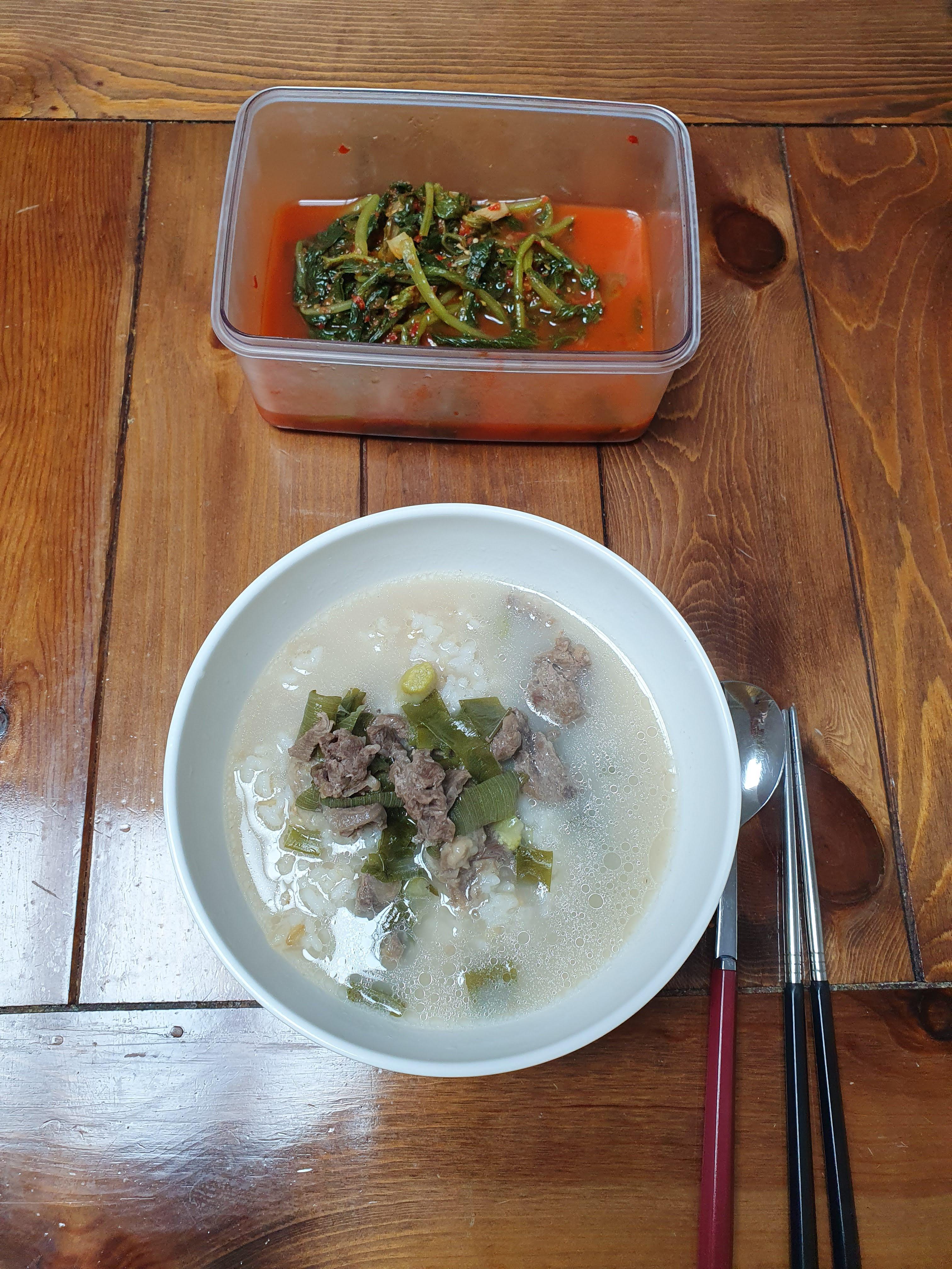 점심은 소고기사골국에 열무김치를 먹었습니다.