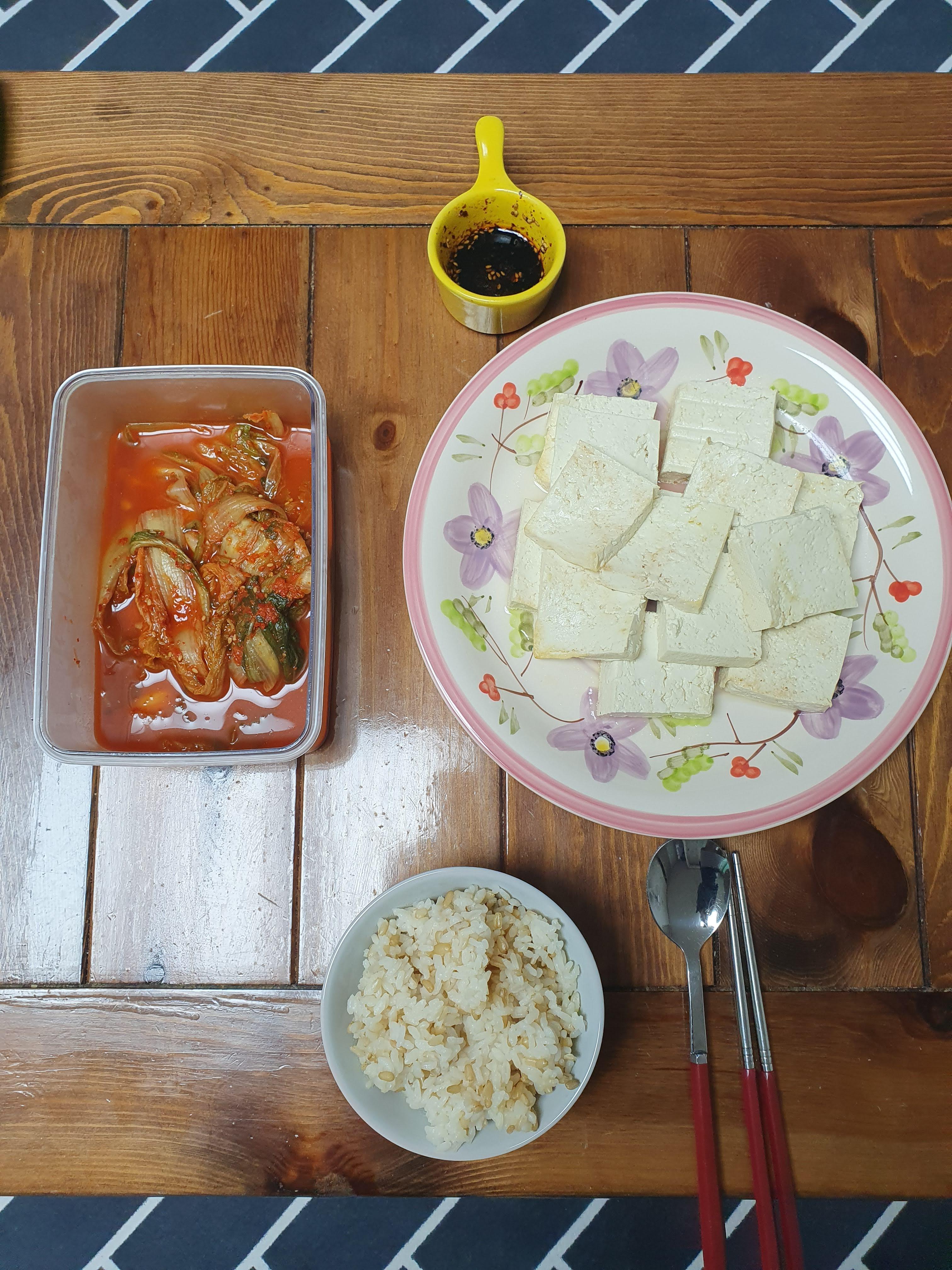 5.30. 목요일에는 아침에 샐러드에 삶은 계란도 넣어서 먹었습니다. 그리고 점심은 부침 두부를 먹었습니다.