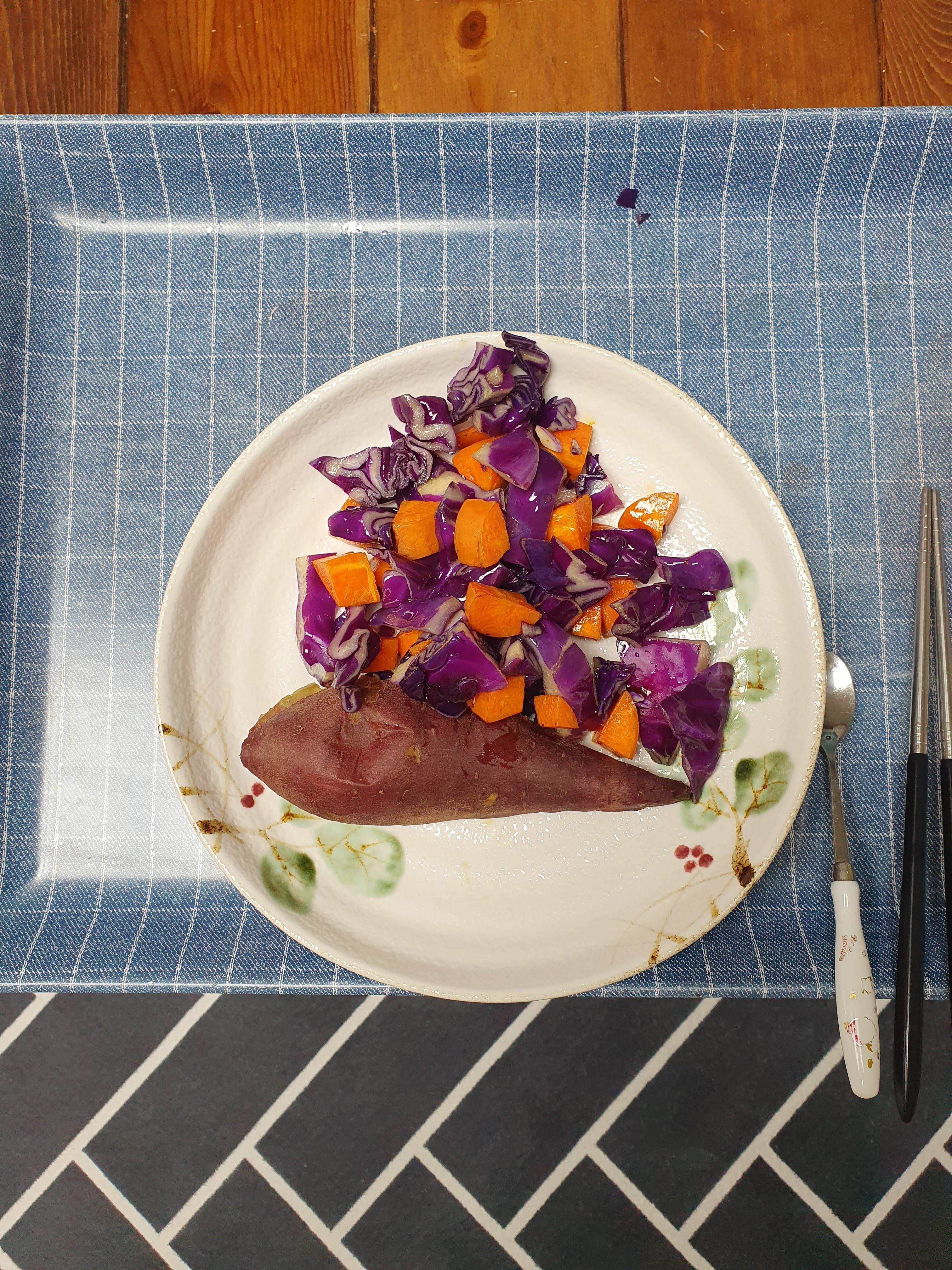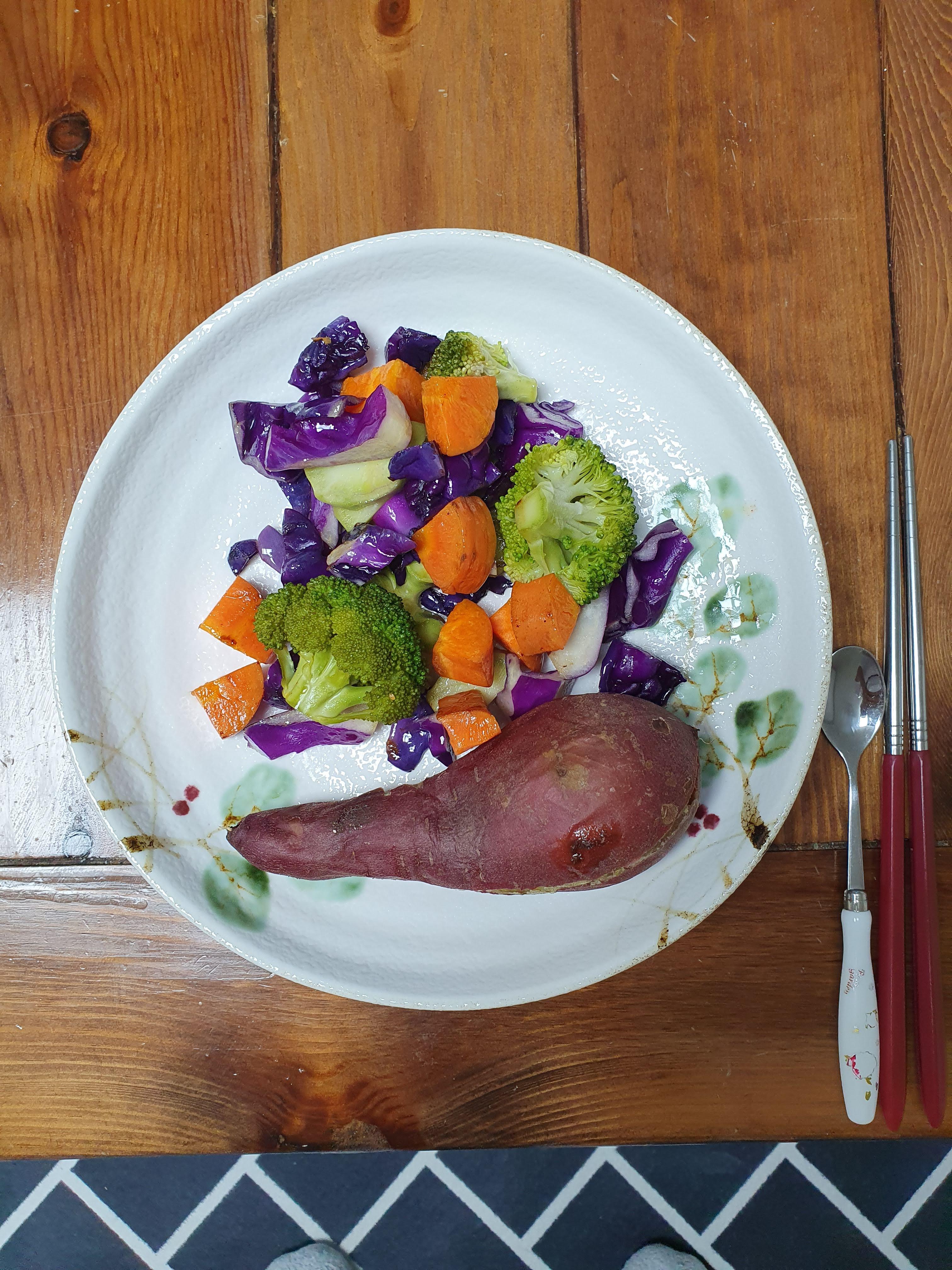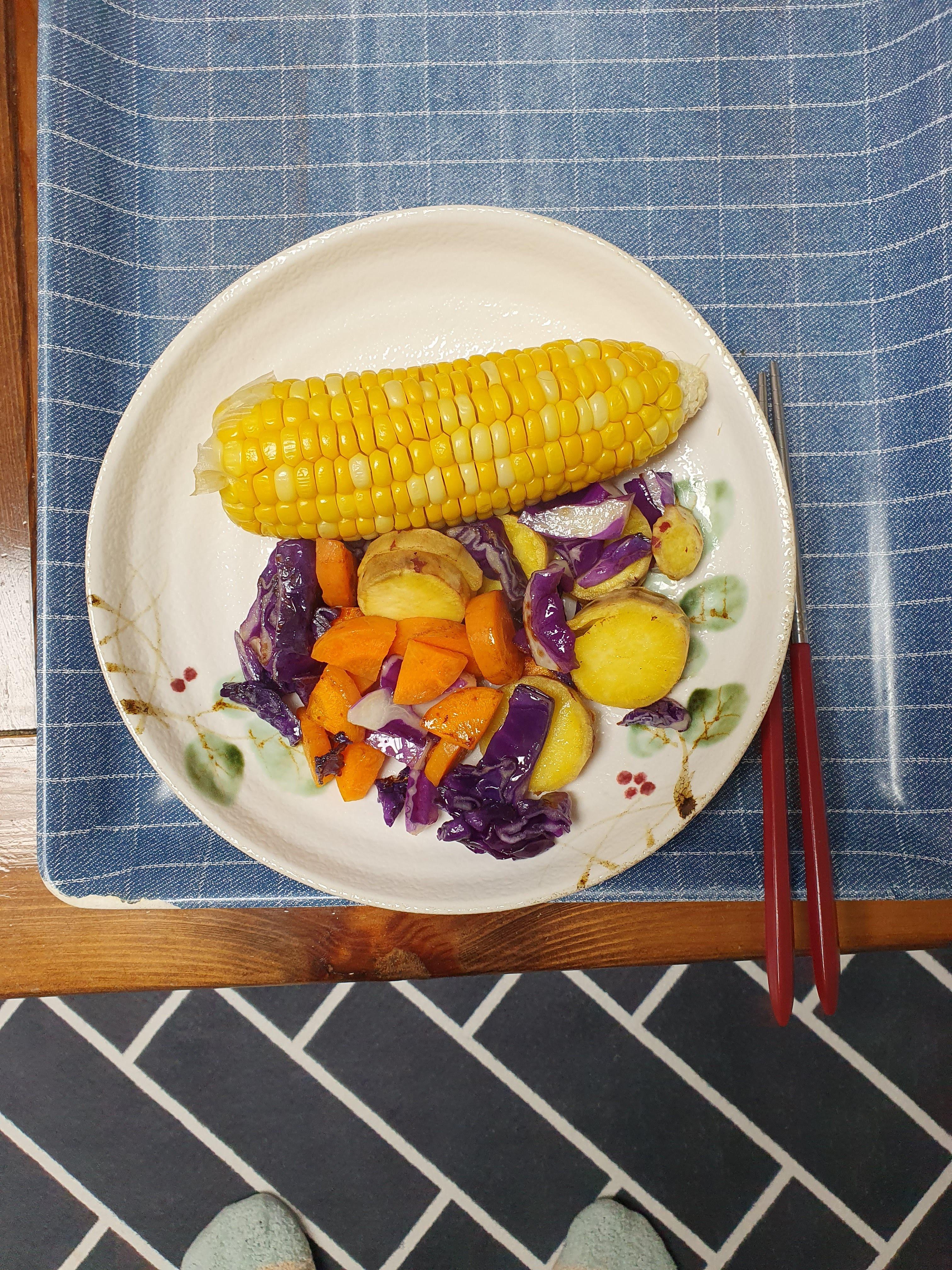 6.3. 월요일에는 아침 샐러드에 찐 고구마를 추가해서 먹었습니다. 고구마에는 섬유질, 칼륨, 칼슘이 들어 있습니다.