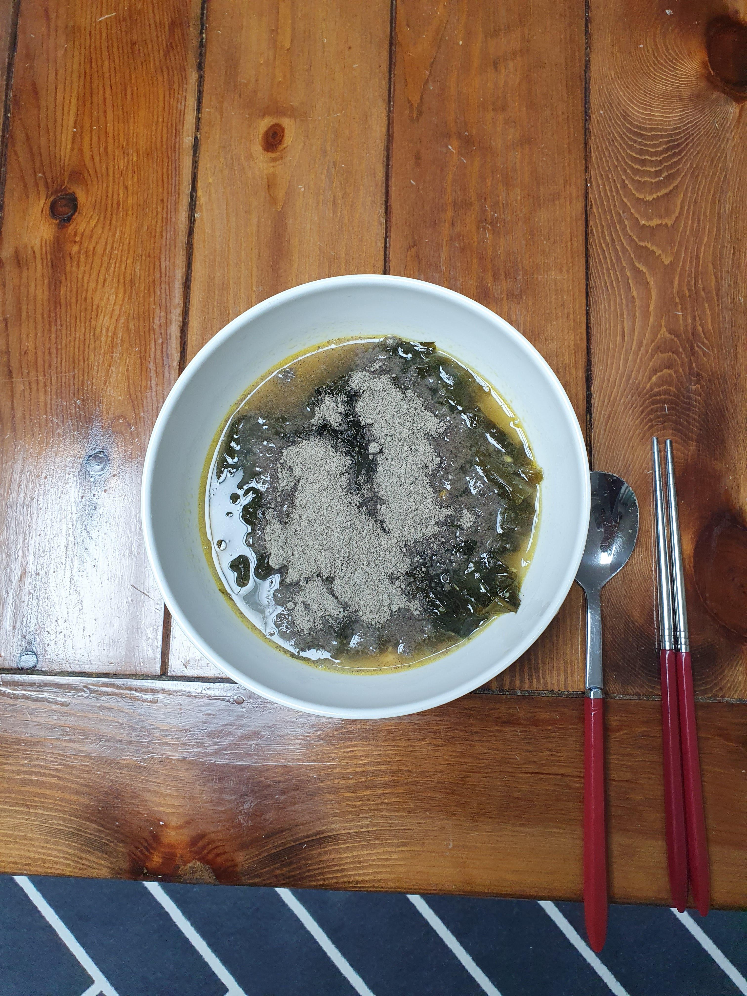 6.2. 일요일에는 미역국에 콩가루를 넣어서 먹었습니다. 미역은 칼슘, 섬유질이 들어 있습니다. 콩가루의 이소플라본은 항산화 작용이 뛰어납니다.
