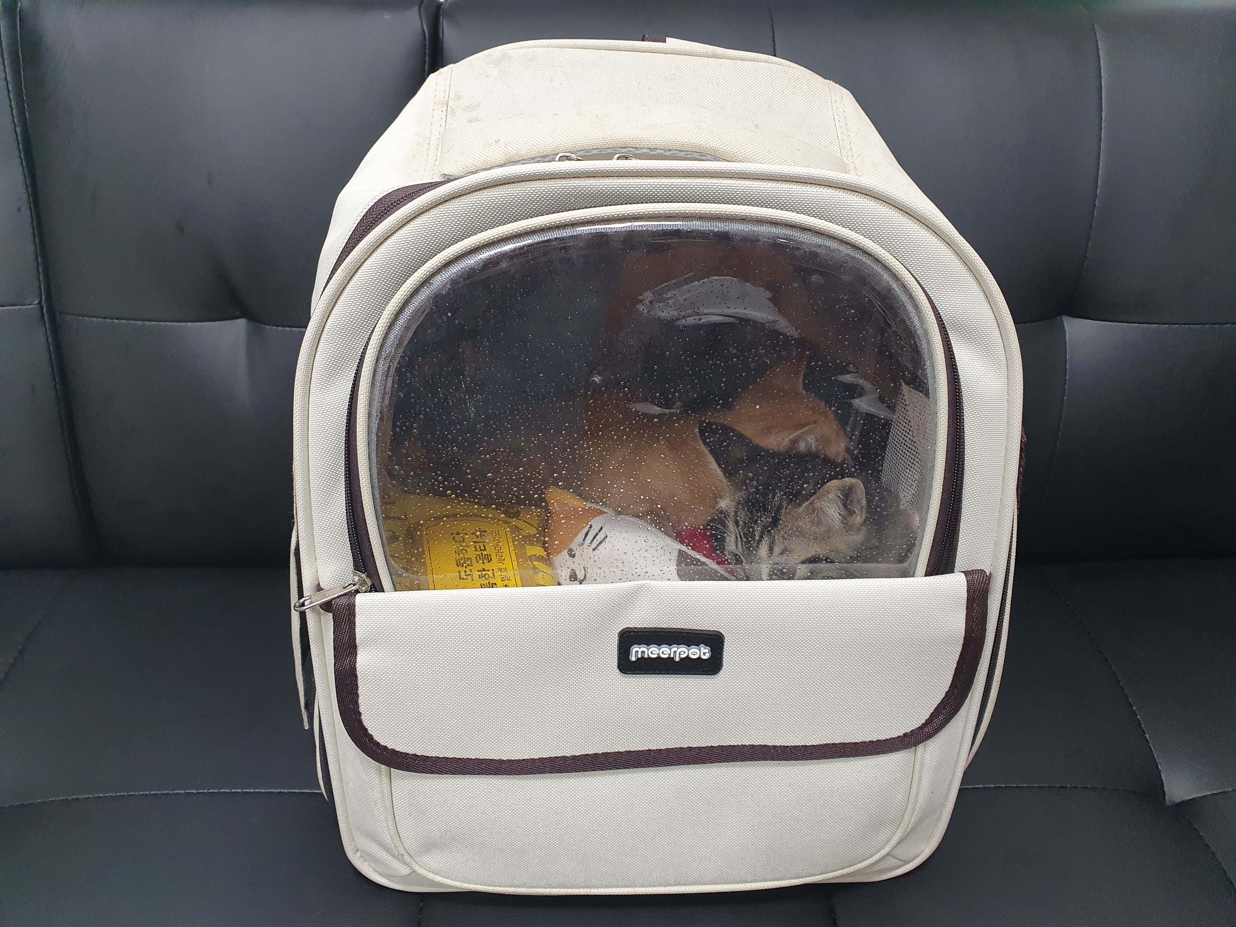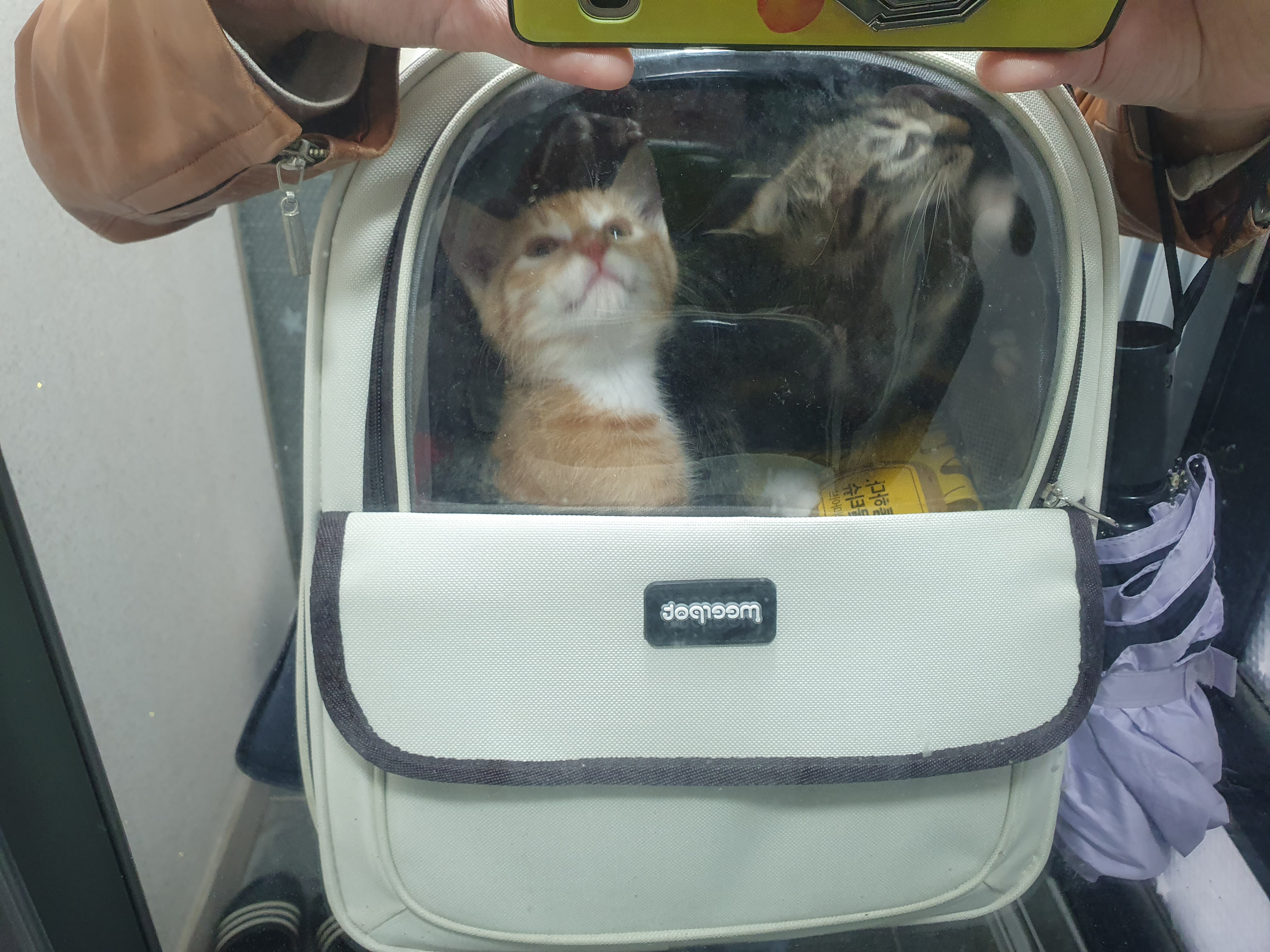오늘은 비가 오는 중이라 가방을 앞으로 맸습니다. 밖에 나가는 거는 처음이라서 그런지 병원가는 내내 송이는 '야옹야옹'거리네요. 평소에는 잘 울지 않는데도 말이죠.