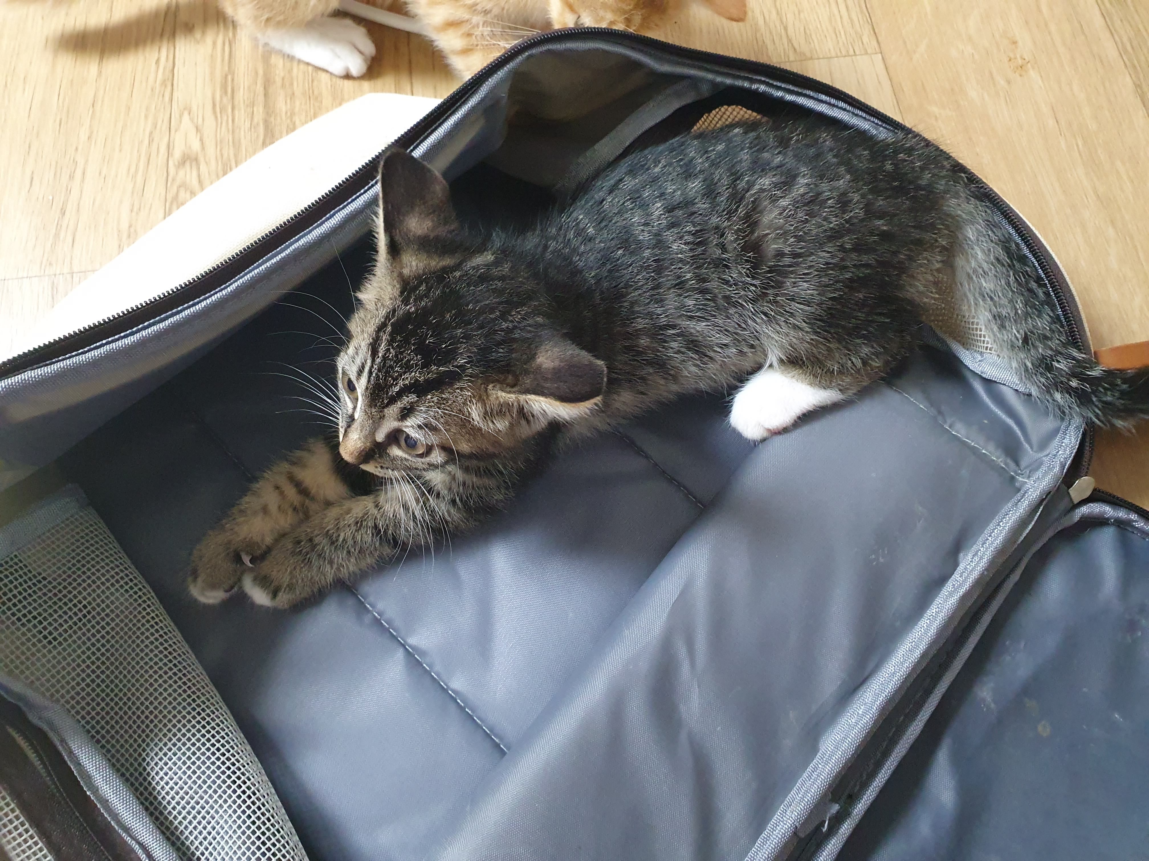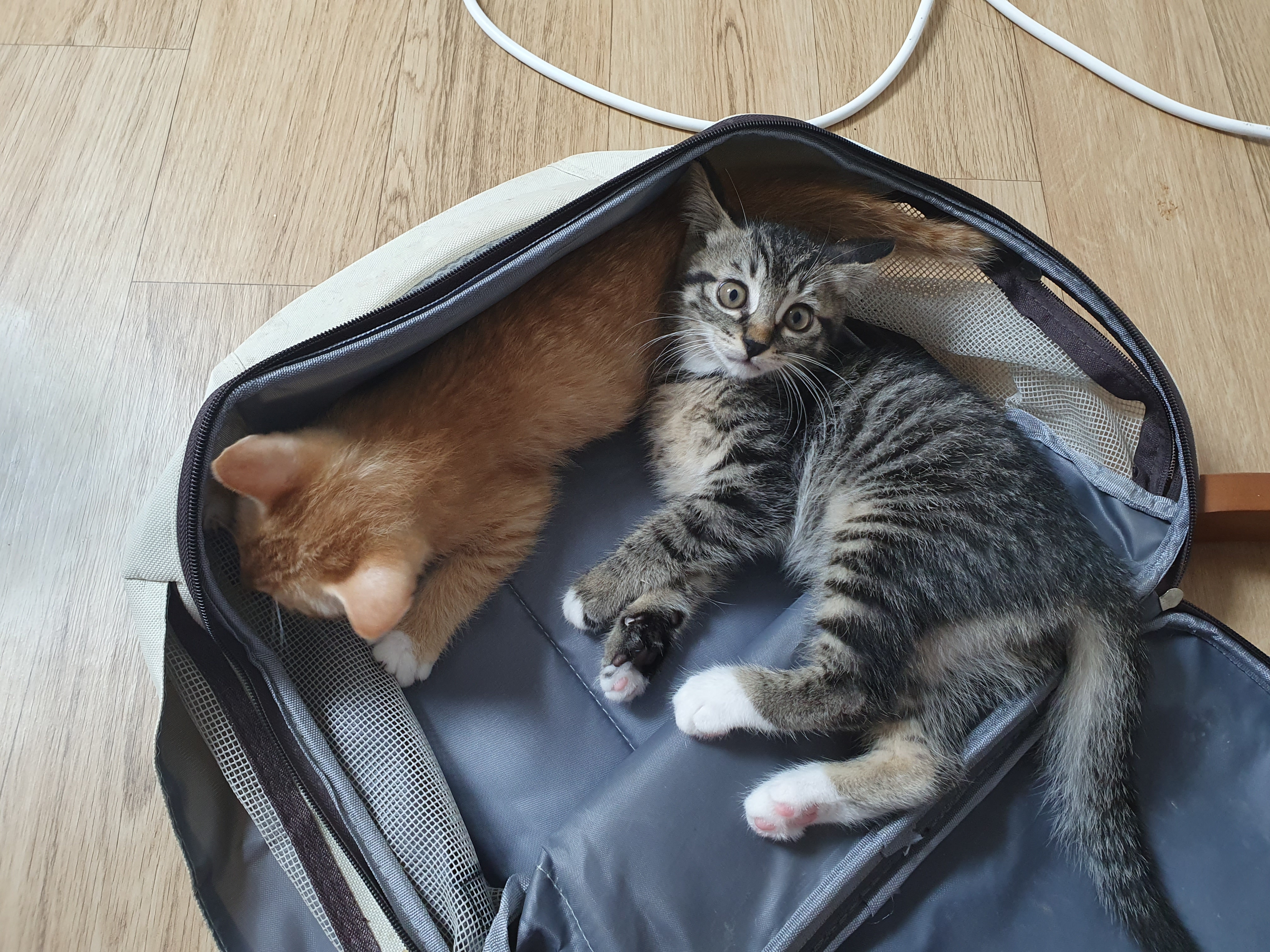 이동가방에서 미리 놀라고 이동가방을 바닥에 내려 놓았습니다. 역시나 새옹이와 송이는 가방을 좋아해서인지 가방 안에 쏘~옥 들어가 있네요.