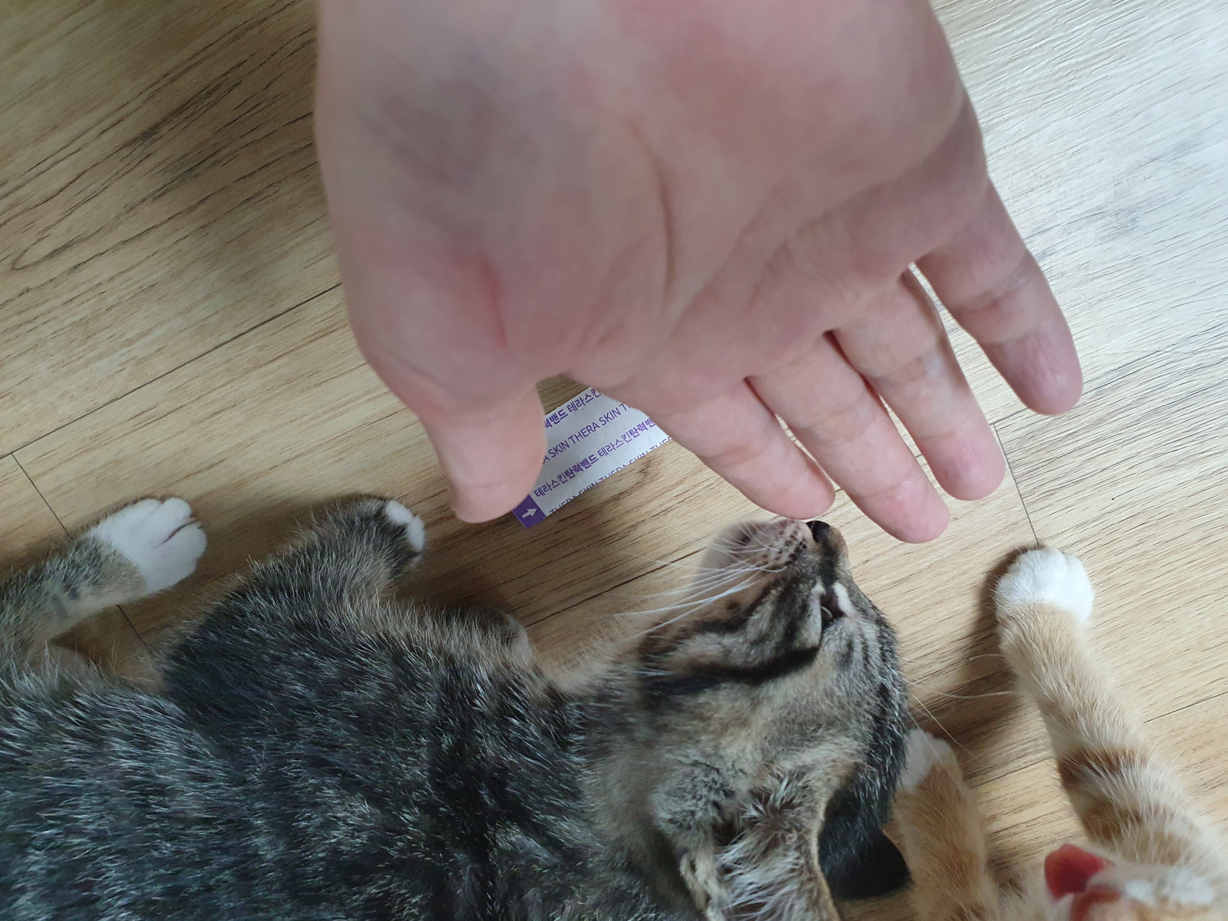 소독하고 후시딘을 발랐습니다. 밴드를 붙이고 있으니까 새옹이와 송이가 궁금해서 달려 옵니다.