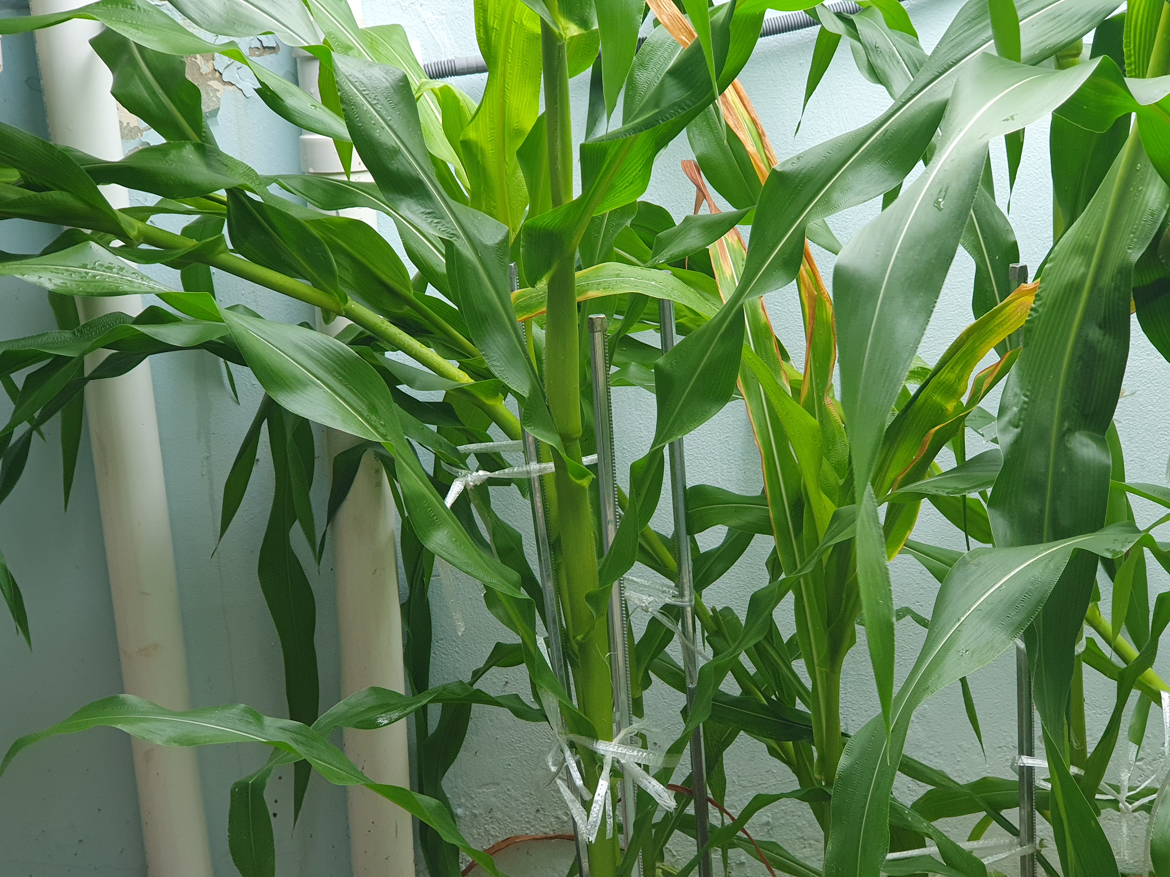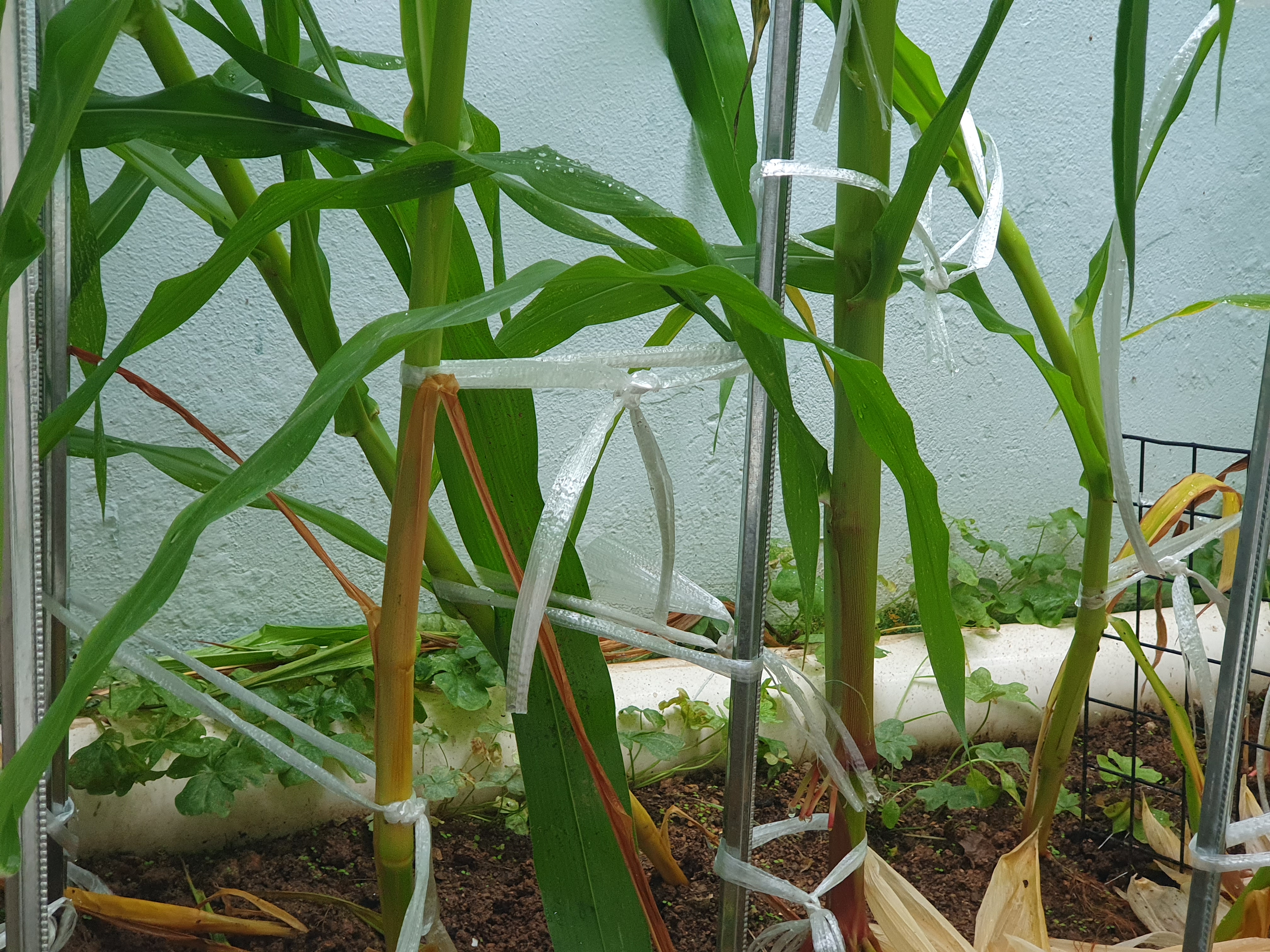 그런데 옥수수 2개가 쓰러져 있었습니다. 다행히도 전에 옥수수들을 서로 끈으로 묶어 놓아서 뿌리는 괜찮았습니다.