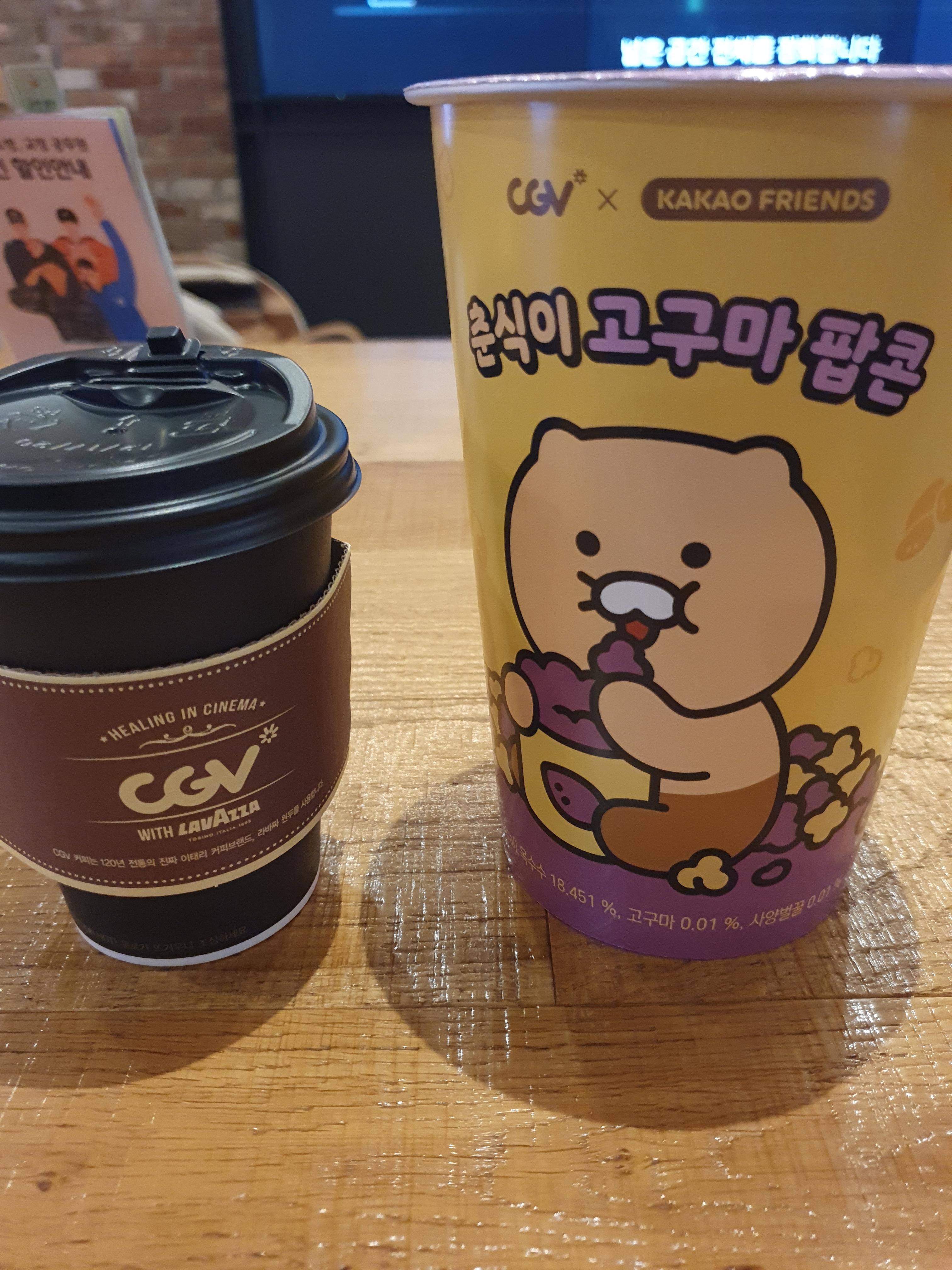 남편과 cgv 영화관에서 '30일'영화를 보았습니다. 남편과 영화관 갈 때마다 팝콘을 먹는 편인데 이번에는 춘식이 고구마 팝콘이 새로 나와서 이걸 먹었습니다. 보라색과 노란색 팝콘이 고구마의 단맛을 잘 느끼게 해주네요. 아메리카노랑 같이 먹으면 단맛을 조금 잡아줘서 더 좋은 거 같습니다.