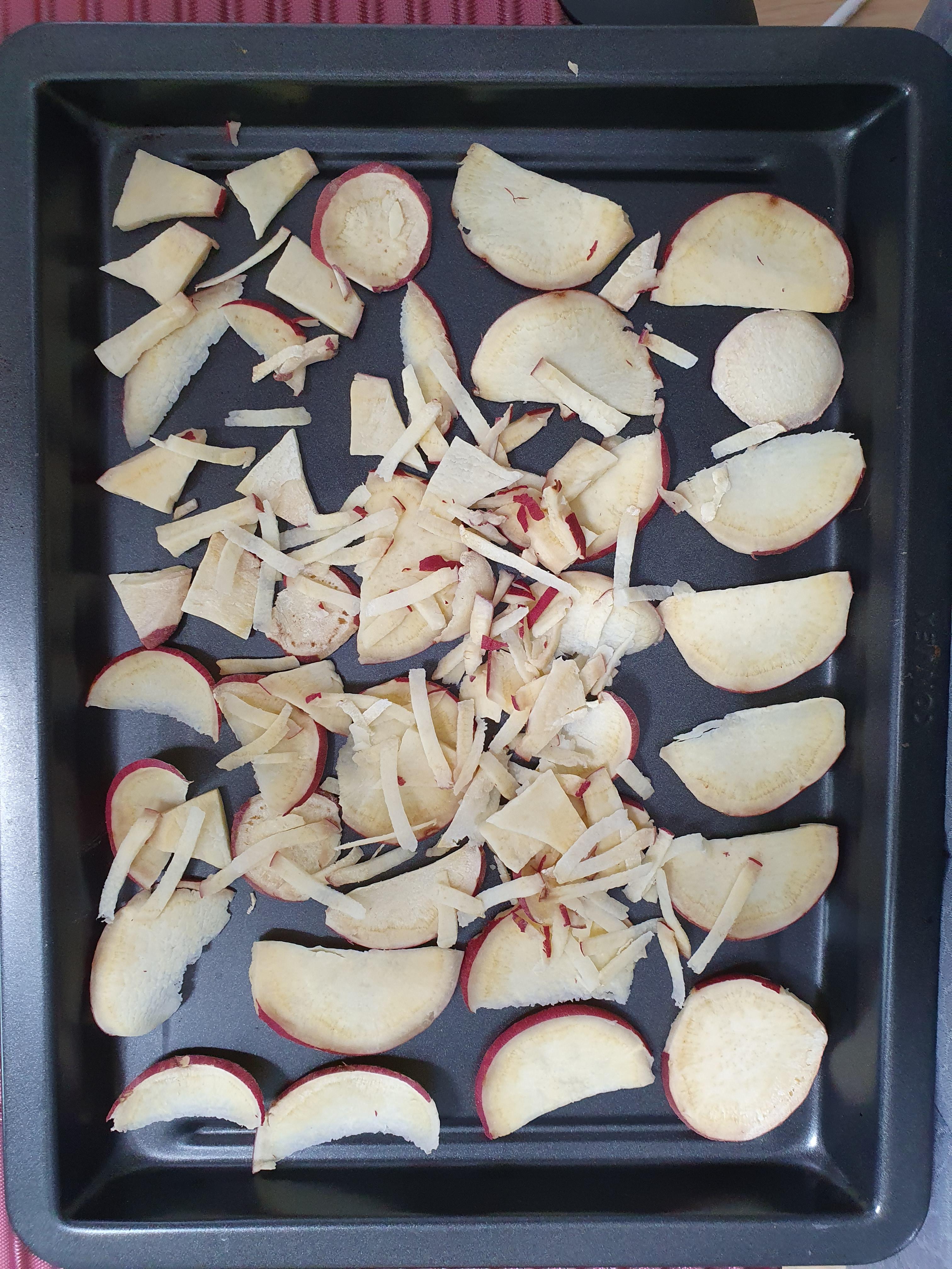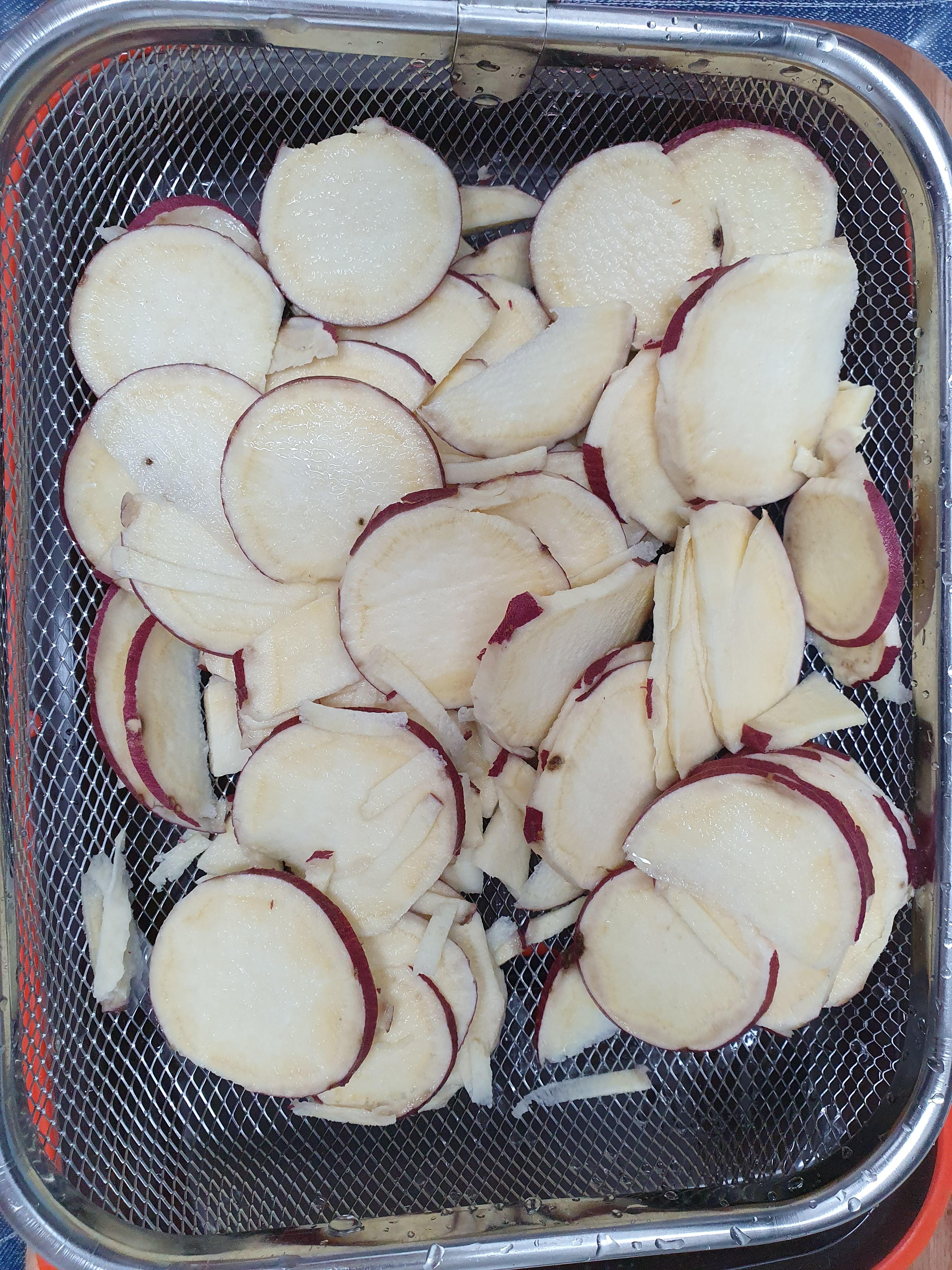 채칼로 고구마스틱을 만들다 너무 얇게 썬 고구마도 같이 넣어 줍니다.