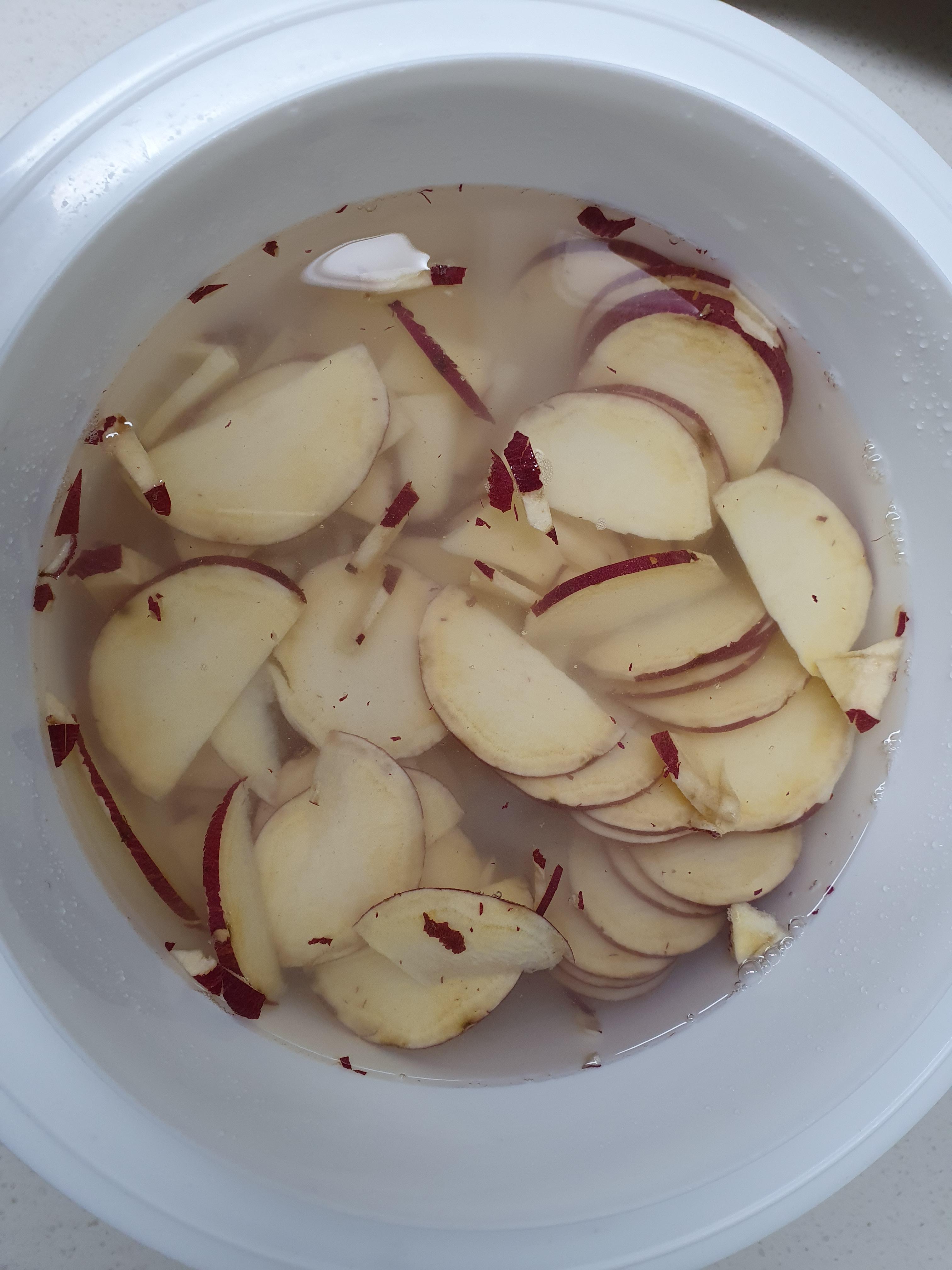 고구마는 한 개만 씻어서 0.5센치보다 작게 썰어줍니다. 전분을 빼기 위해서 10분 정도 물에 담가 놓습니다.
