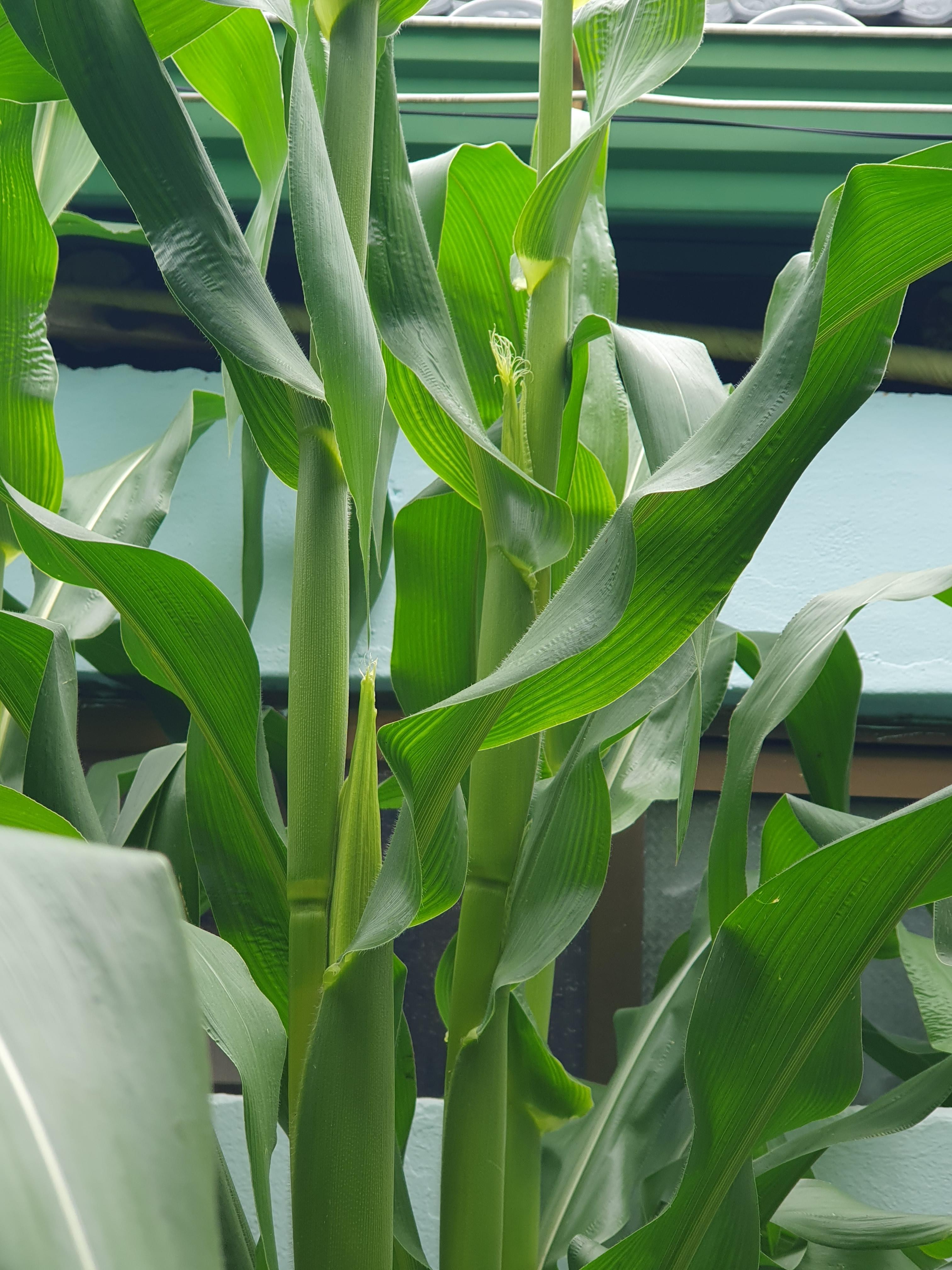 옥수수를 심은 지, 49일만에 옥수수가 열리기 시작했습니다. 옥수수 한 개에, 열매 한 개씩 열리고 있습니다.