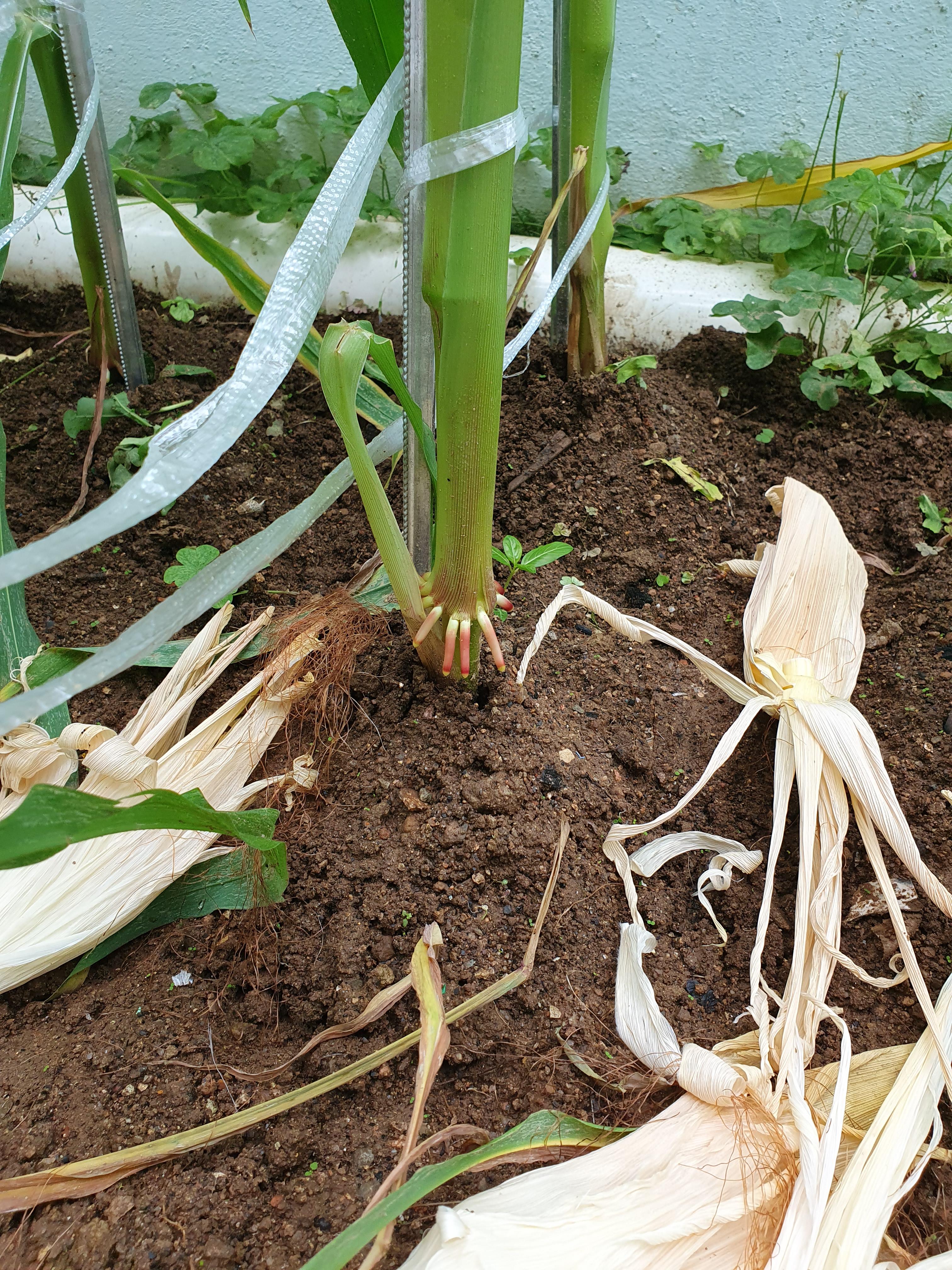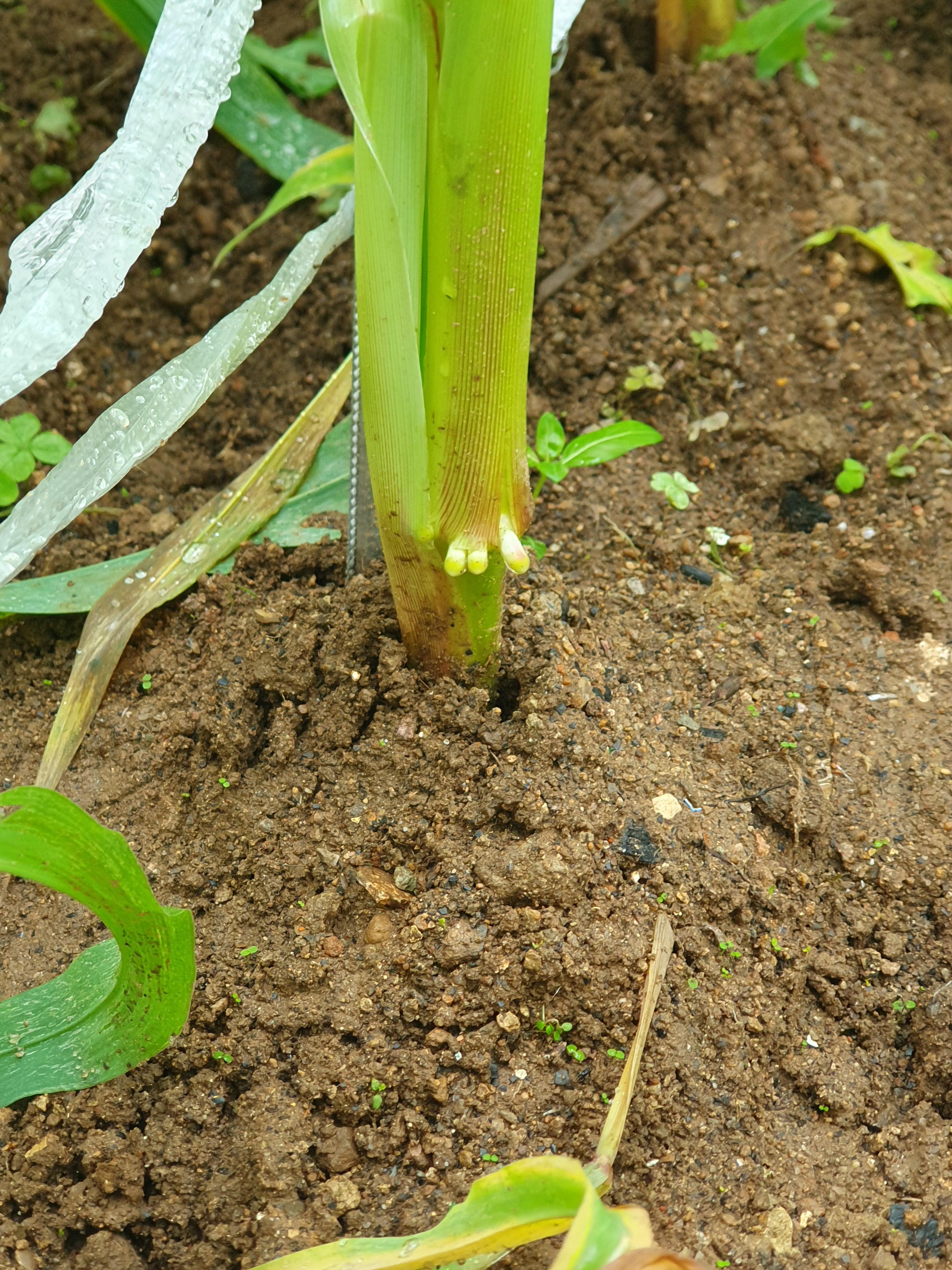 이런 뿌리를 '받침뿌리'라고 합니다. 옥수수가 넘어지지 않게 지탱해 주는 기능을 한다고 합니다.