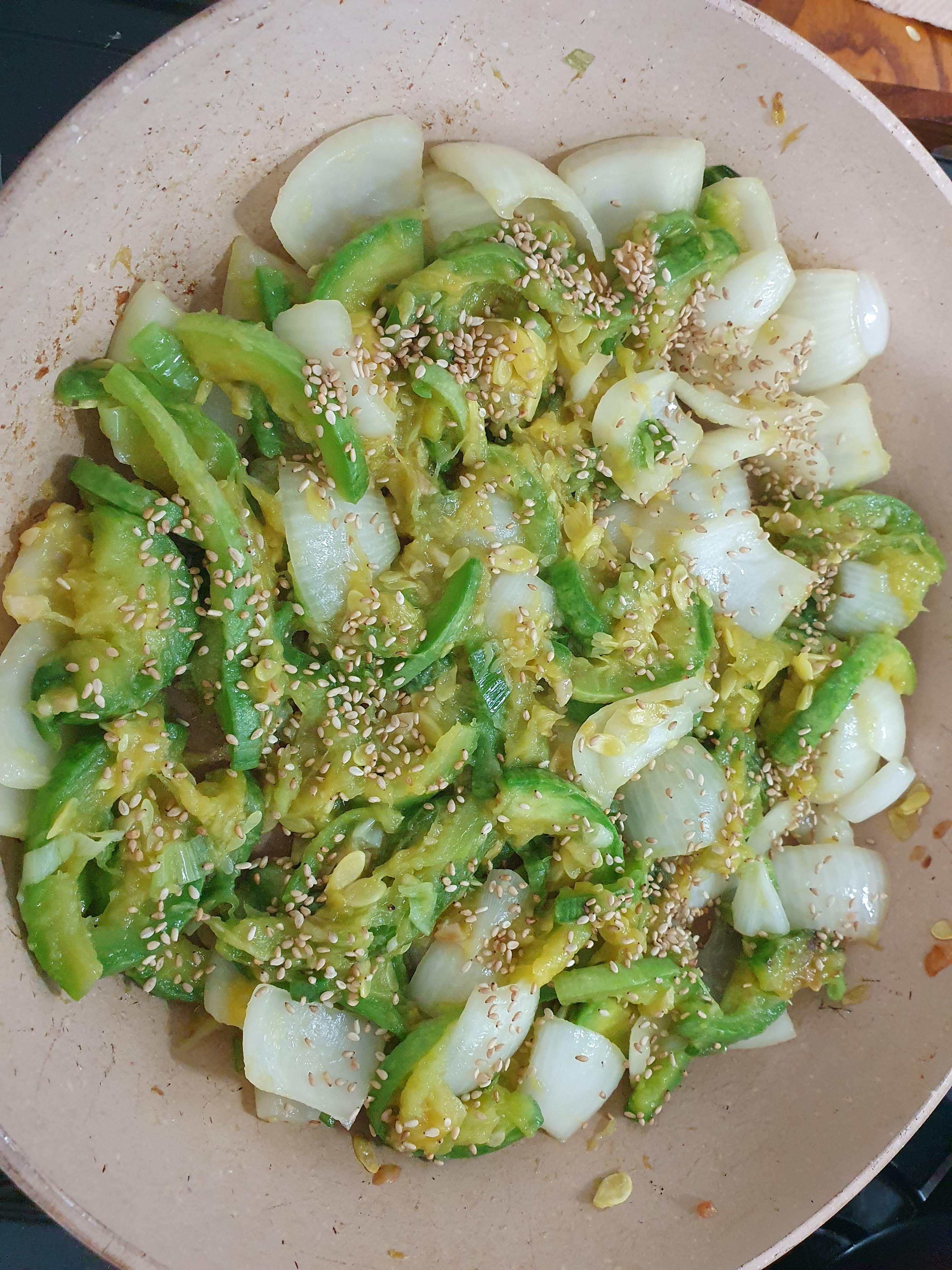 볶아주면서 올리브유가 거의 다 호박에 스며들면 참치액을 넣으면서 볶아 줍니다. 그 사이 썰어 놓은 파도 넣어 주구요.