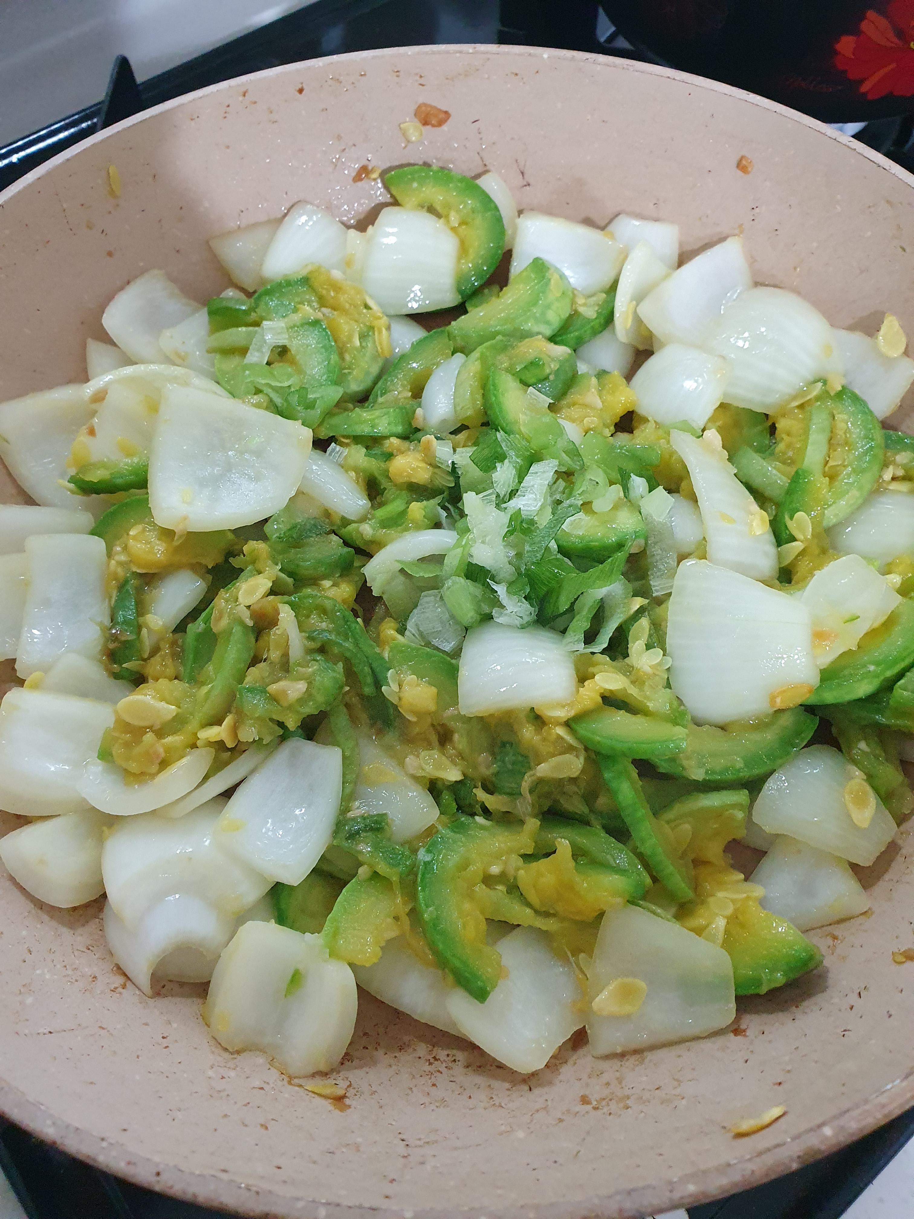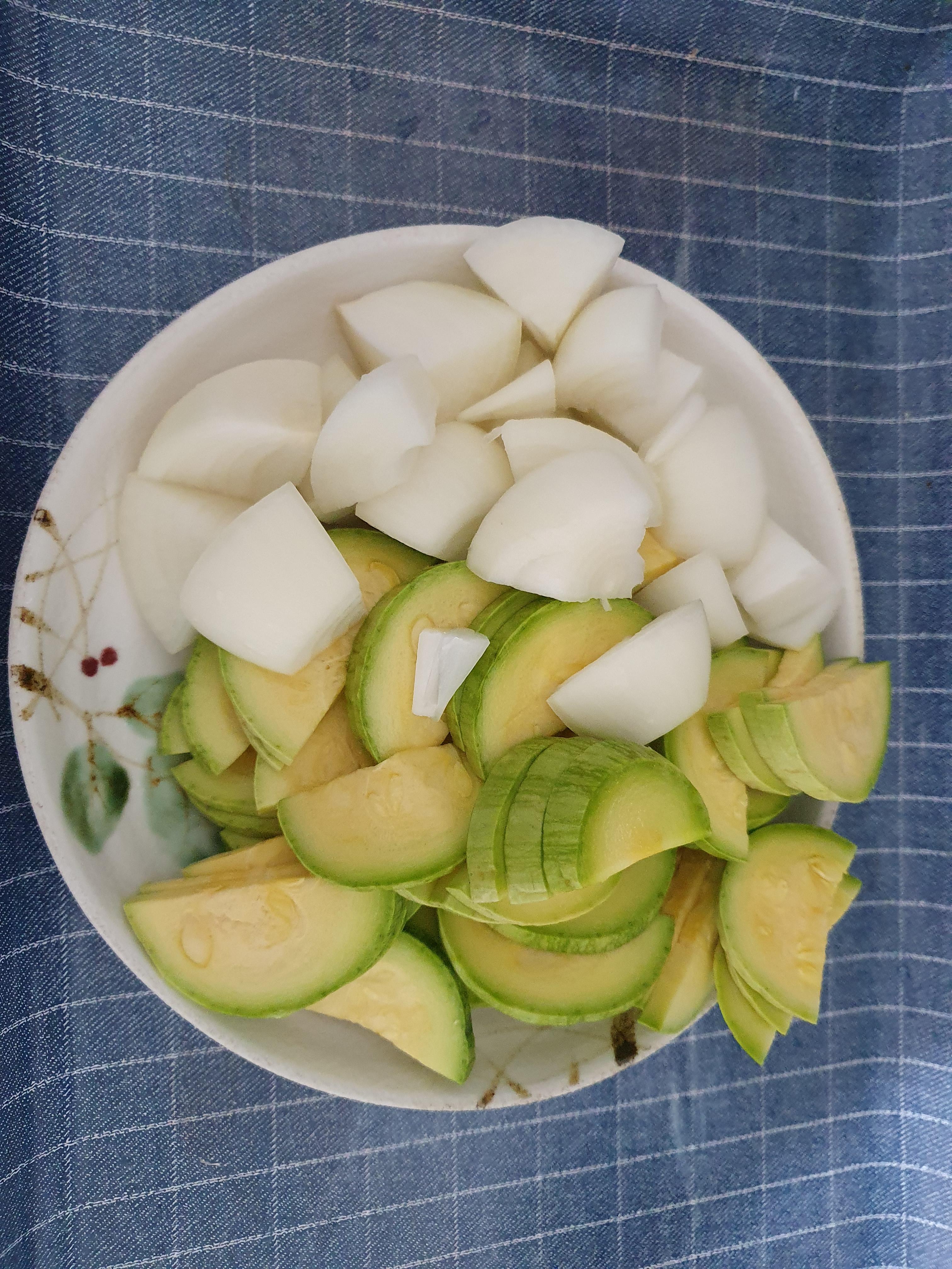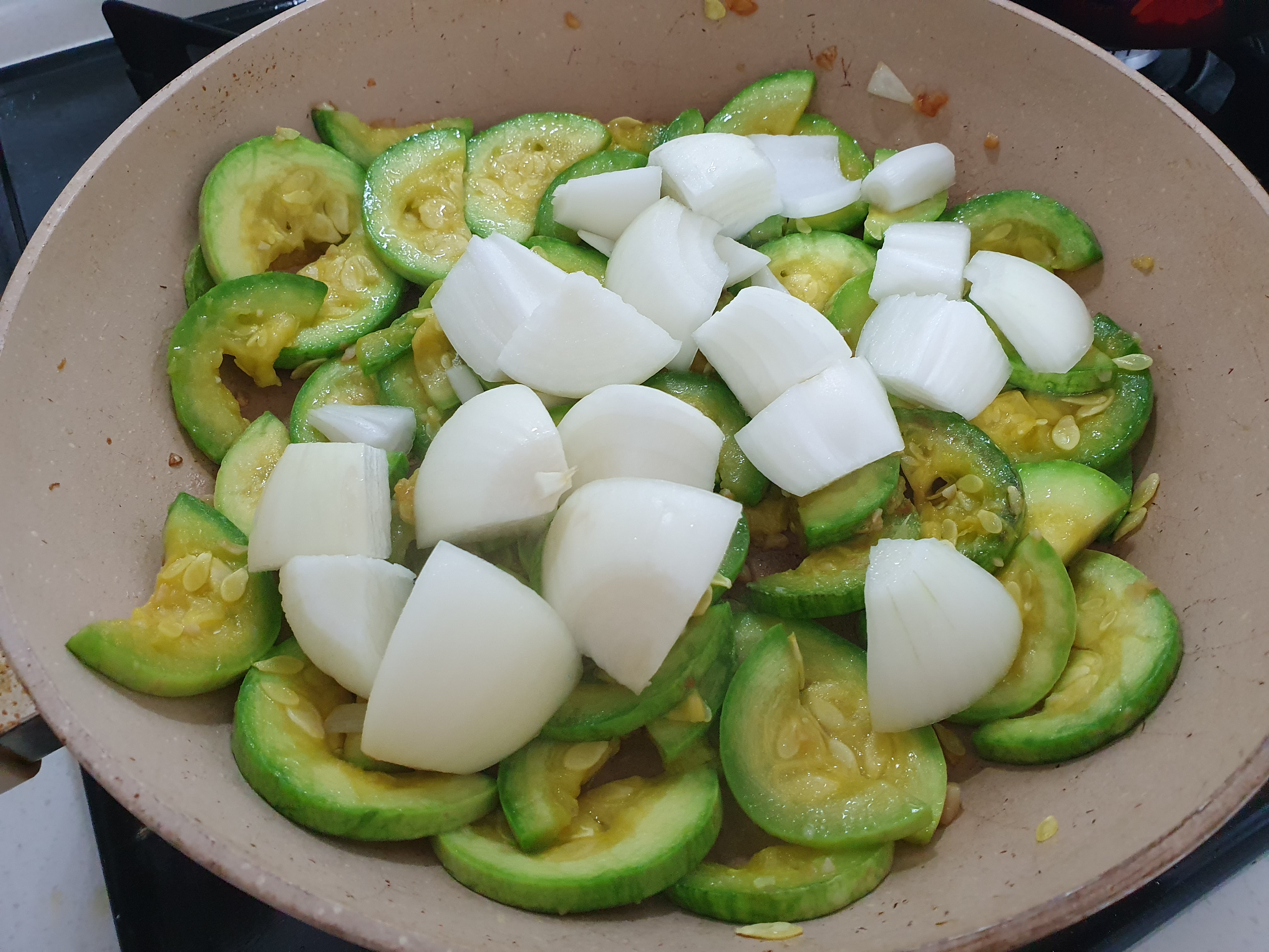 먼저 호박과 양파를 반달썰기로 썰어 놓습니다.