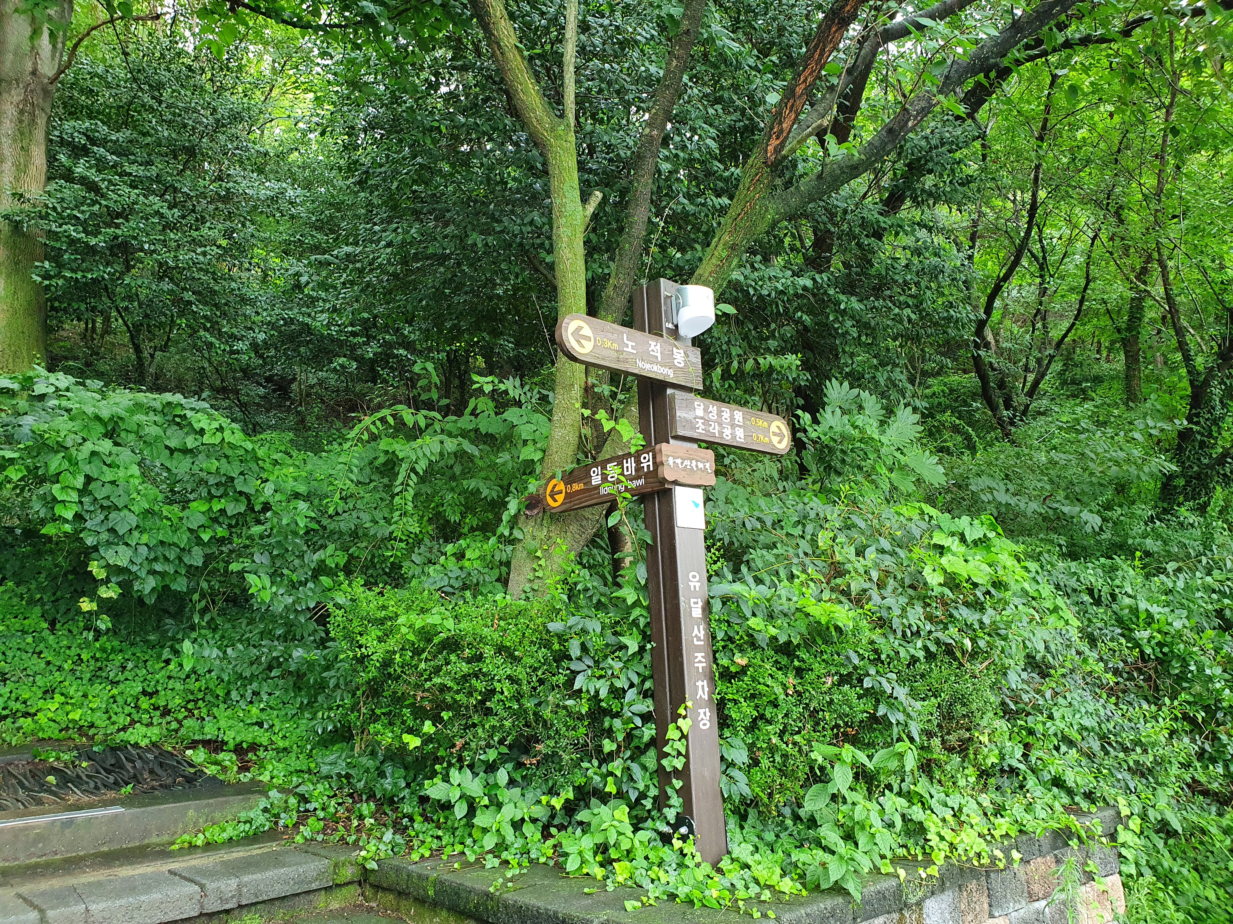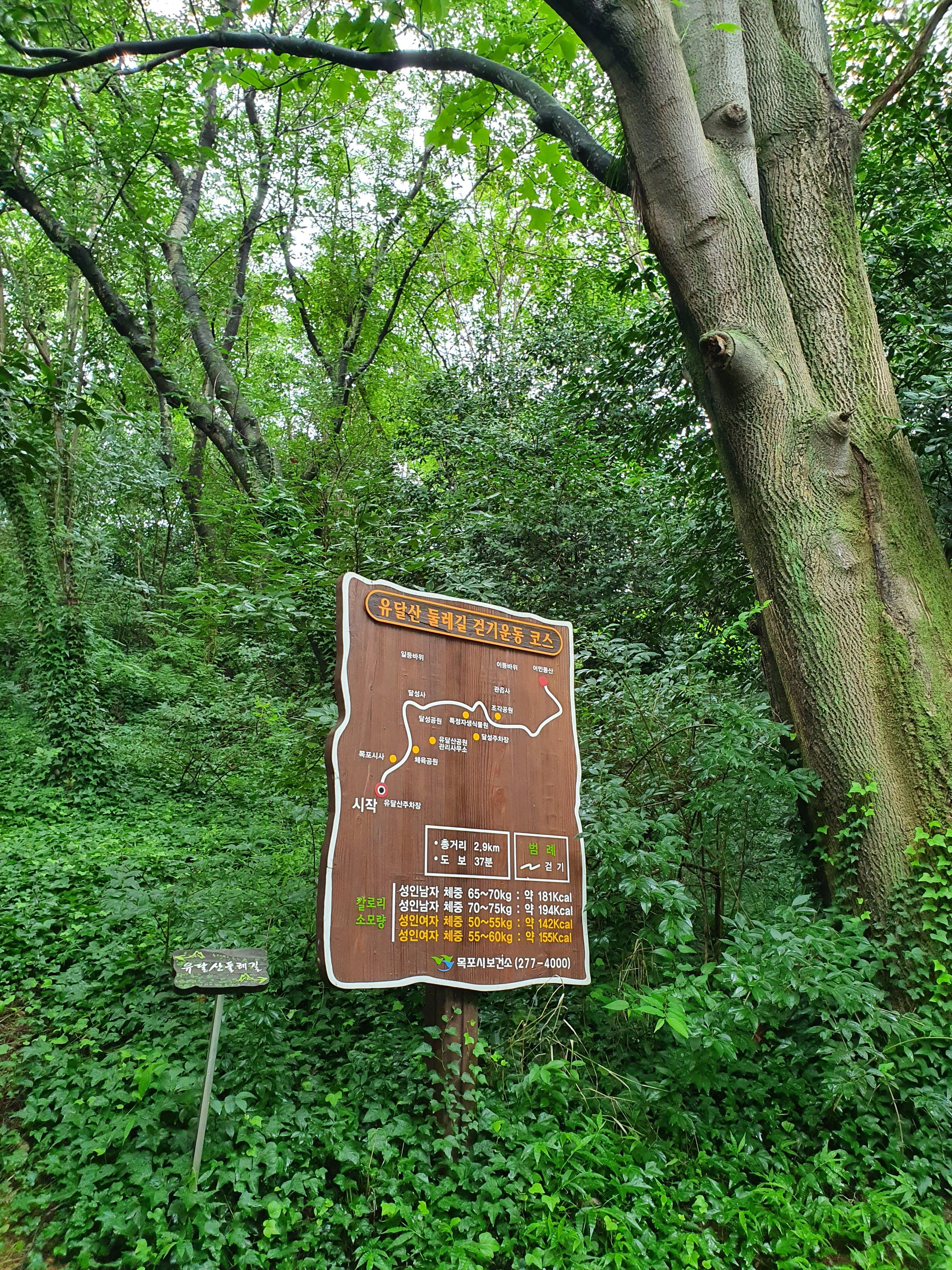 차를 세우고 무료주차장에서 나와서 우측으로 보면 위 사진처럼 '유달산장 가는 길, 옆에 88계단 이용하세요'라는 현수막이 붙어 있습니다. 둘레길 비슷하게 나무계단이 있습니다. 직접 가면세 세어 봤는데 정말로 88계단이더라구요.