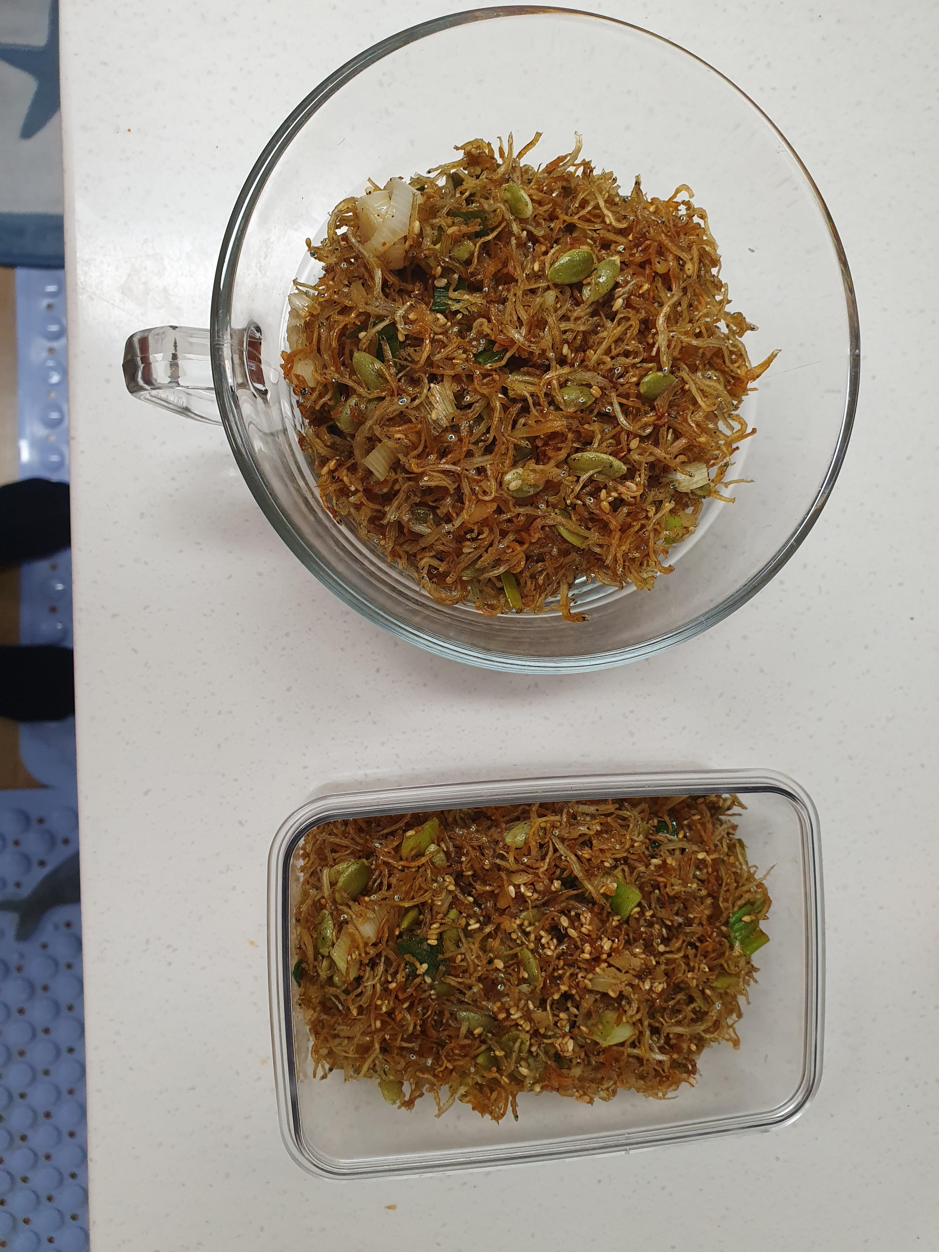 잔멸치에 호박씨를 넣고, 나머지는 일반 멸치볶음과 비슷한 재료를 썼습니다. 그리고 설탕 대신 매실액만 썼구요.