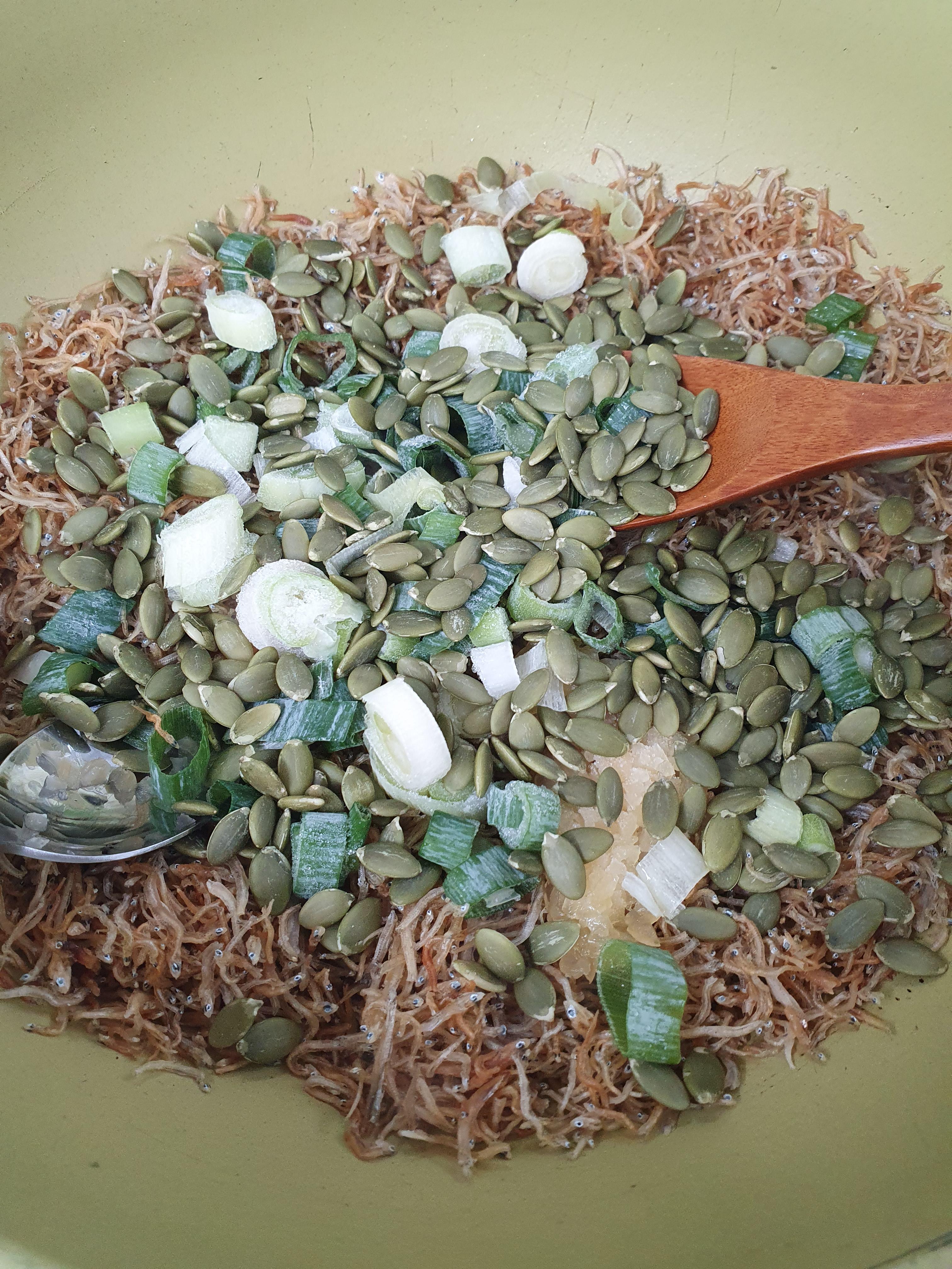 여기에 호박씨, 파, 마늘 다진 걸 넣어 주고, 또 볶아 줍니다.