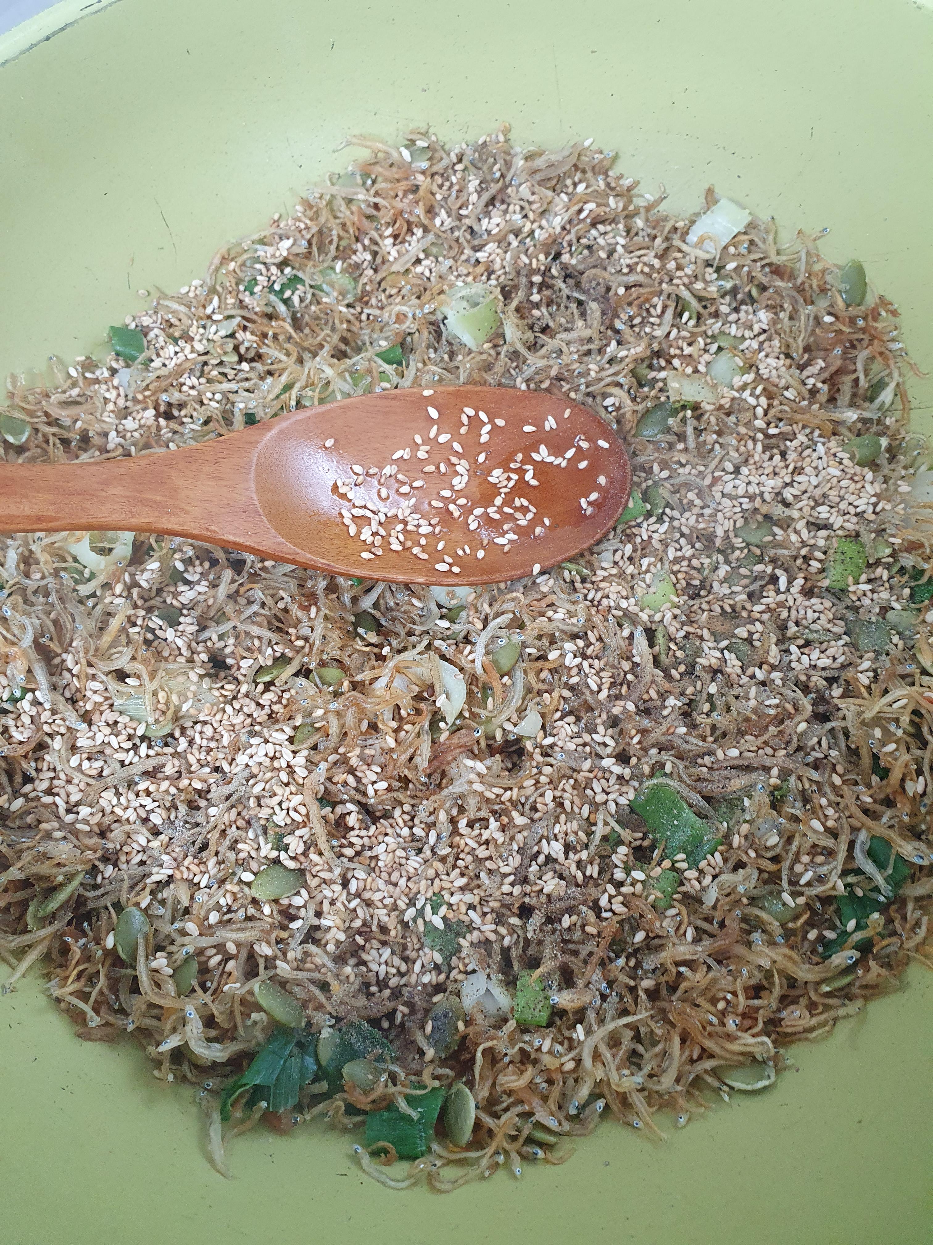 마지막으로 깨와 나머지 양념을 넣고 볶아 주면 됩니다.