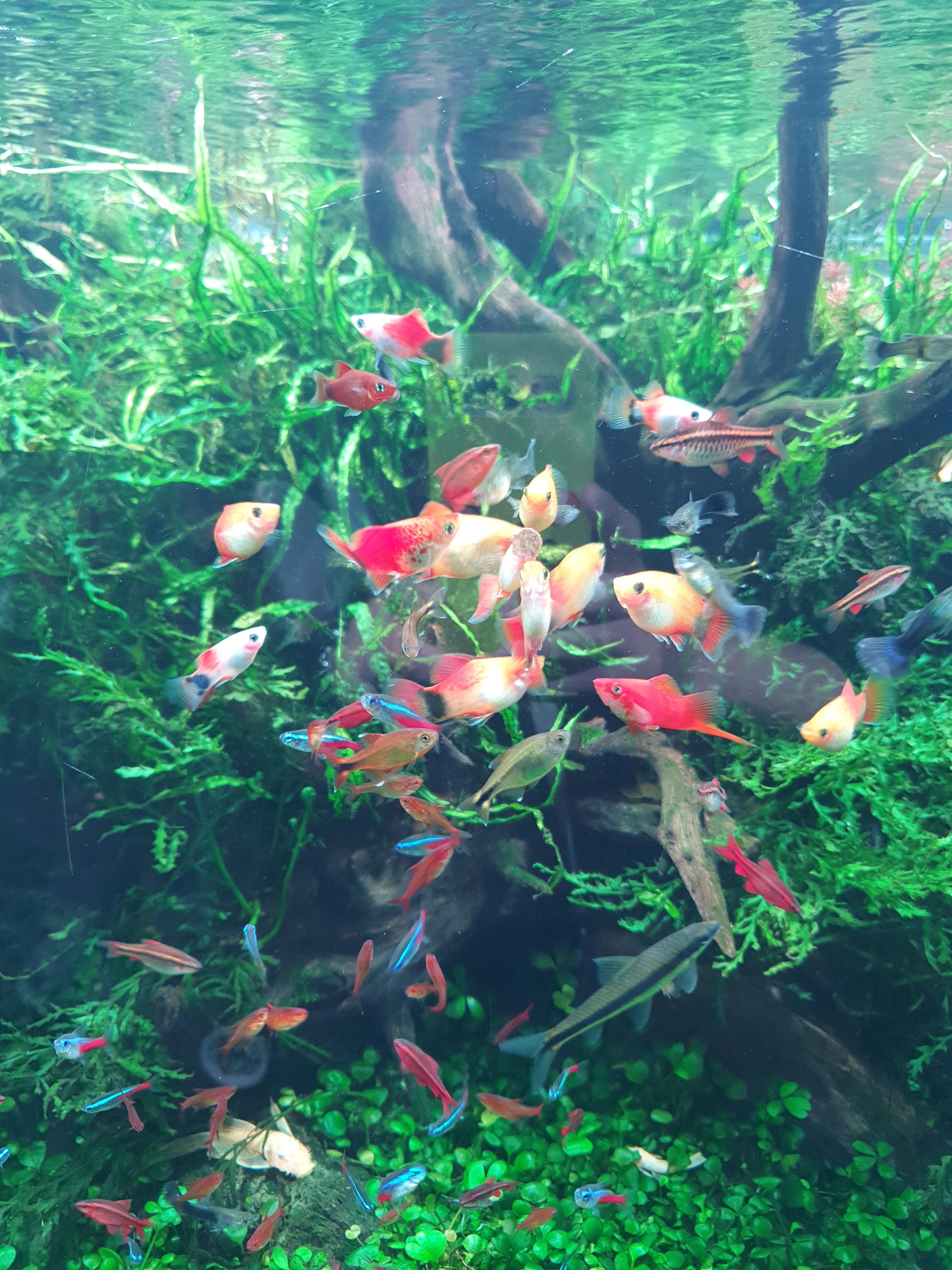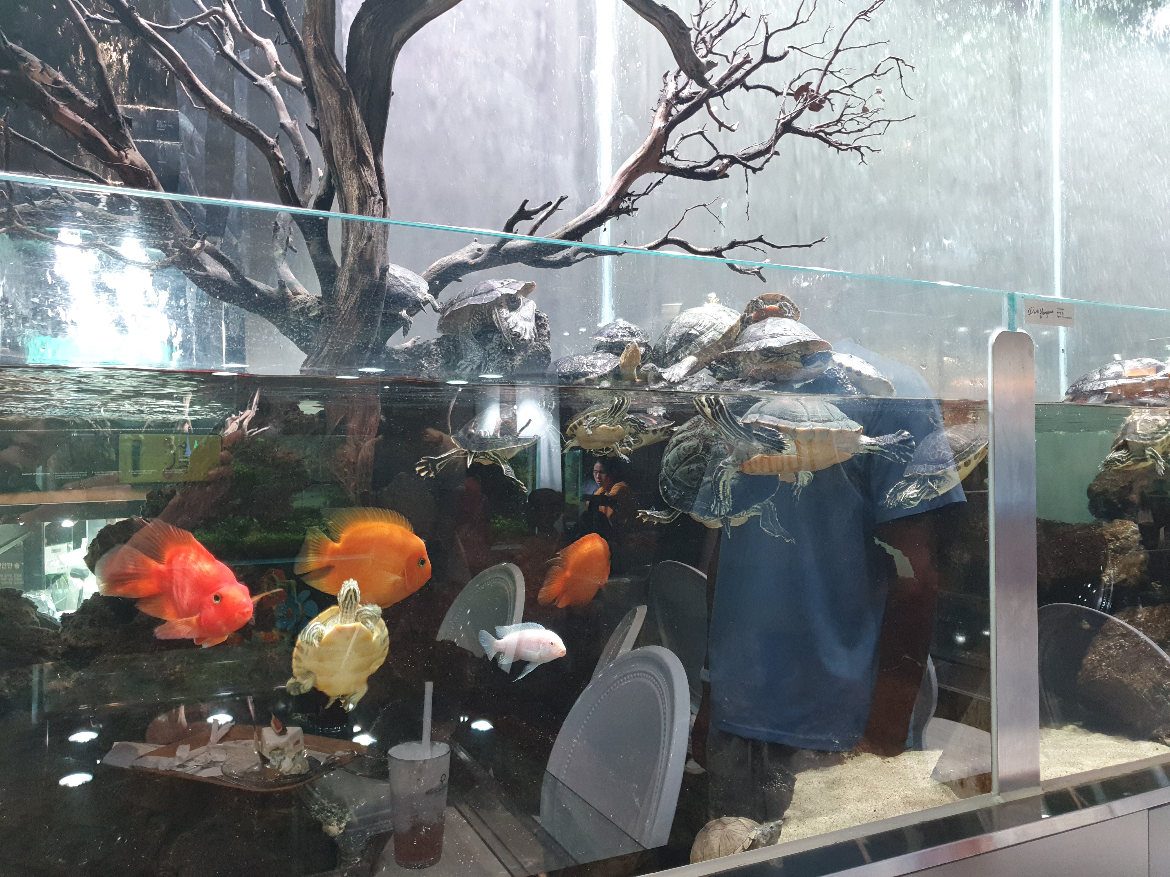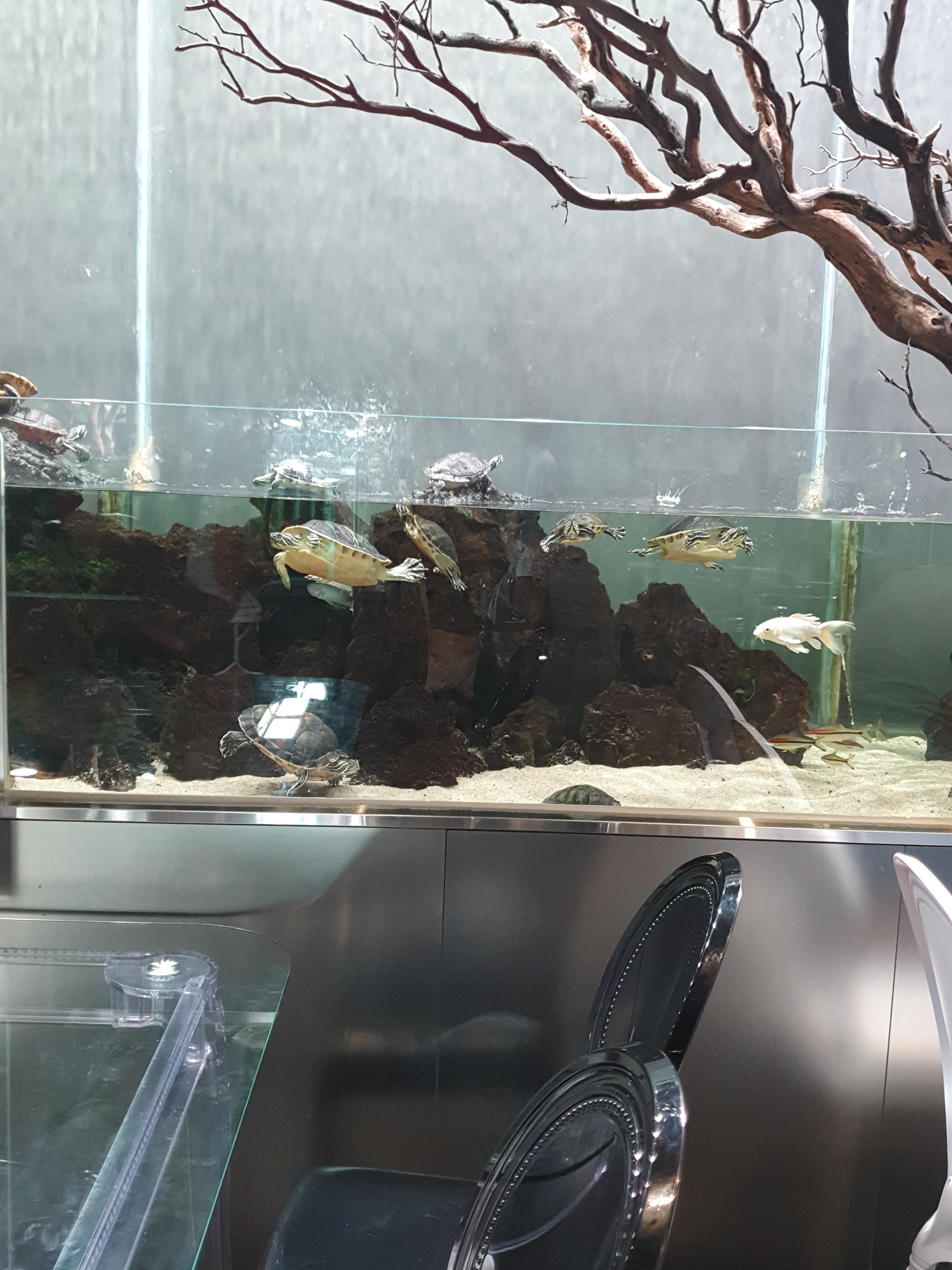 큰 수족관 앞에서 물고기를 보며 커피를 마시면 더 시원한 느낌이 드는 거 같습니다.