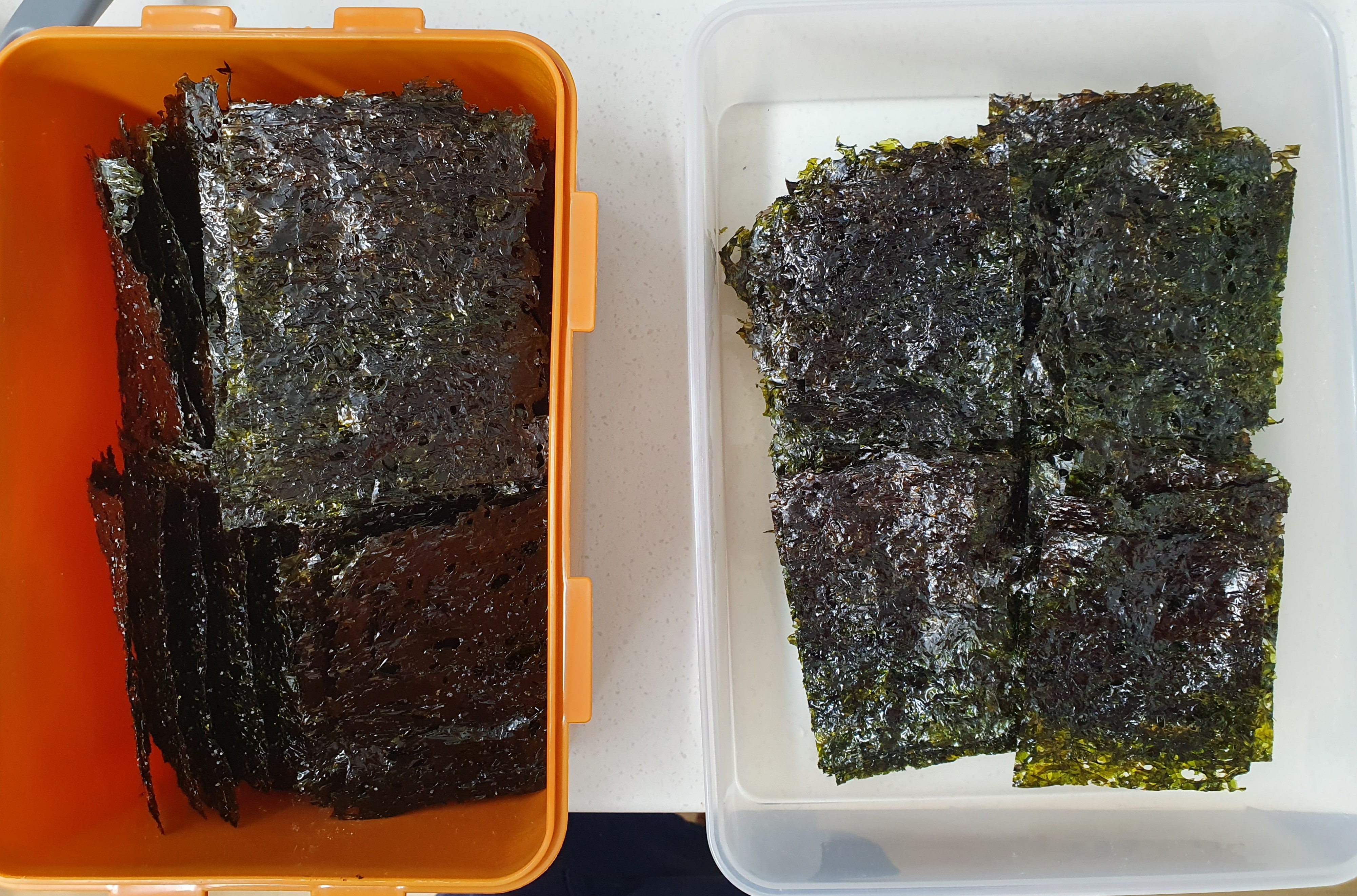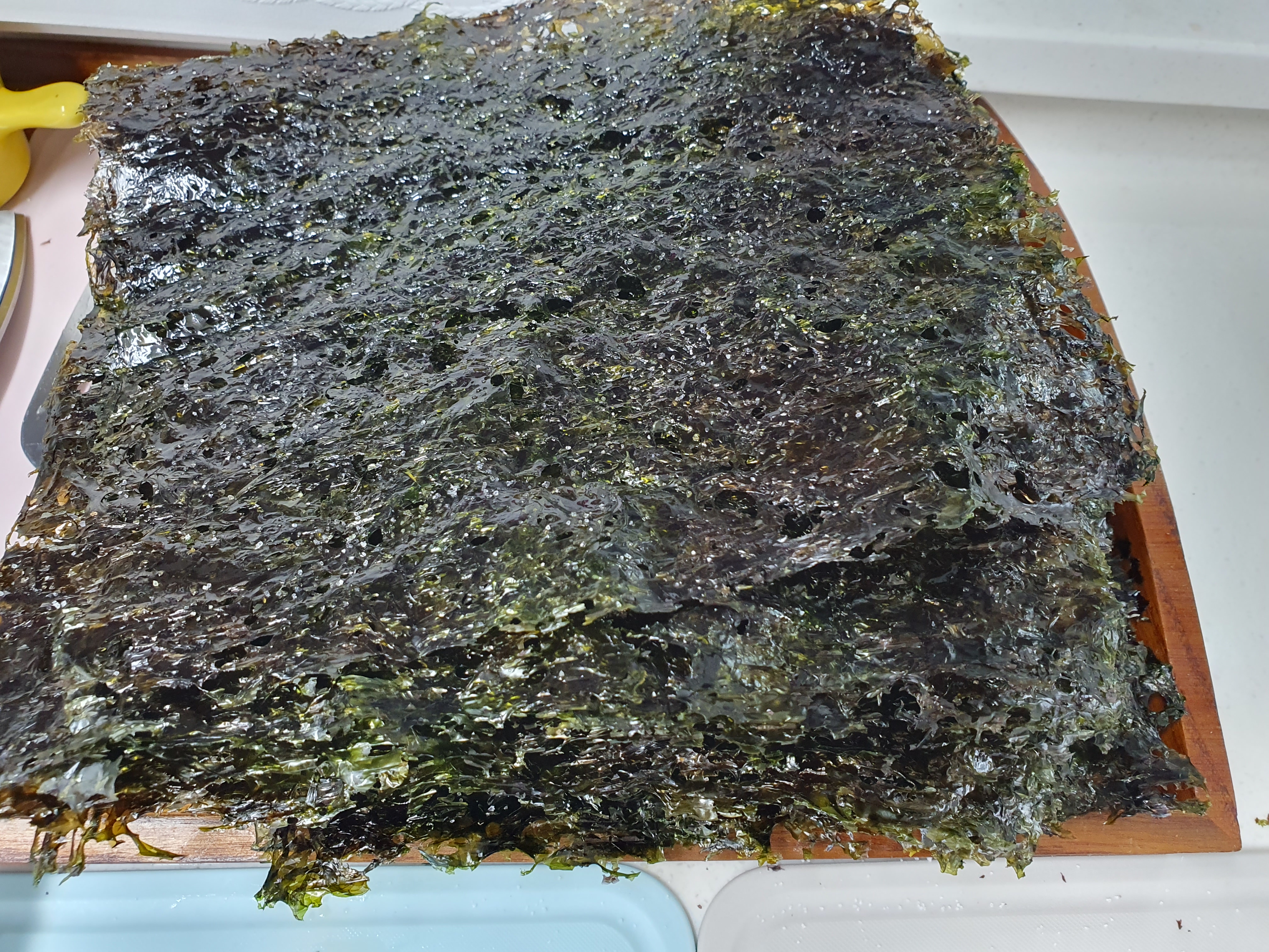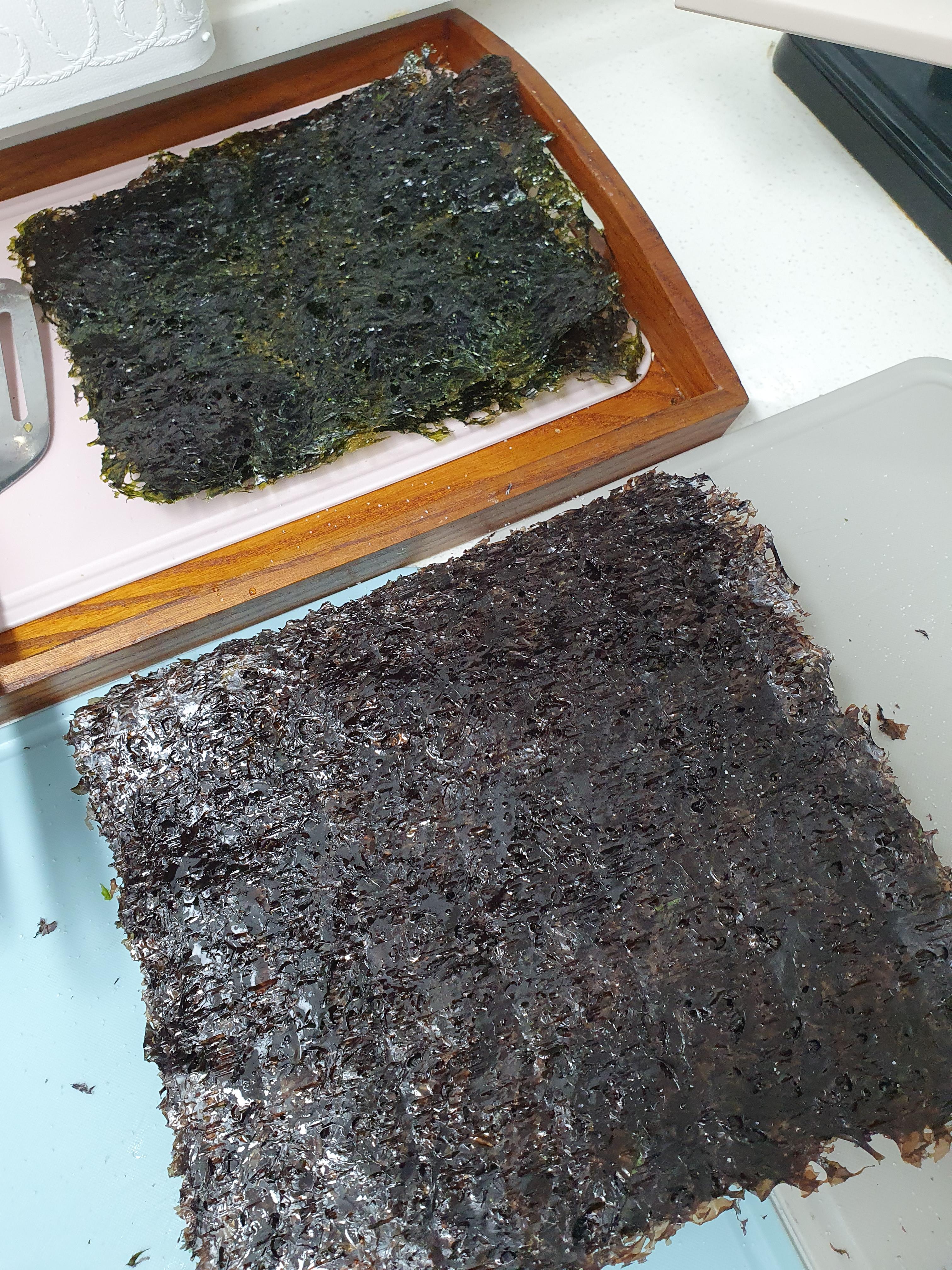 구운 김은 뜨겁기 때문에 비닐 장갑을 두 겹이나 꼈습니다.