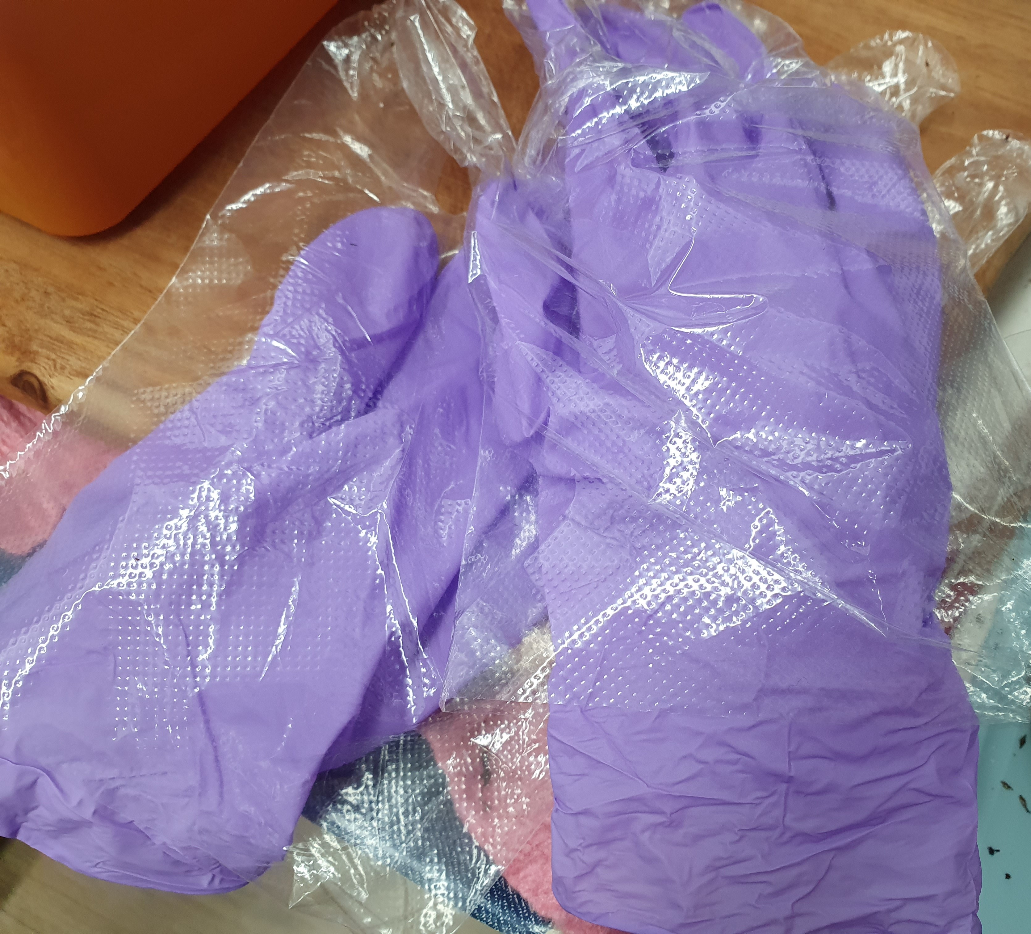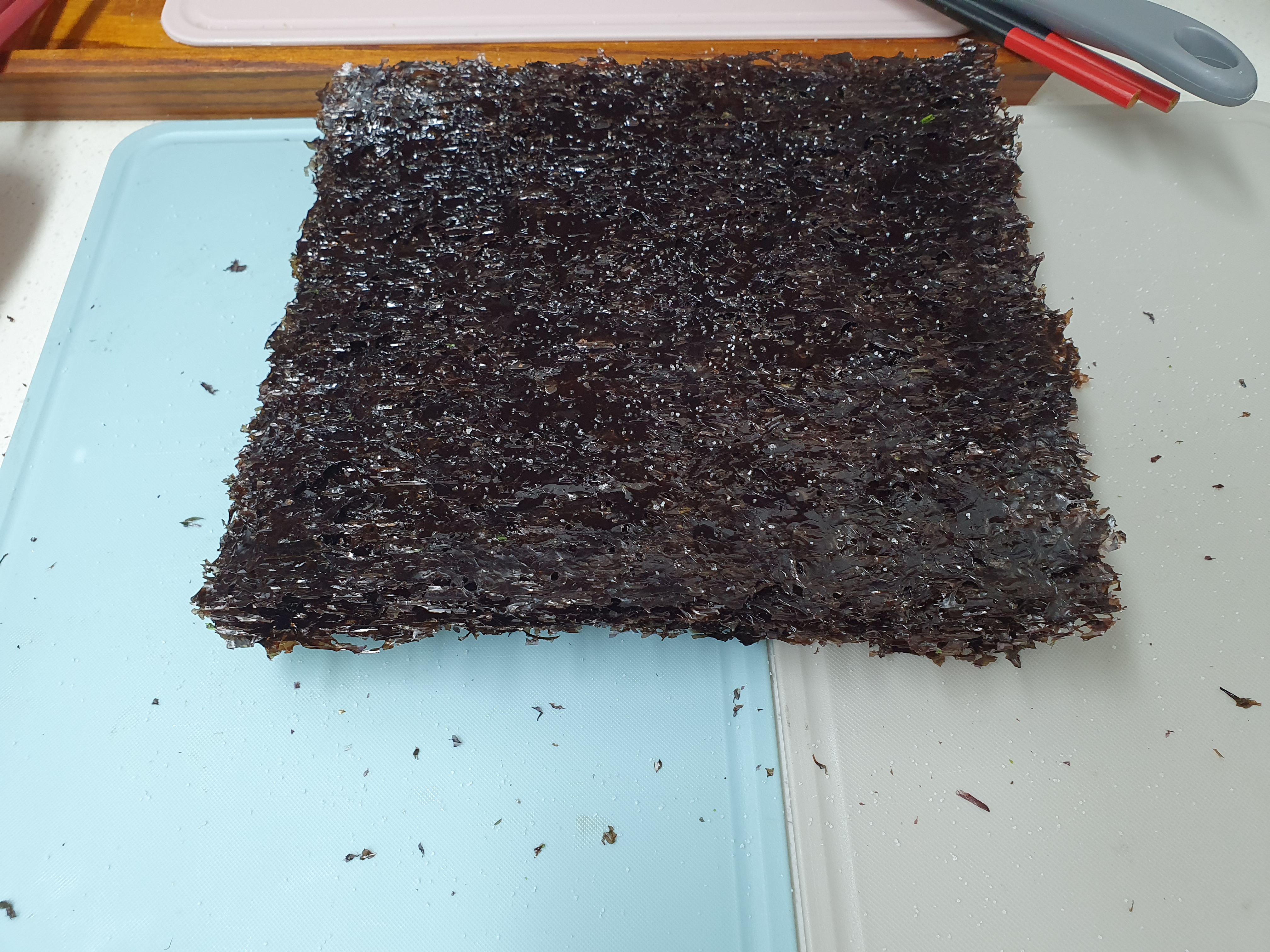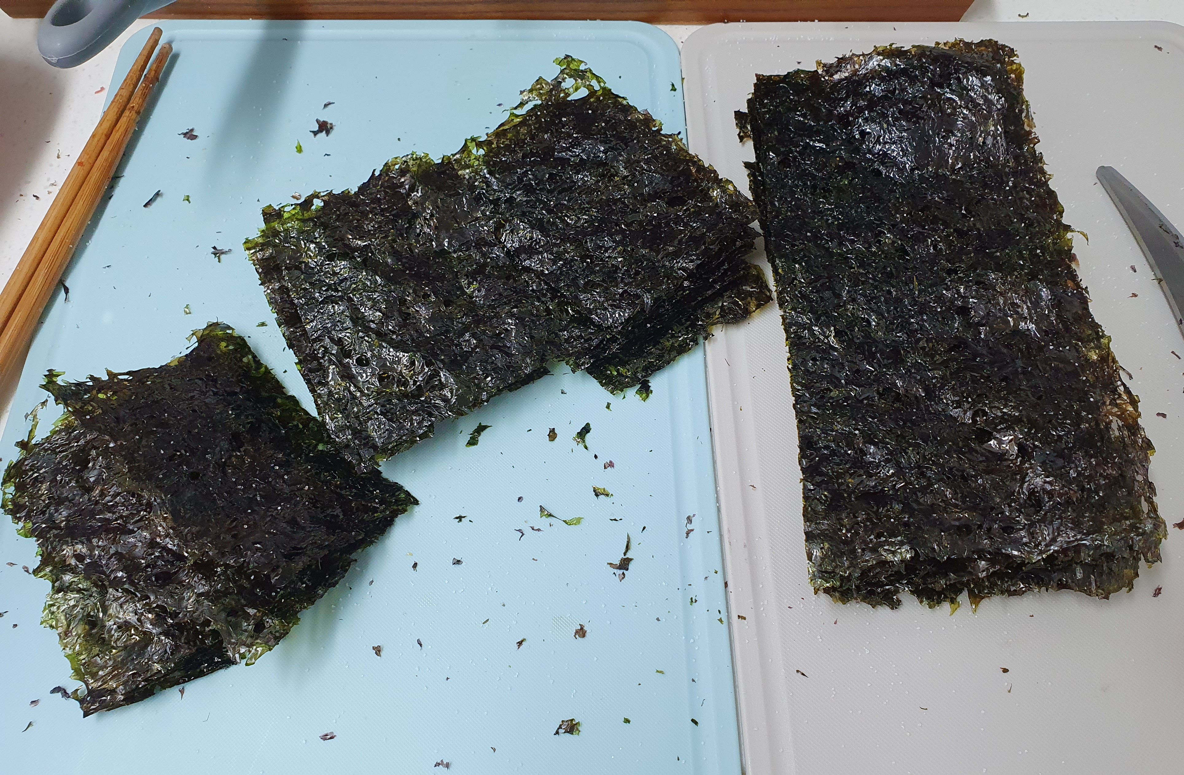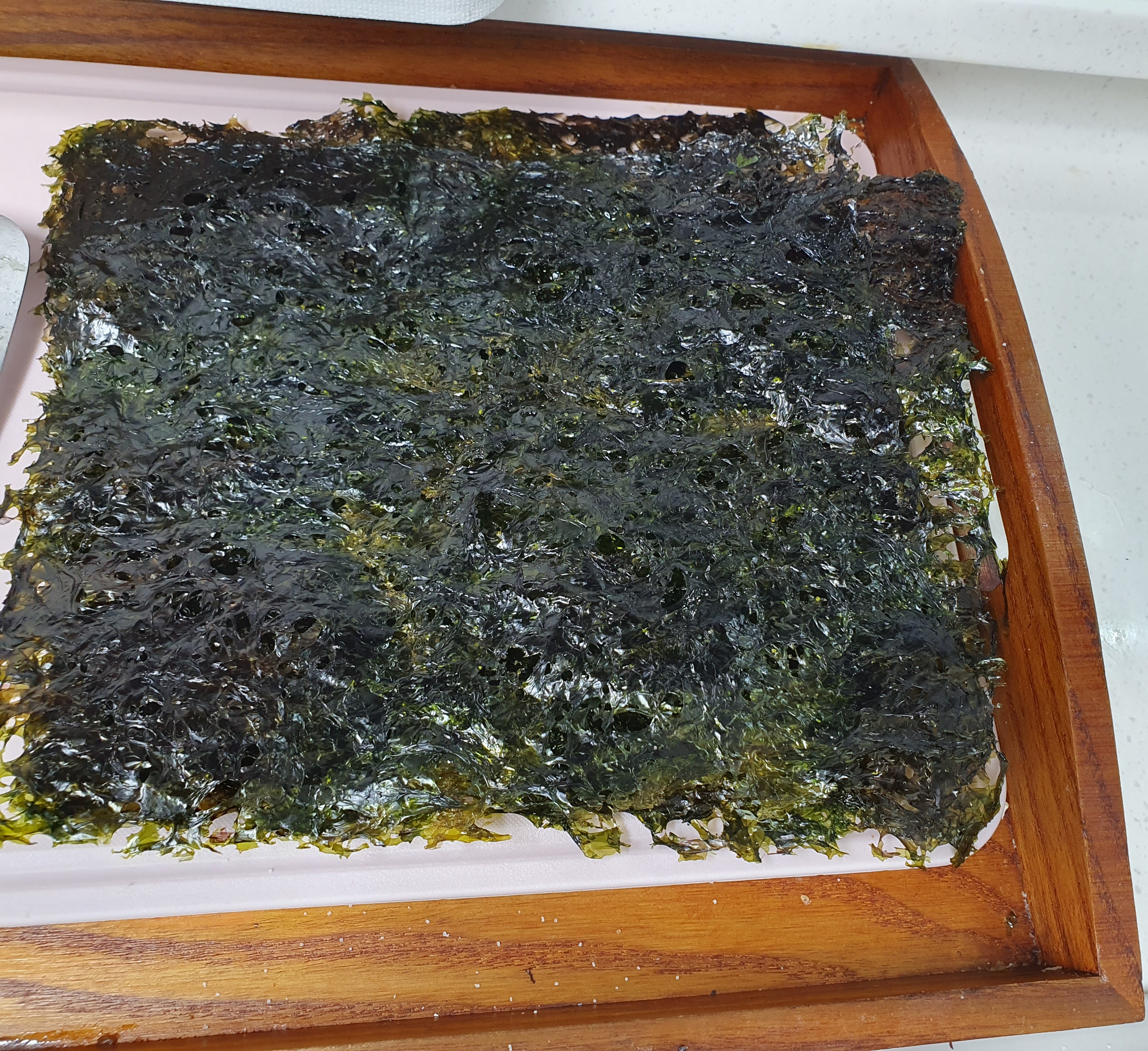 구운 김은 뜨겁기 때문에 비닐 장갑을 두 겹이나 꼈습니다.