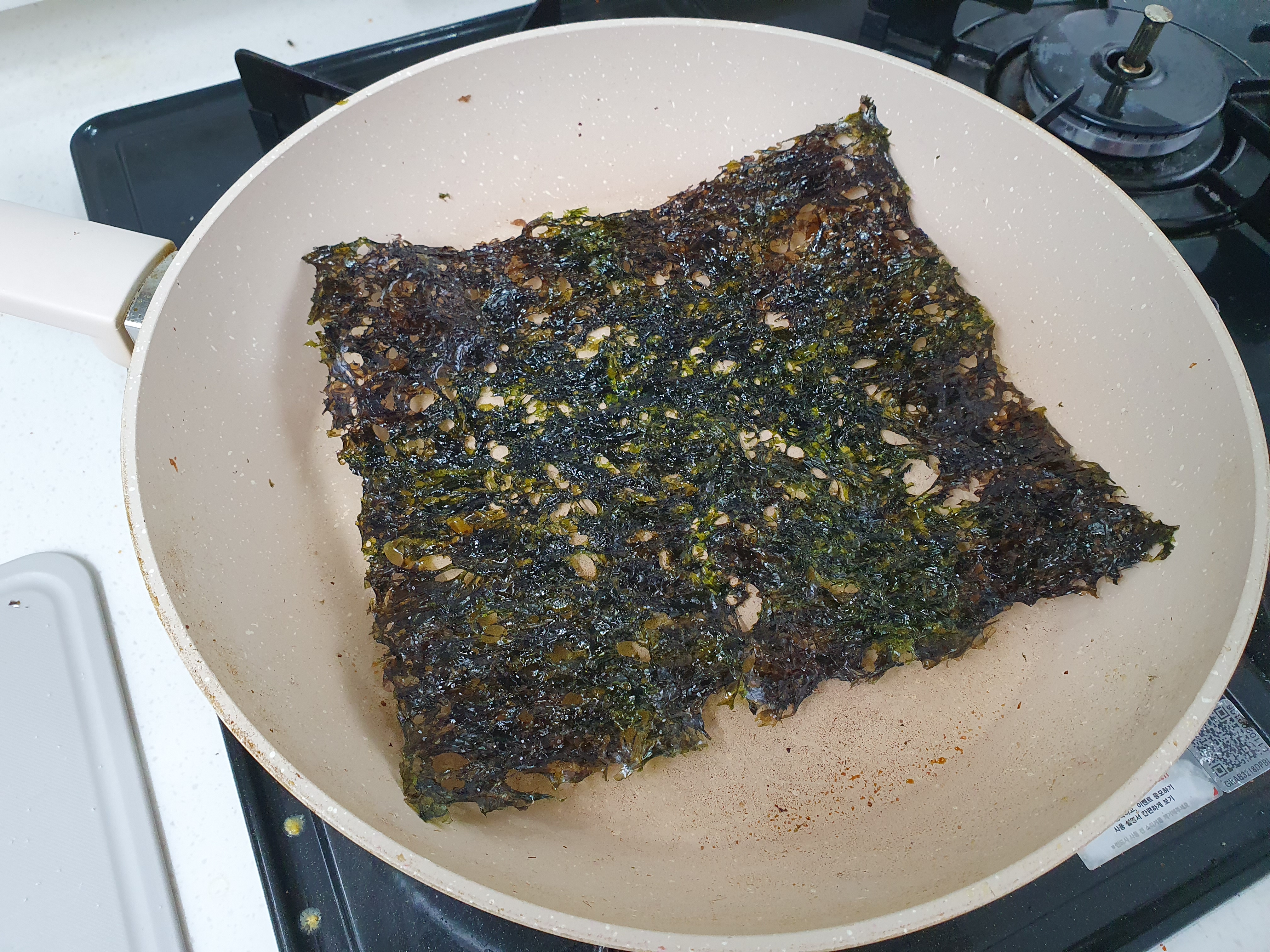 프라이팬을 달군 다음에 전장김을 한쪽 면을 구워 줍니다.