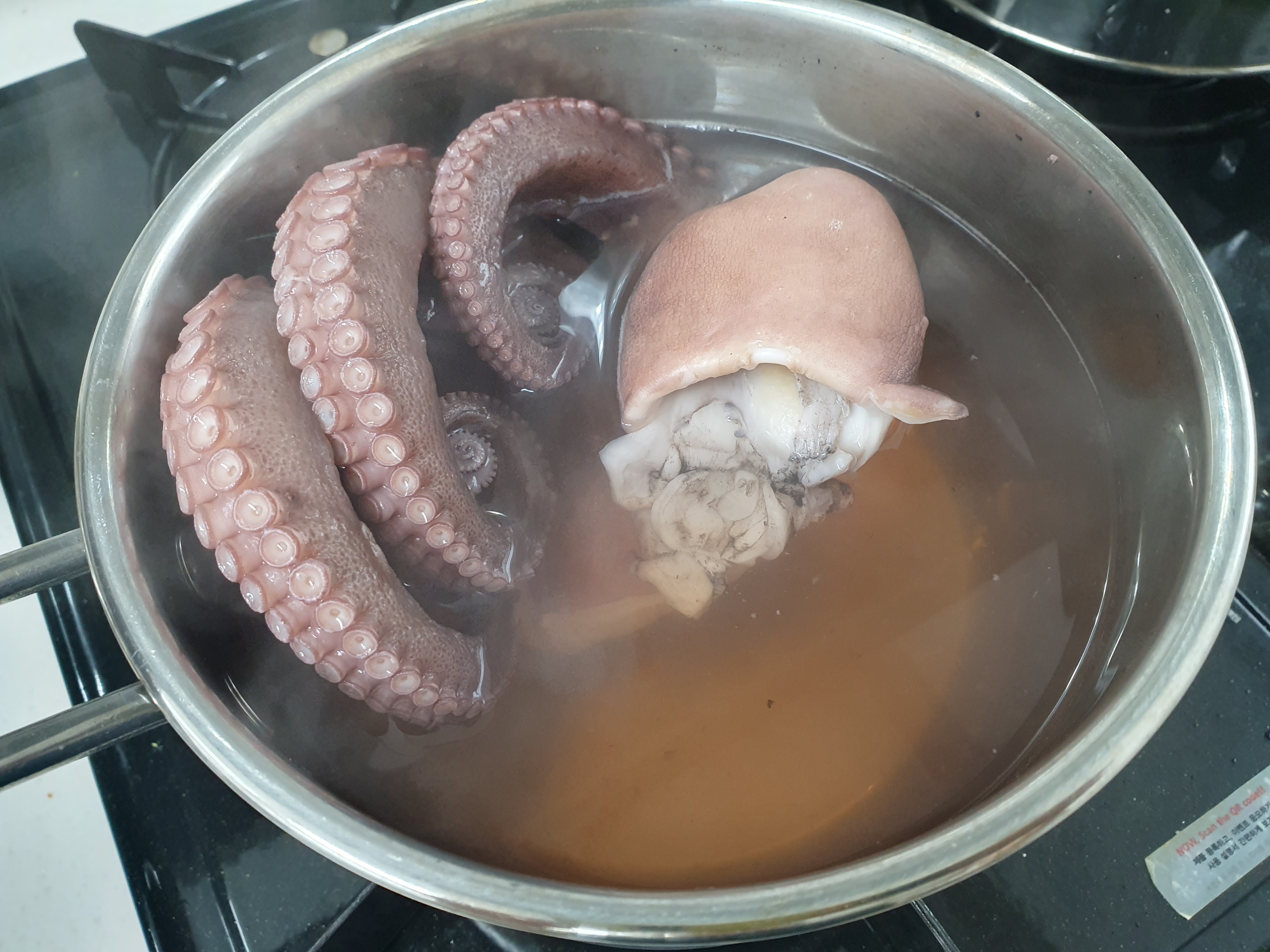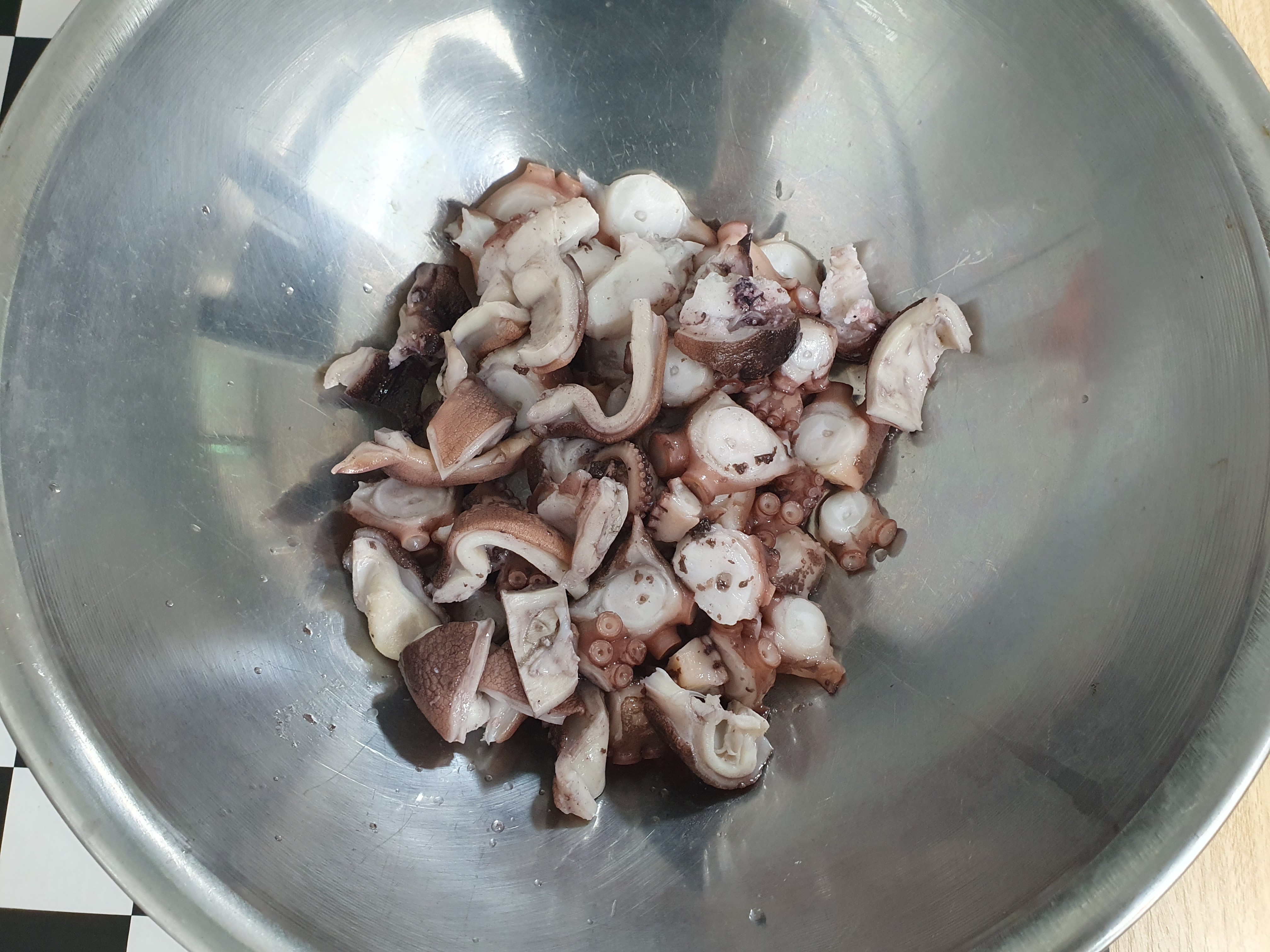 다 익은 문어는 한 입 크기로 썰어 줍니다.