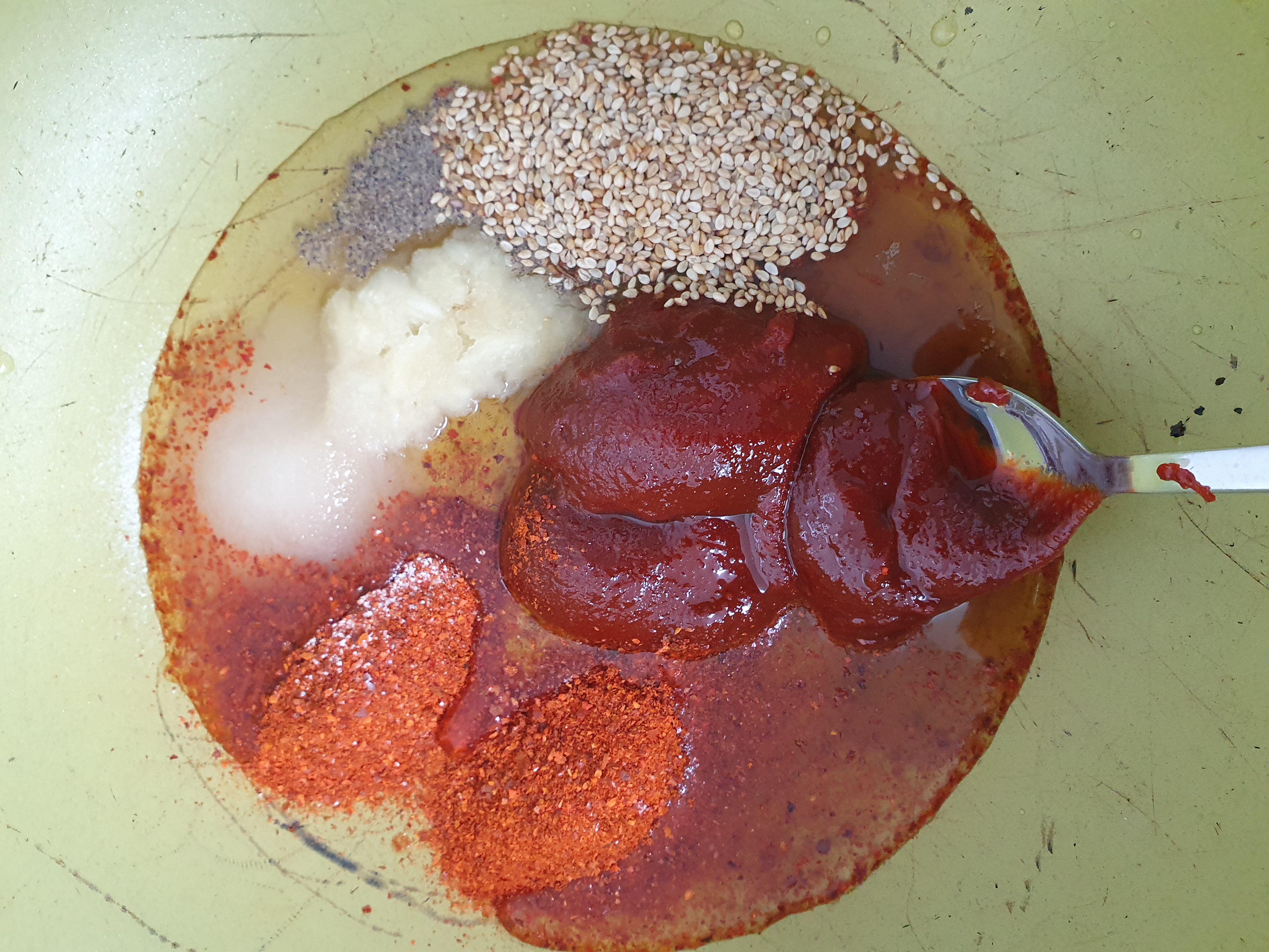 양념장은 고추장, 고춧가루, 간마늘, 매실액, 설탕, 후추, 깨소금을 야채의 양에 맞게 준비를 합니다.