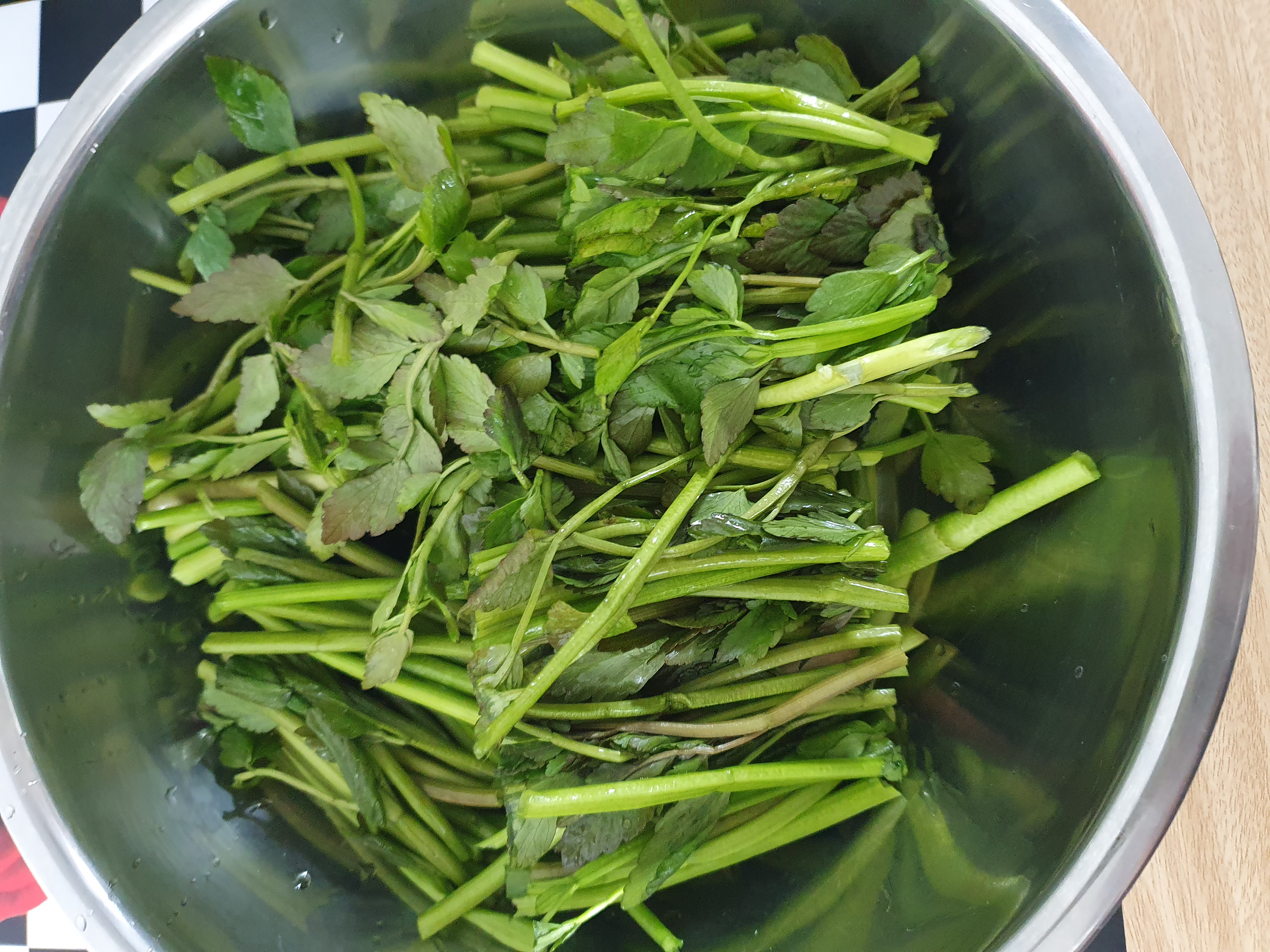 미나리는 한 줌 5센치 길이로 썰어 줍니다.