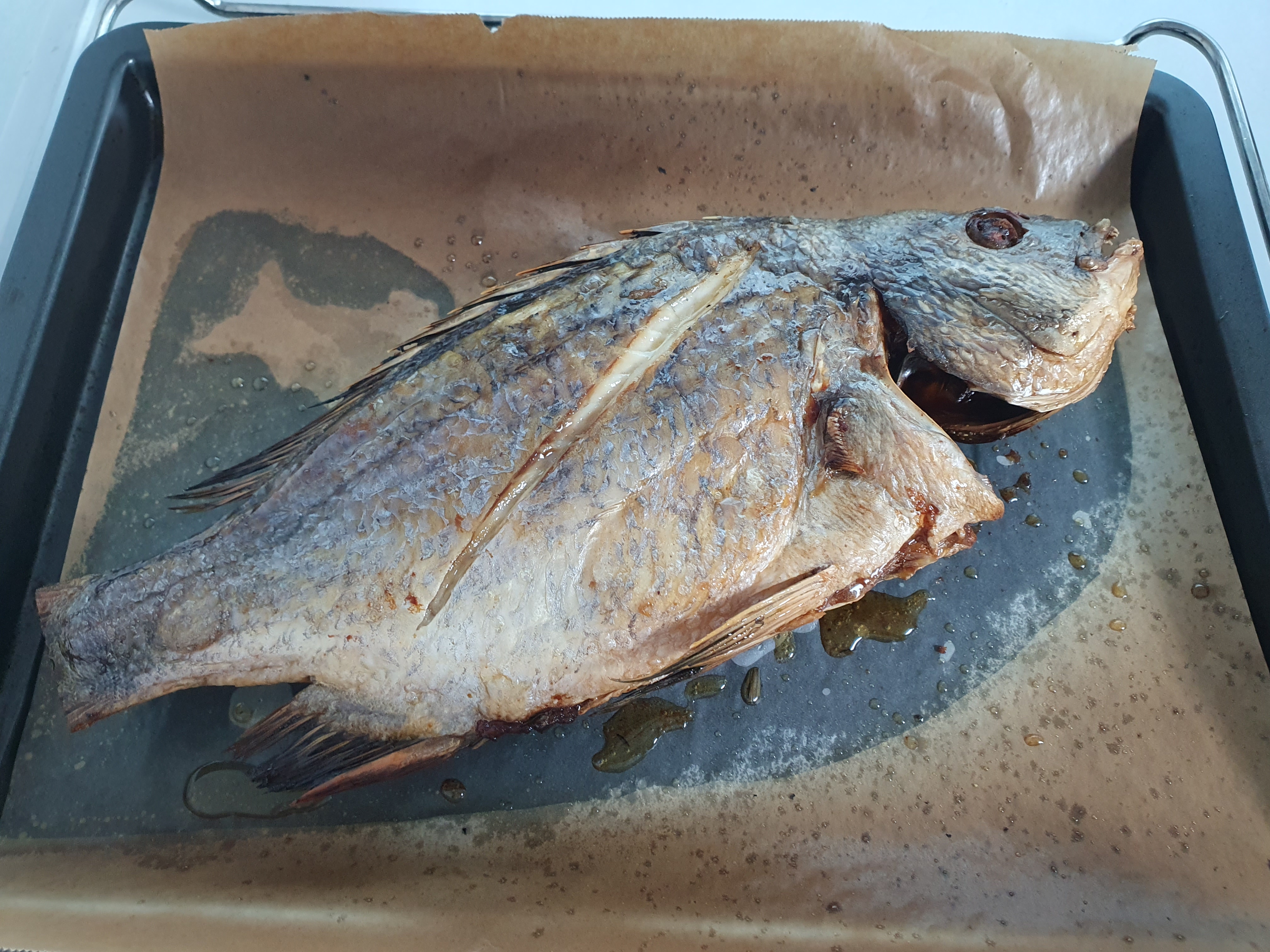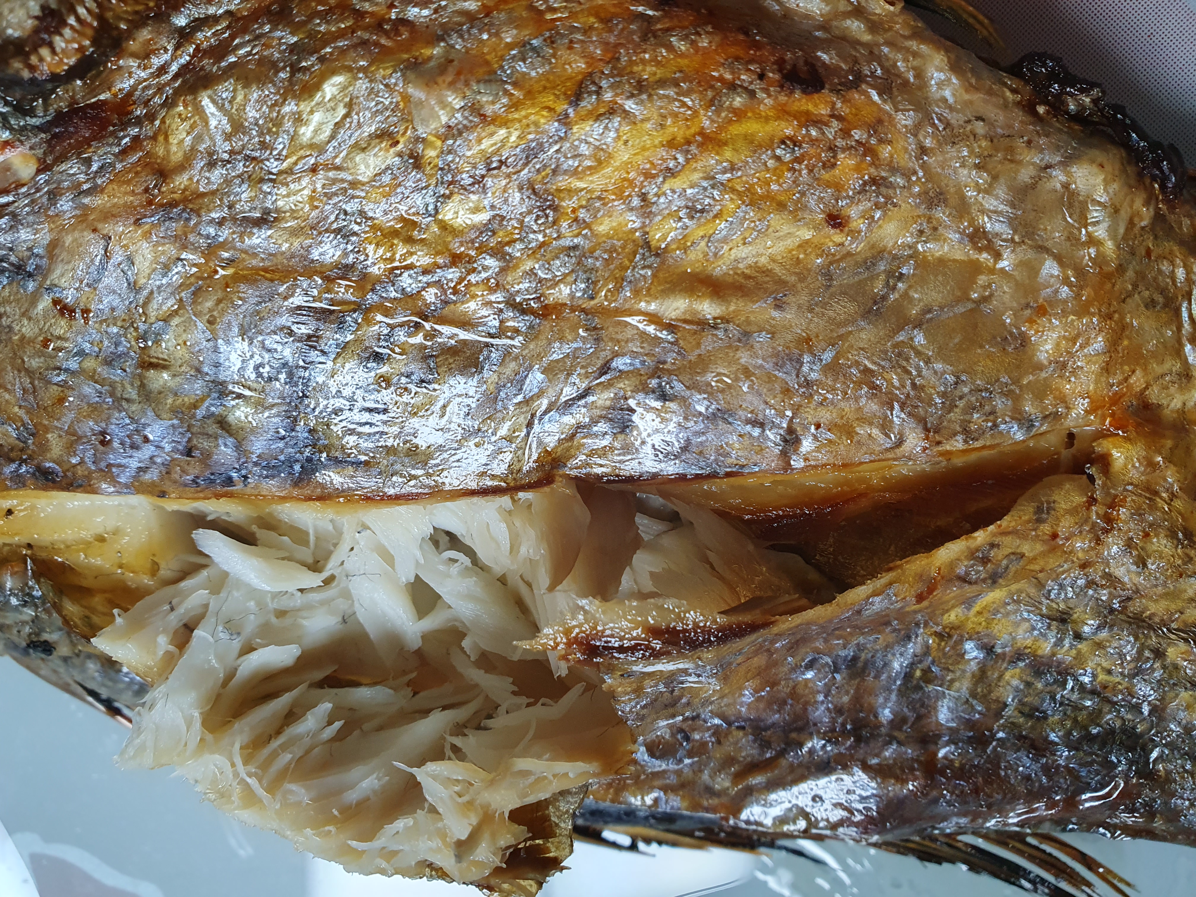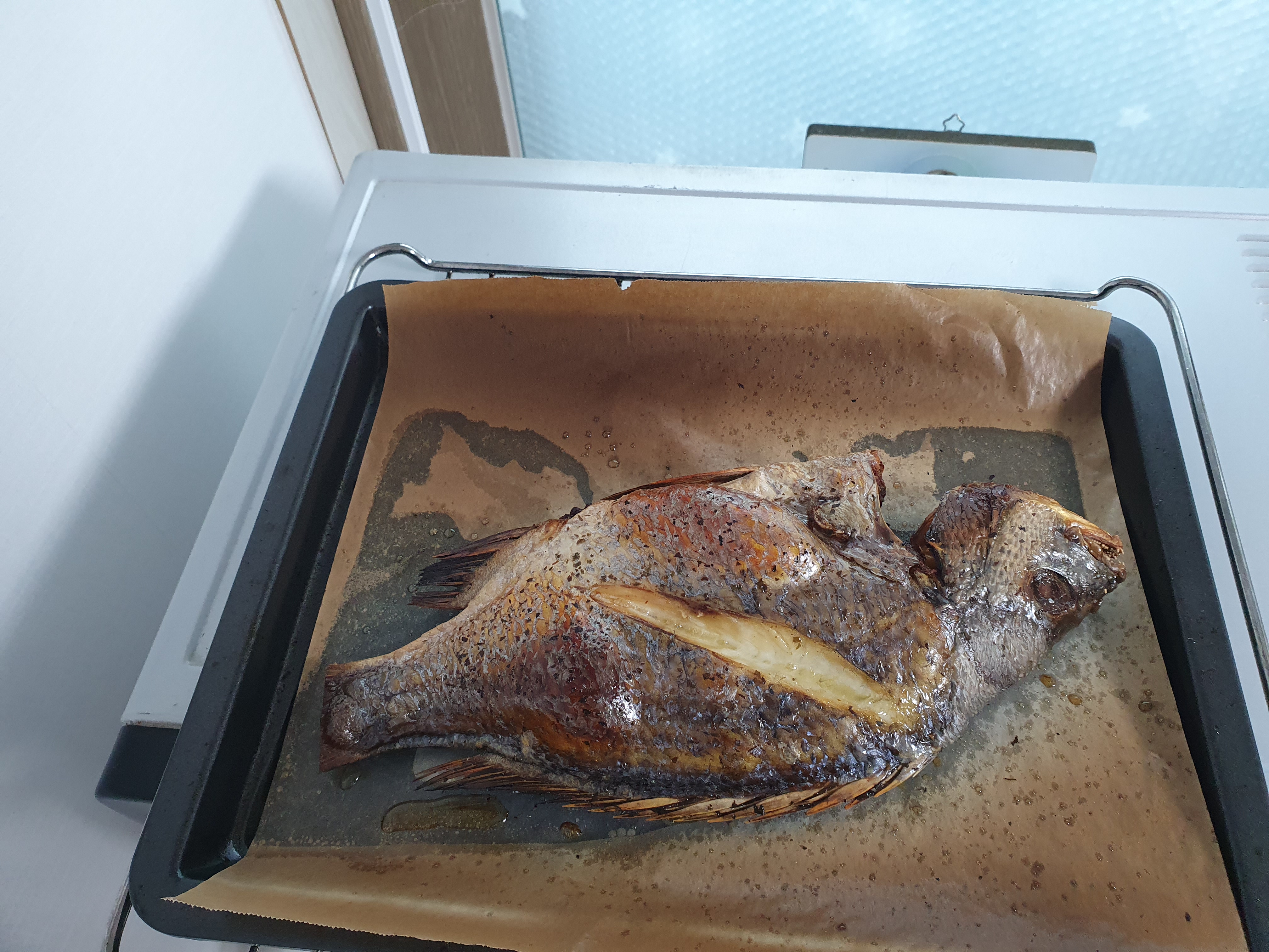 감성돔은 비린내도 안 나고, 오븐으로 구워서 기름기가 쭈~욱 빠져서 쫄깃한 맛이 납니다. 껍질이 젓가락으로 잘 안 찢어질 때는 가위로 잘라서 속살을 먹어도 되는 거 같아요~