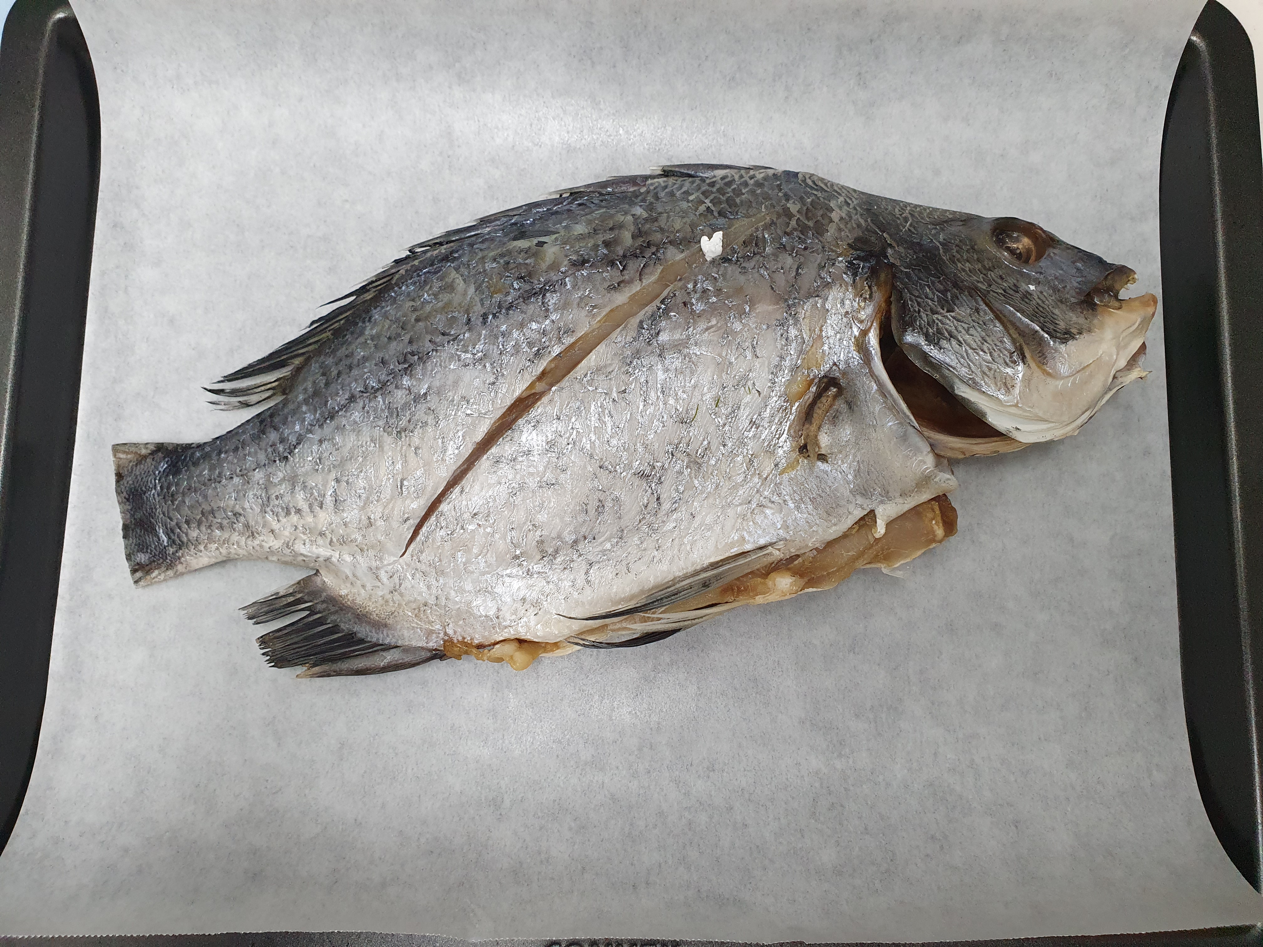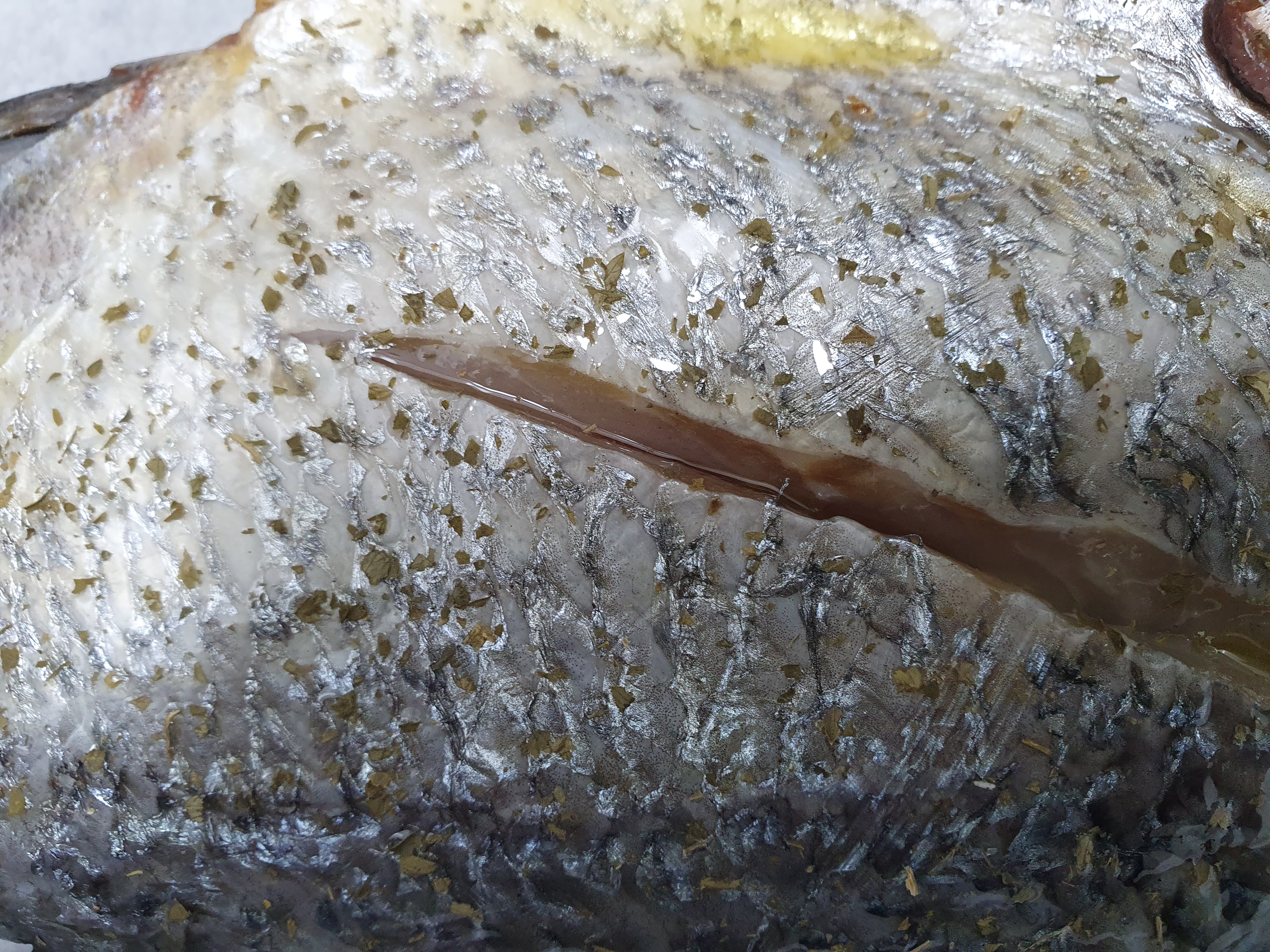 감성돔에 올리브유를 앞뒤로 듬뿍 발라 줍니다.