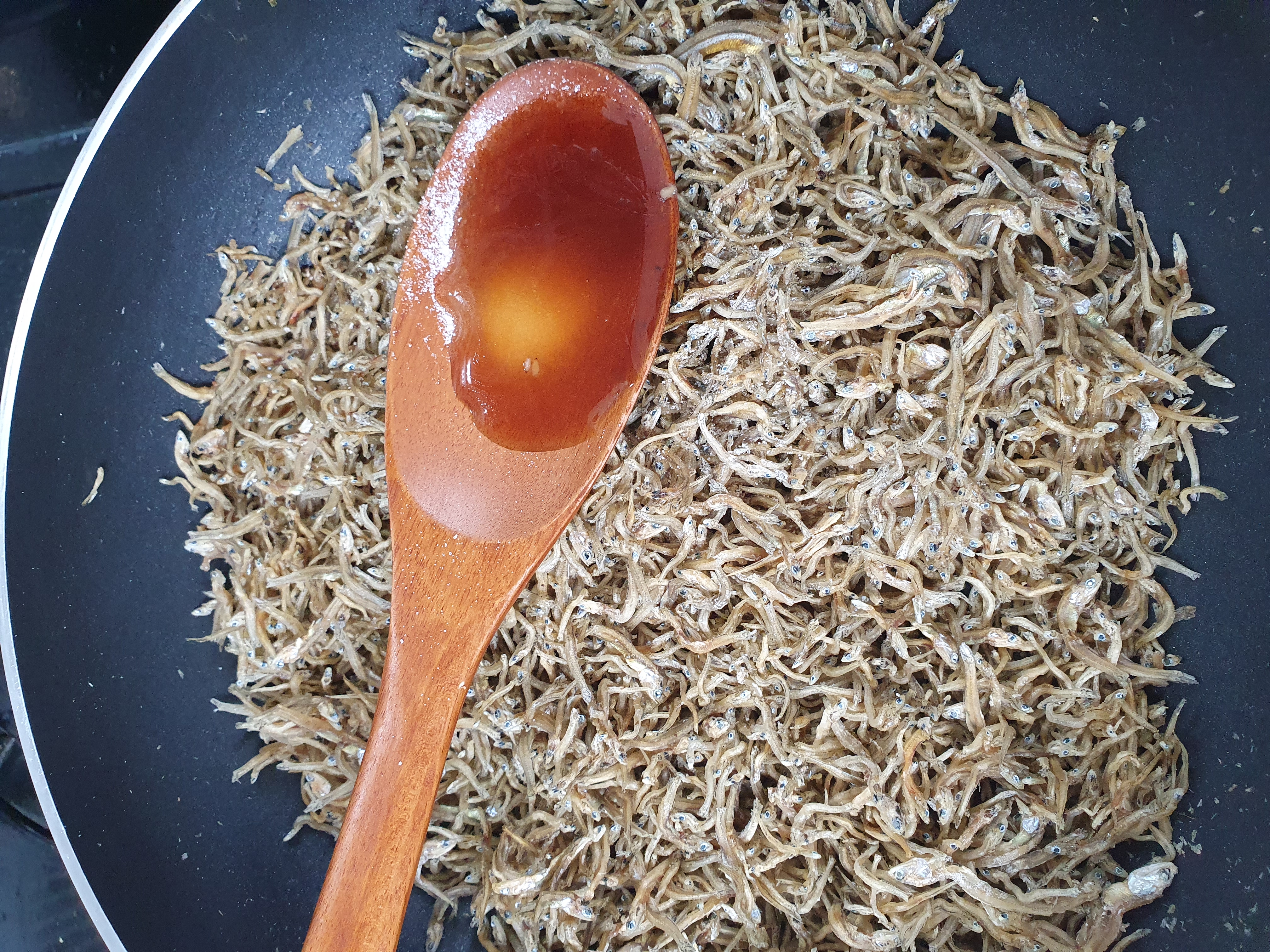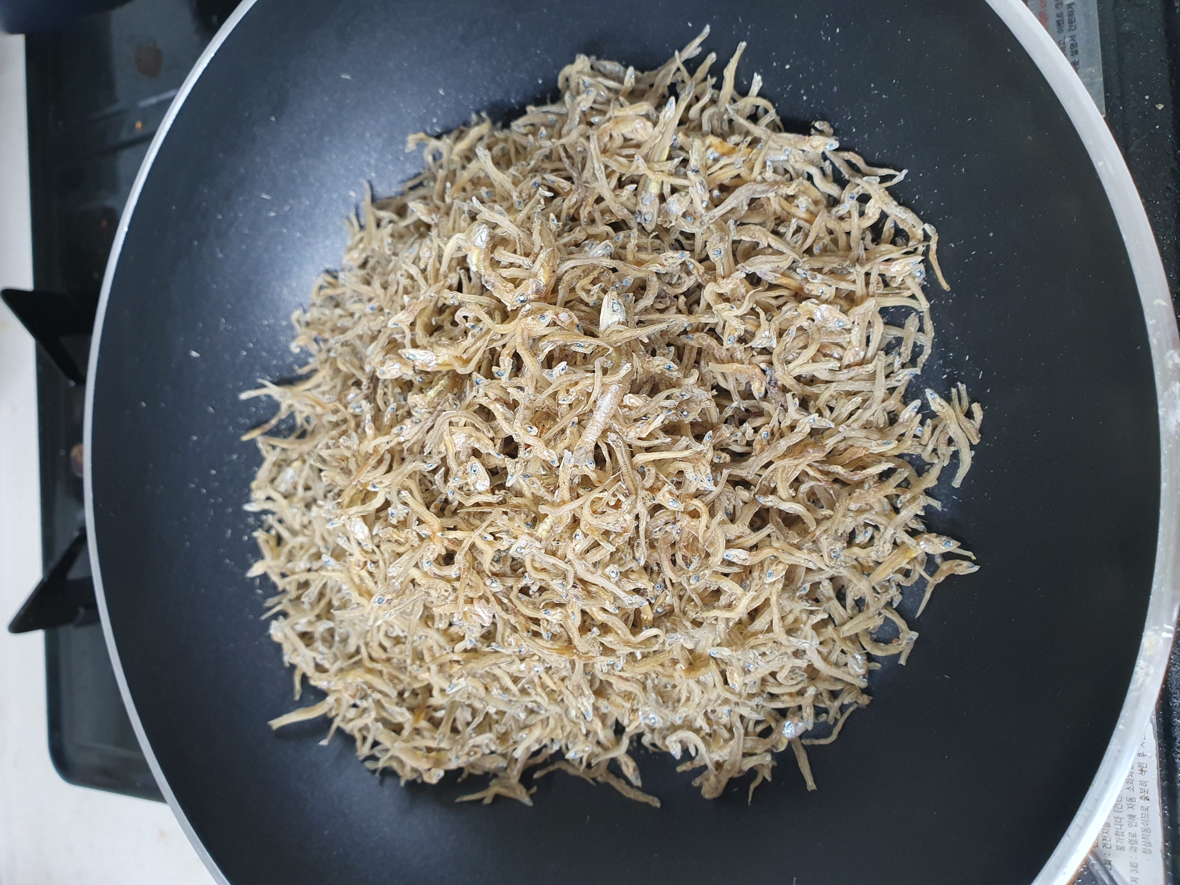 멸치의 비린내를 날리기 위해서 프라이팬에 멸치를 기름과 맛술을 넣고 볶습니다.