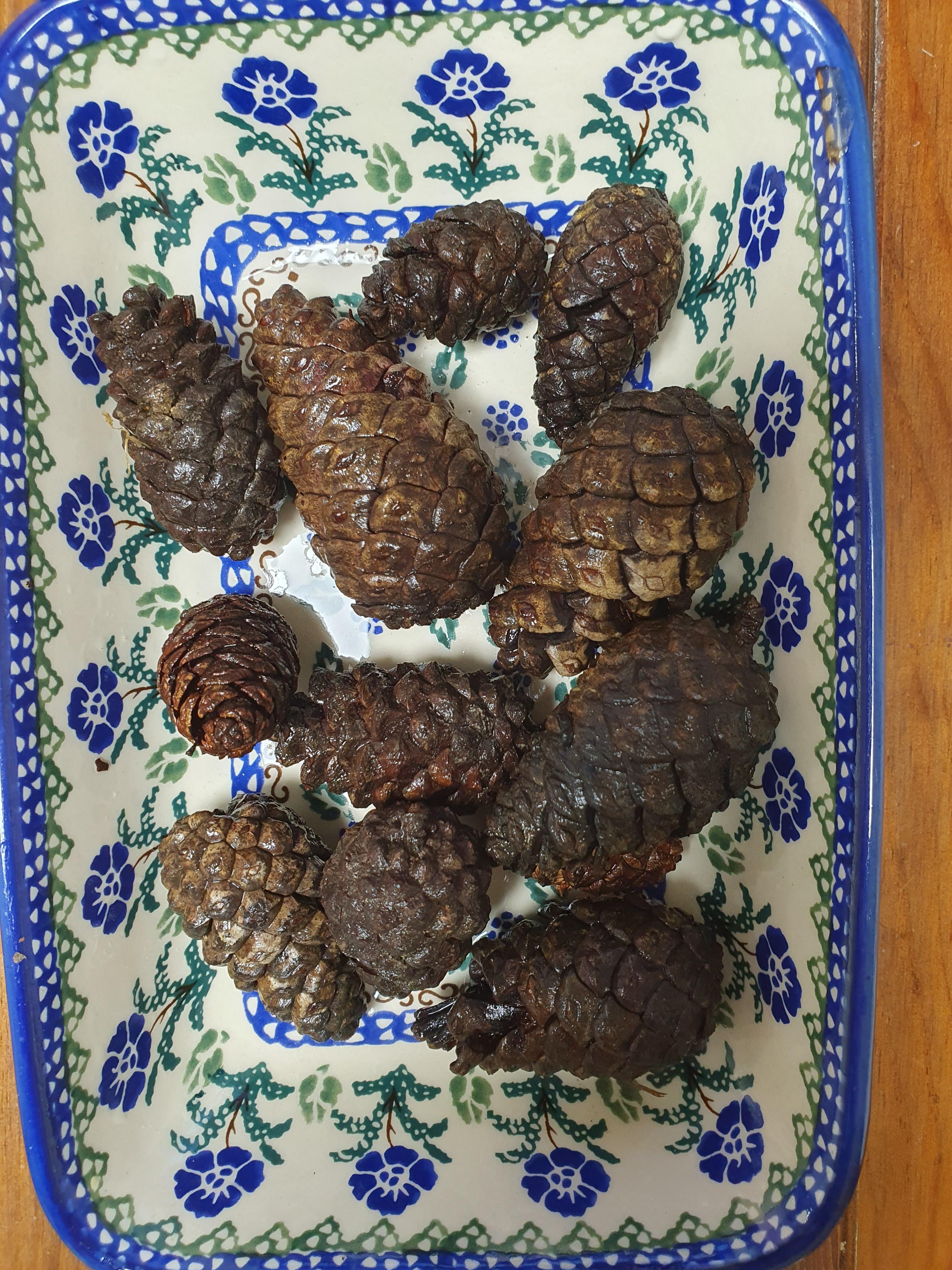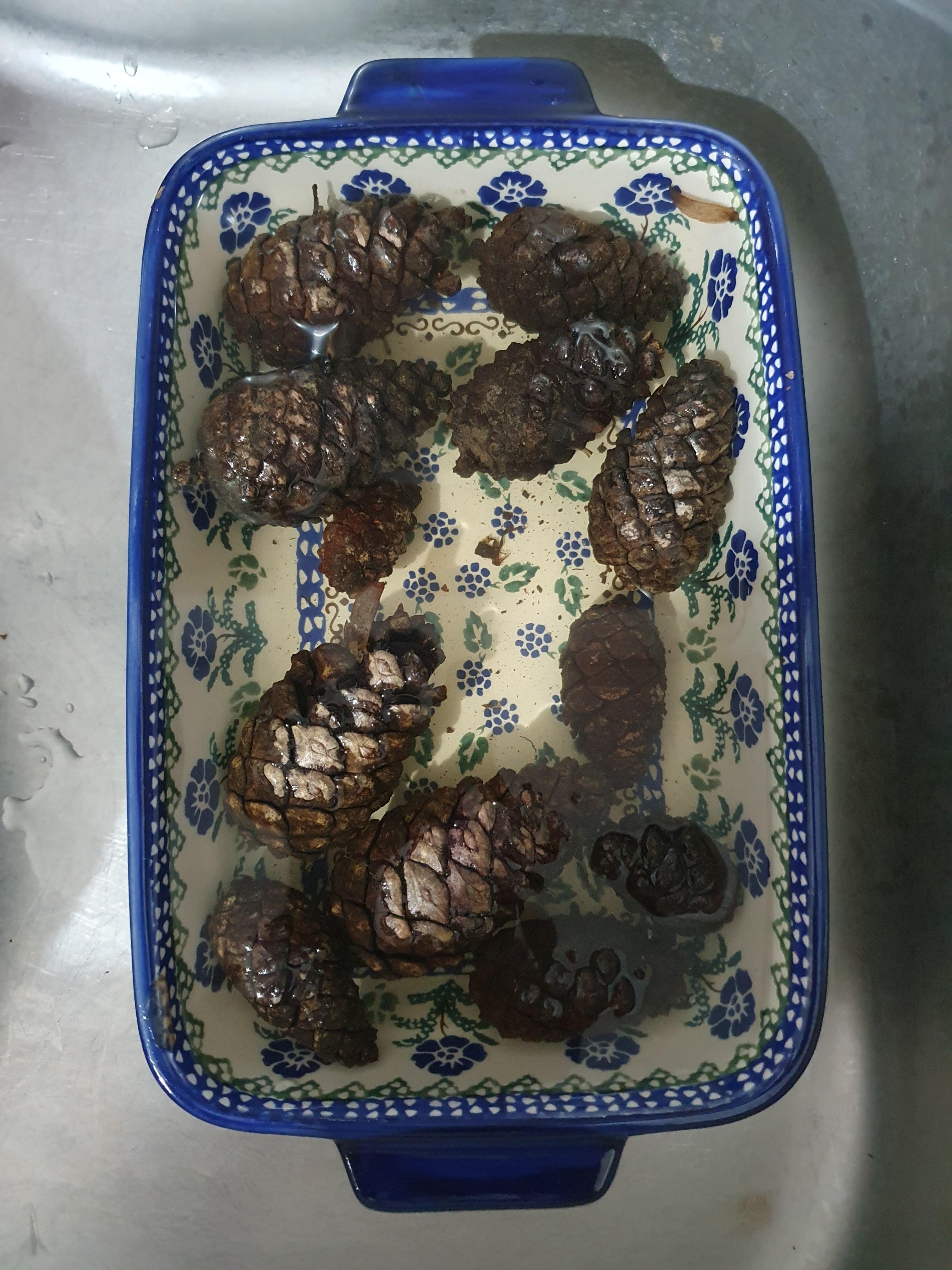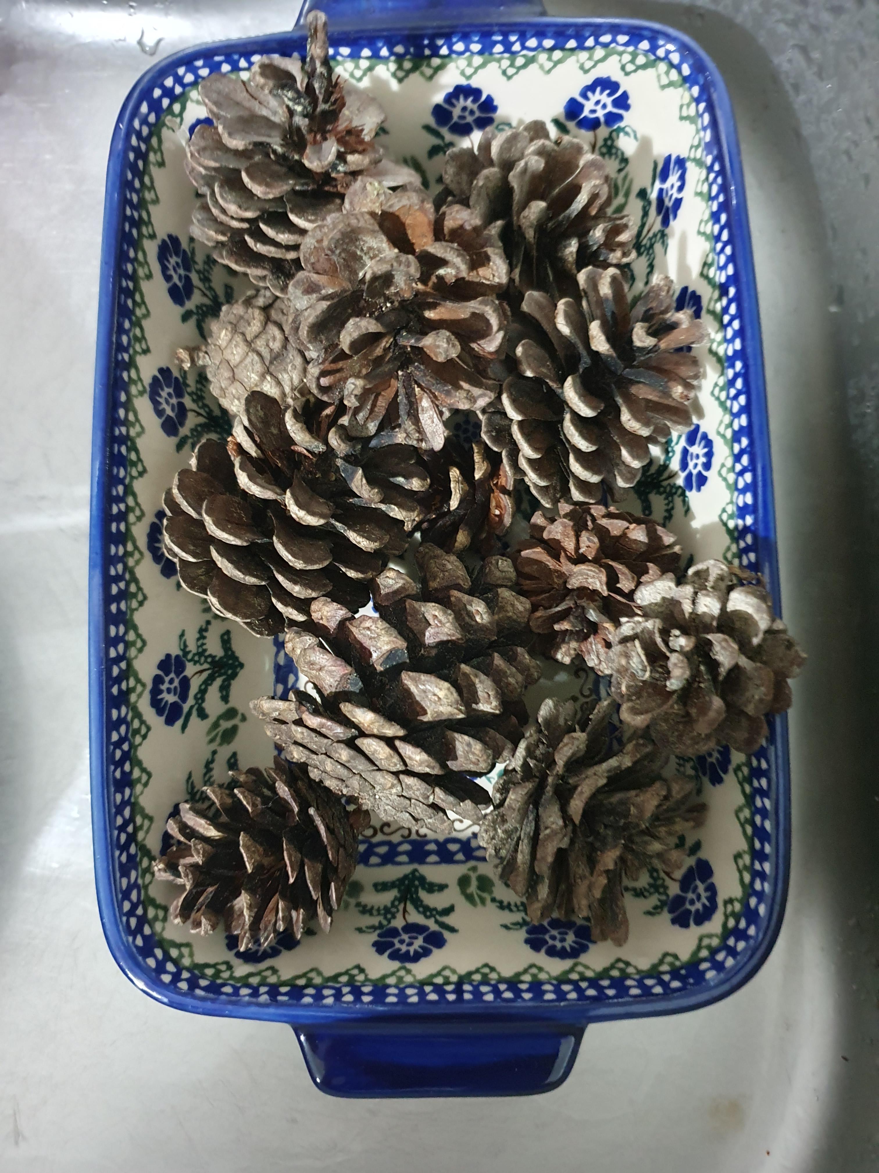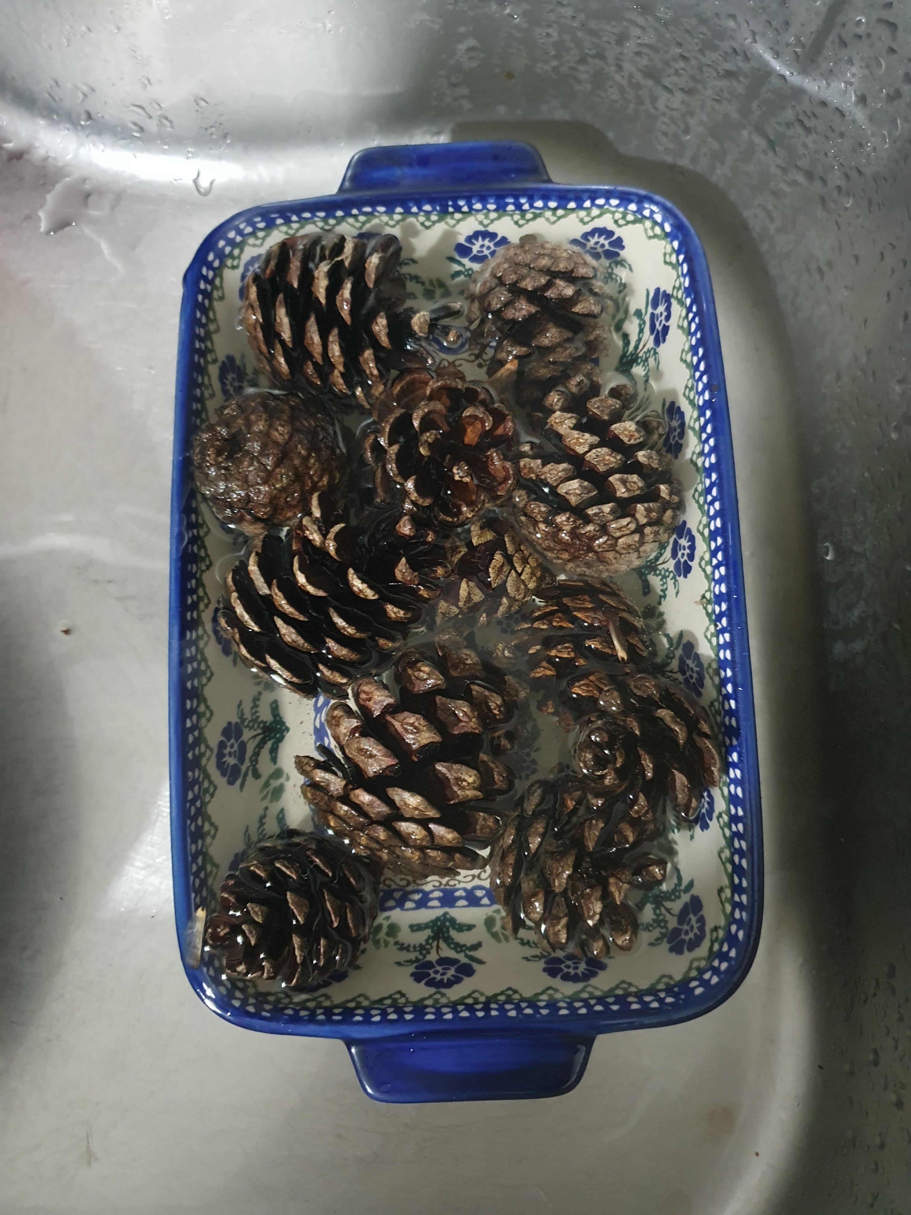 솔방울을 깨끗하게 씻어서 폭이 넓은 그릇에 담아 놓습니다.