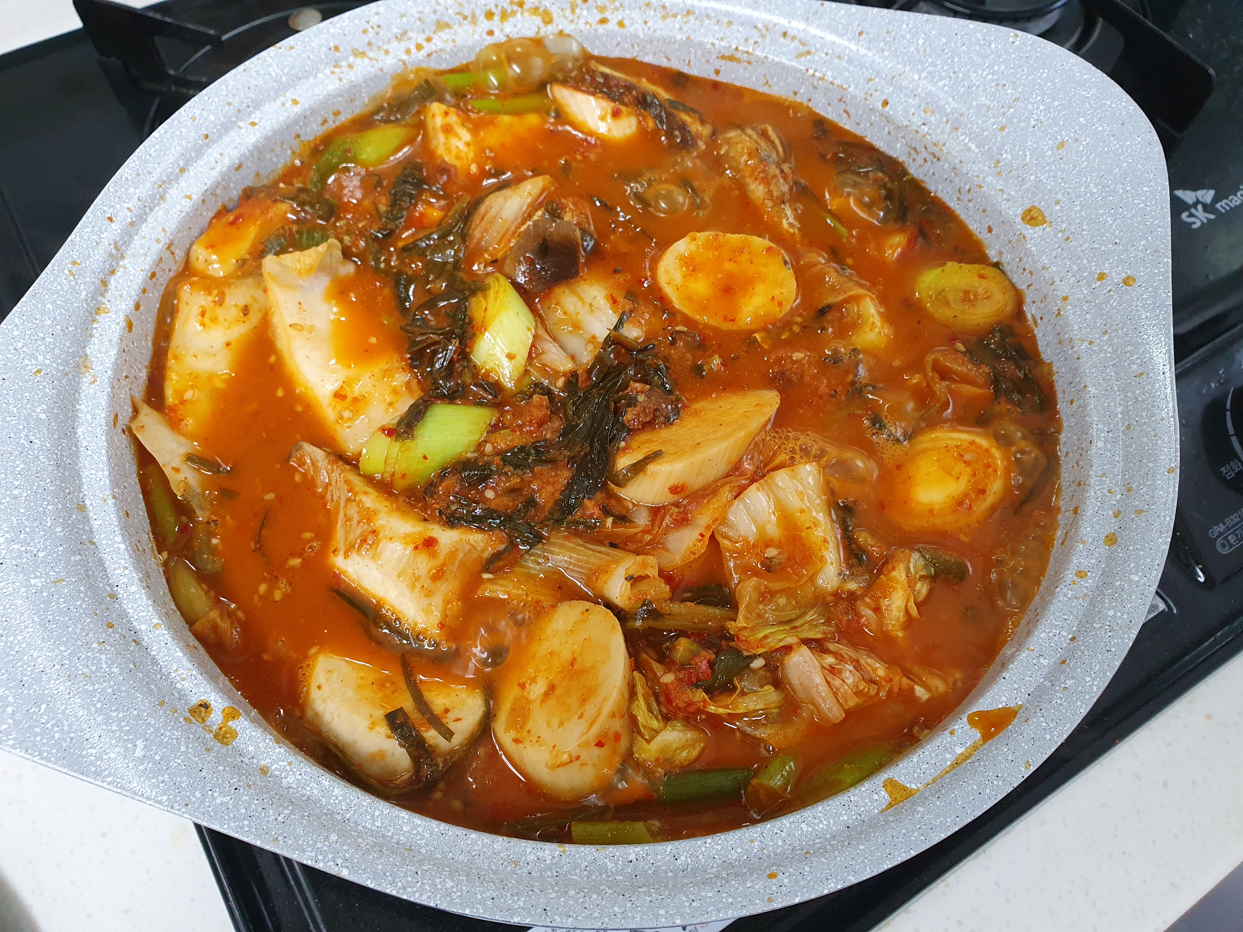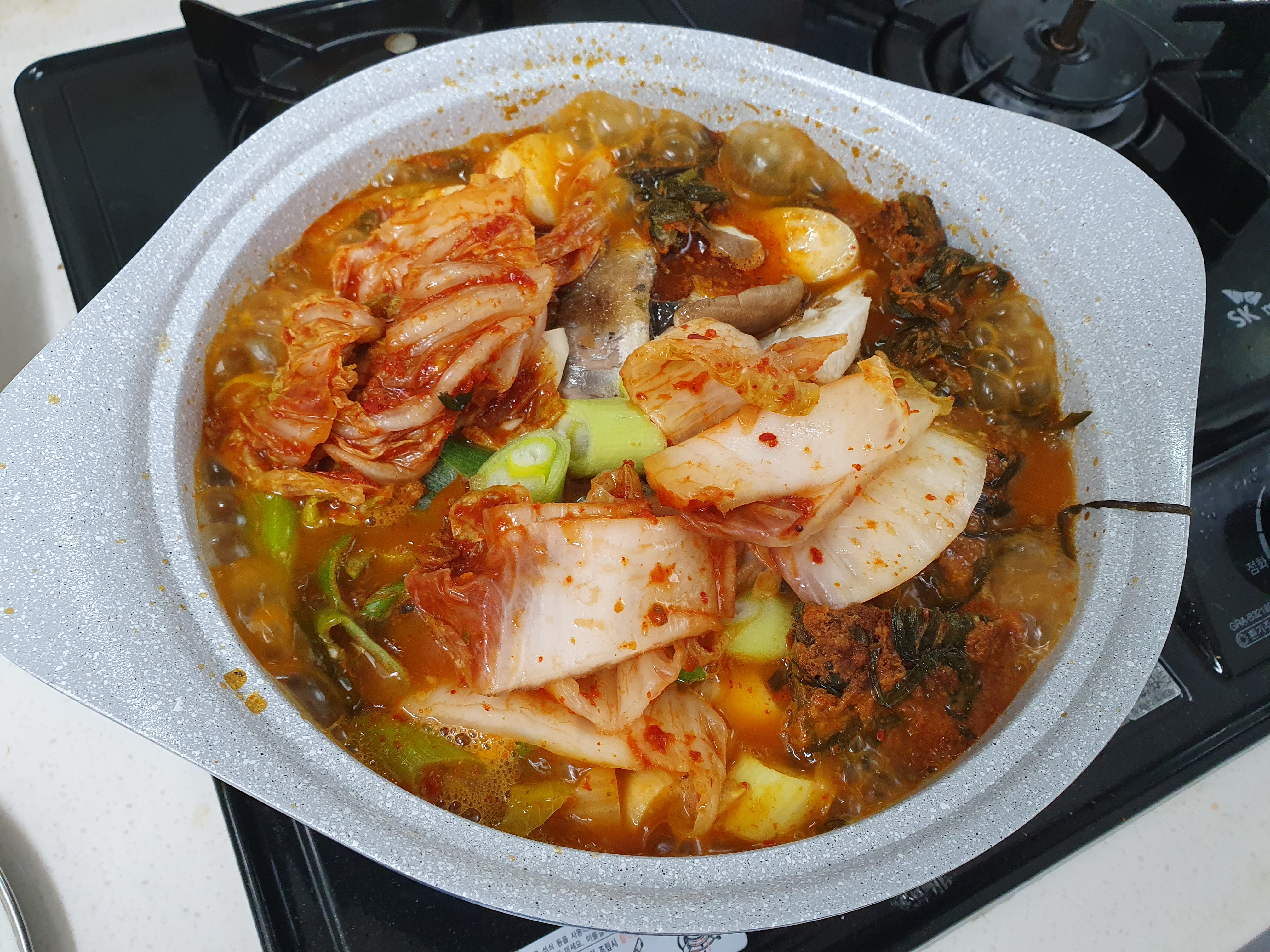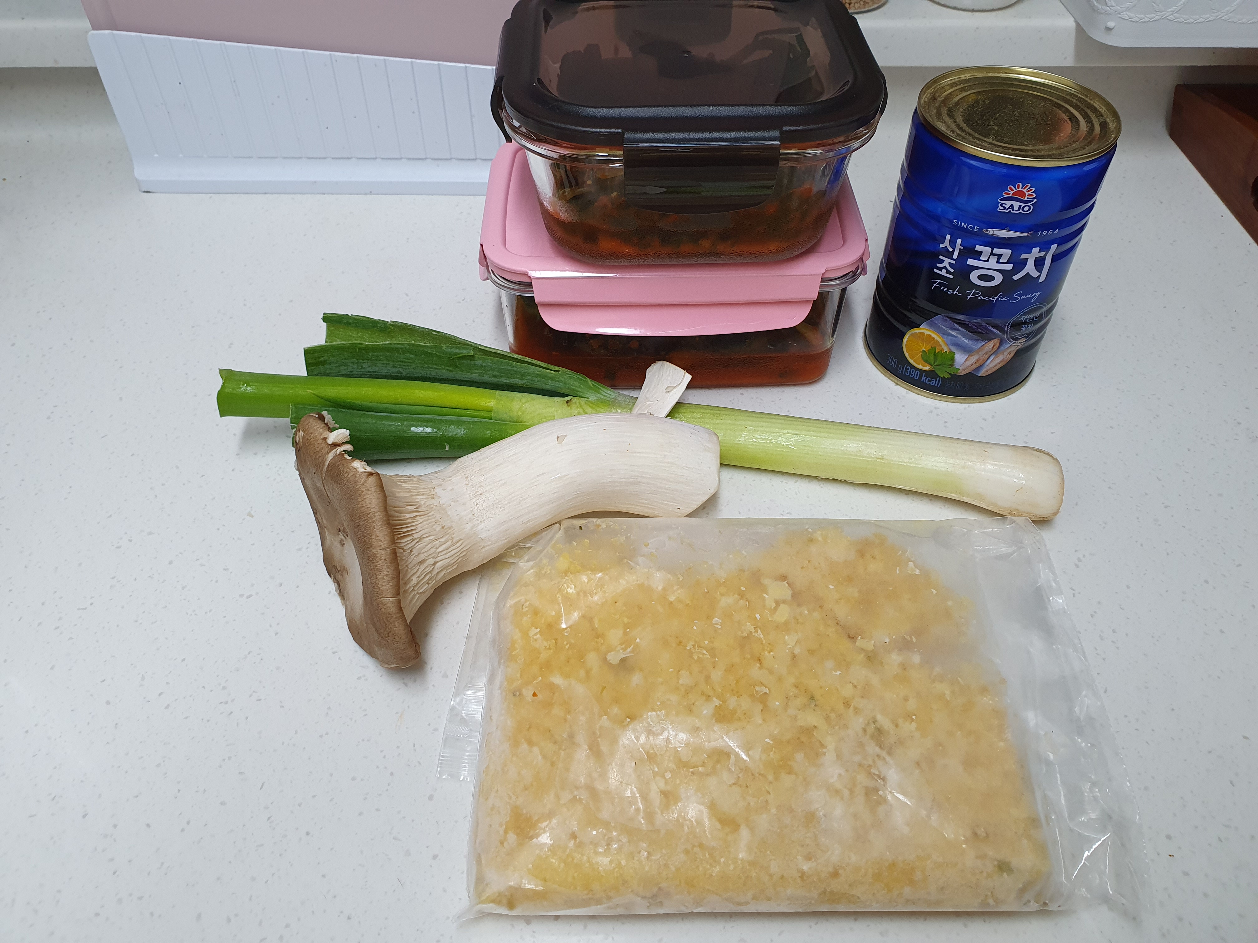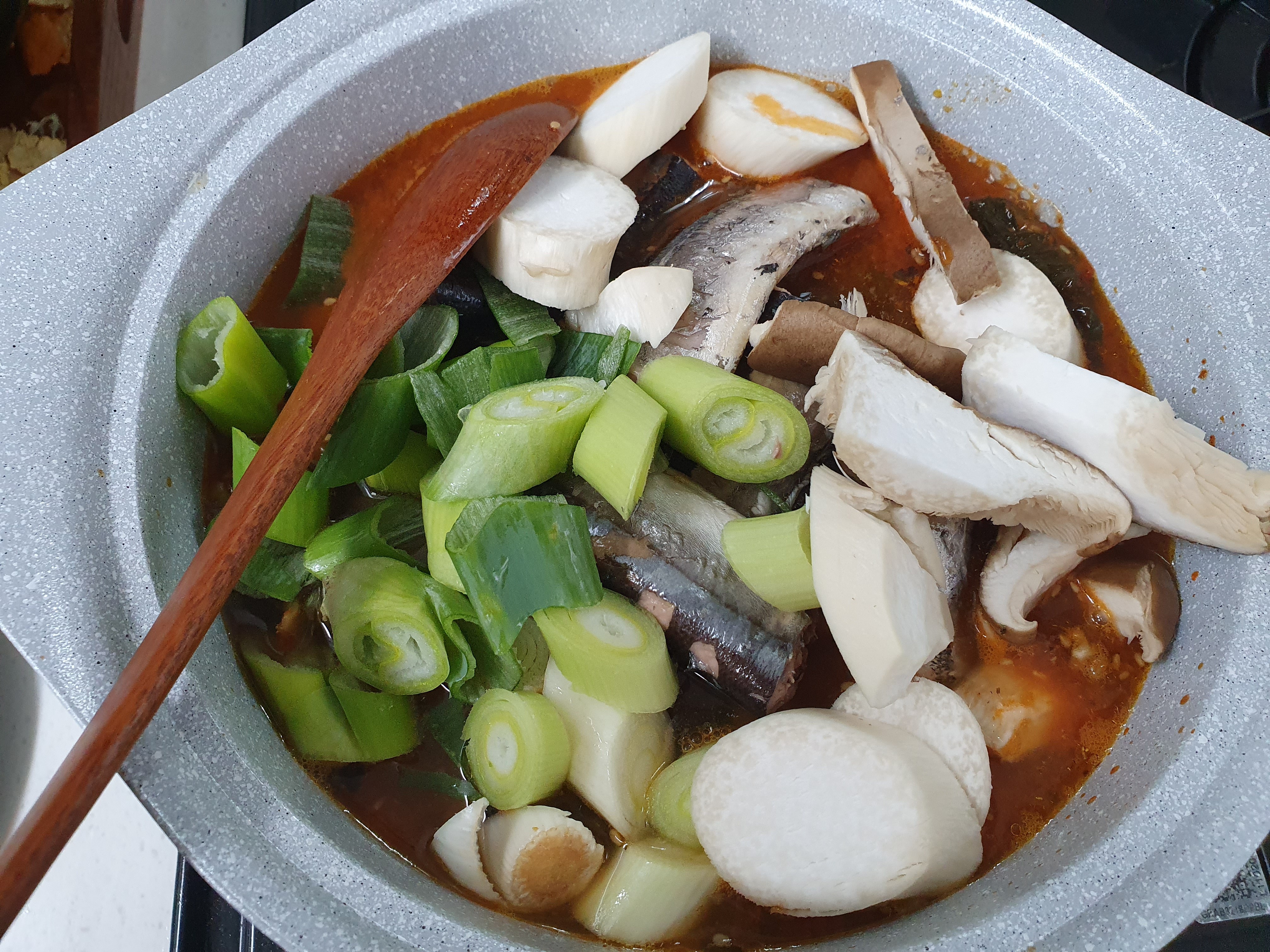 찌개를 좀 자박하게 끓이려고 물은 적당히 넣고, 그 위에 파를 좀 듬뿍 넣었습니다. 새송이 버섯은 그냥 냉장고에 있어서 넣은 거라서 냉장고에 있는 재료를 활용하면 좋을 거 같네요~