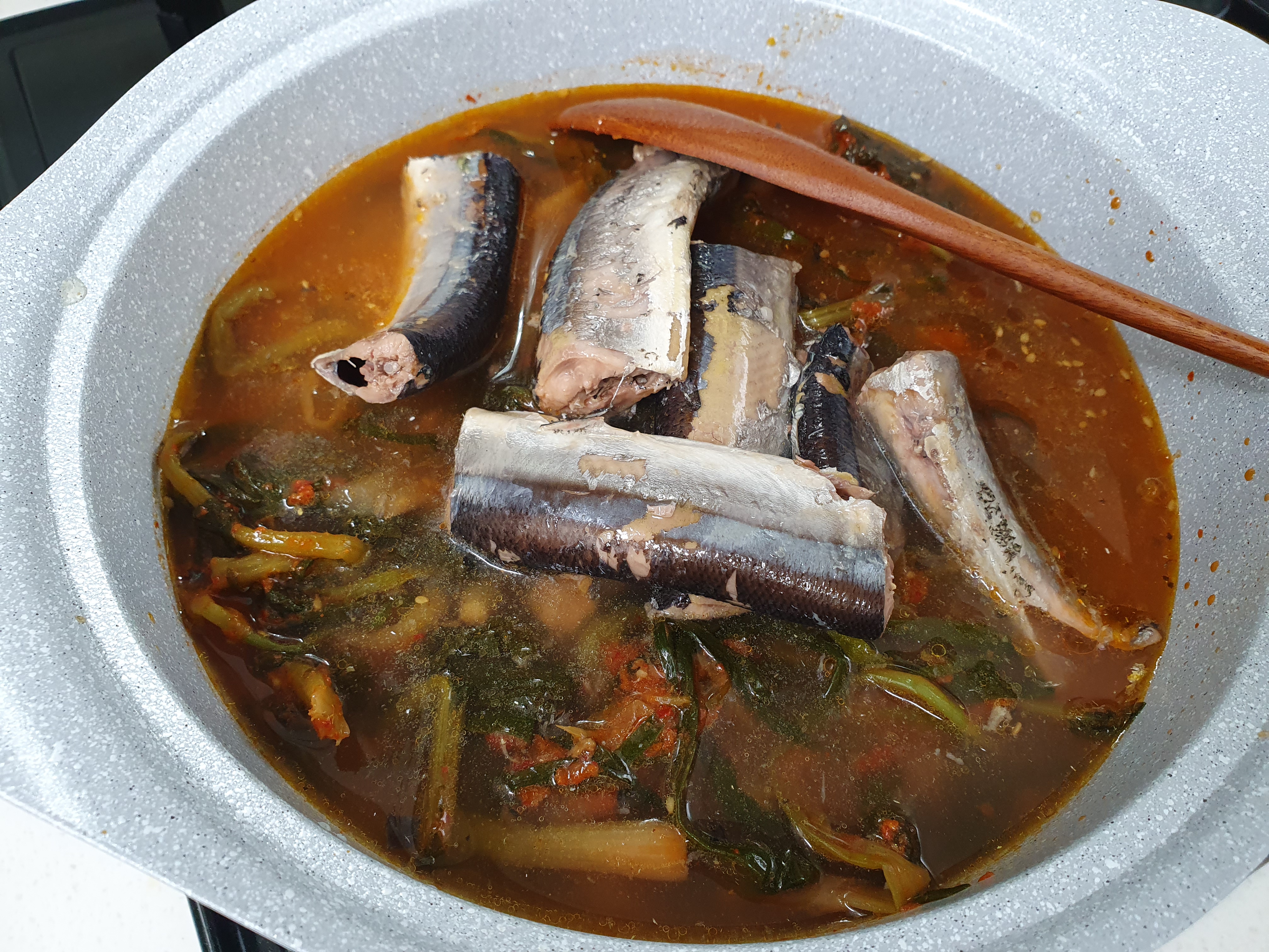 찌개가 끊어오르지 않게 불조절을 하면서 간을 봅니다. 혹시 꽁치의 비린내가 조금 거슬린다면 다진 마늘을 넣어 주는 것도 좋은 방법입니다.