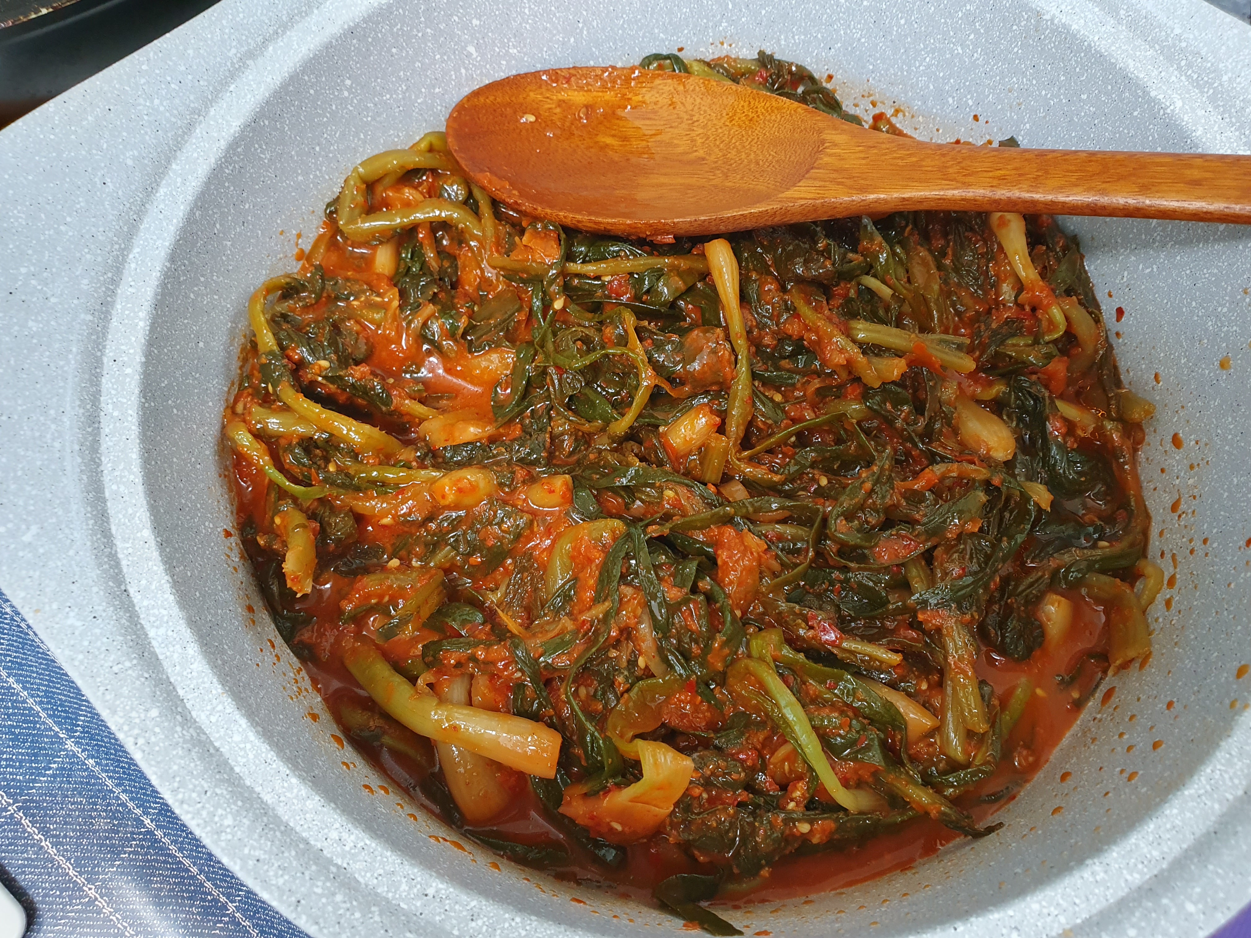 총각김치의 무를 다 먹고, 무청만 남아 있어서 그 무청만 그대로 냅비에 깔아줍니다.