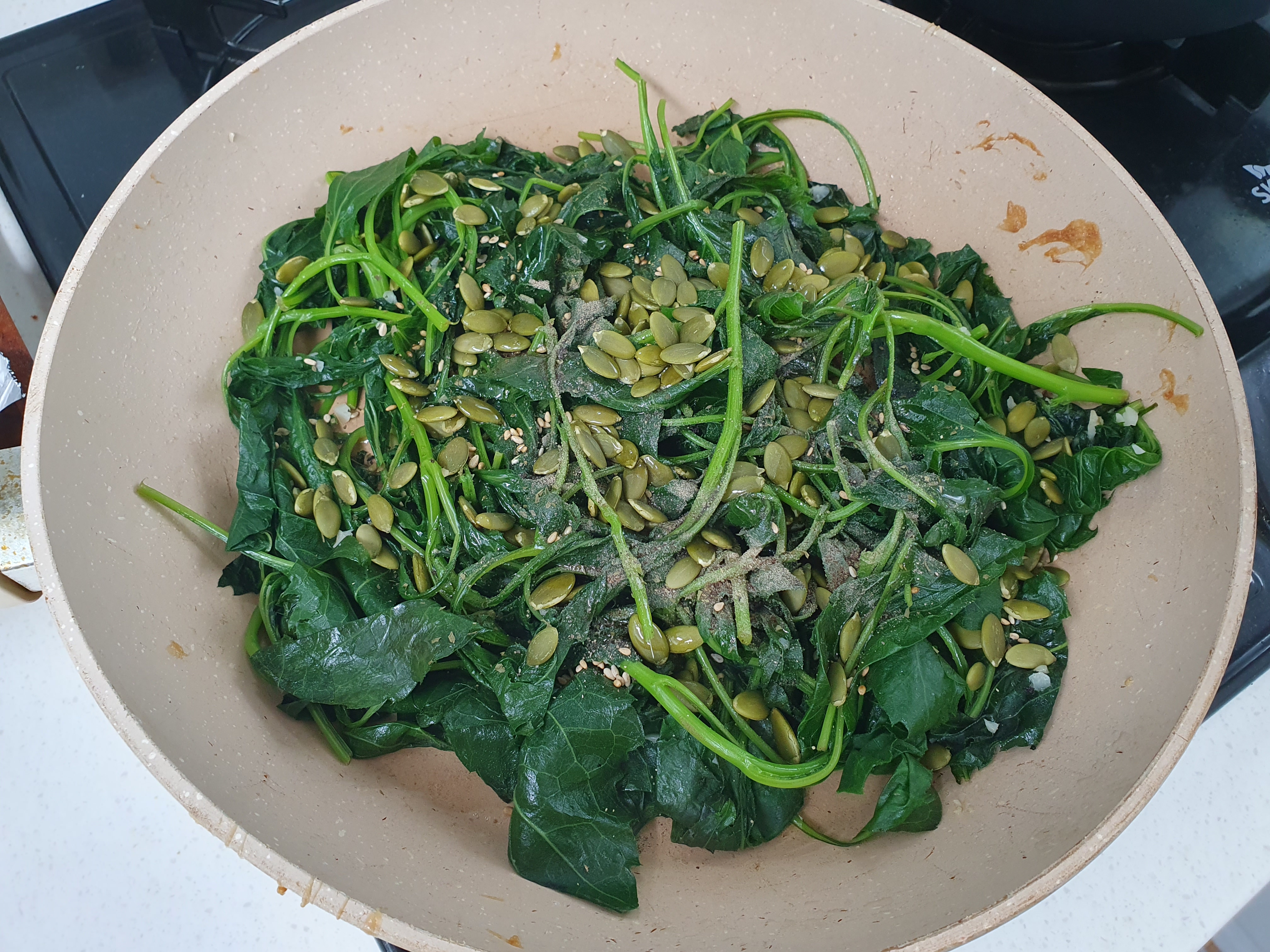 후추, 호박씨, 통깨를 넣고 마무리로 볶아 줍니다.