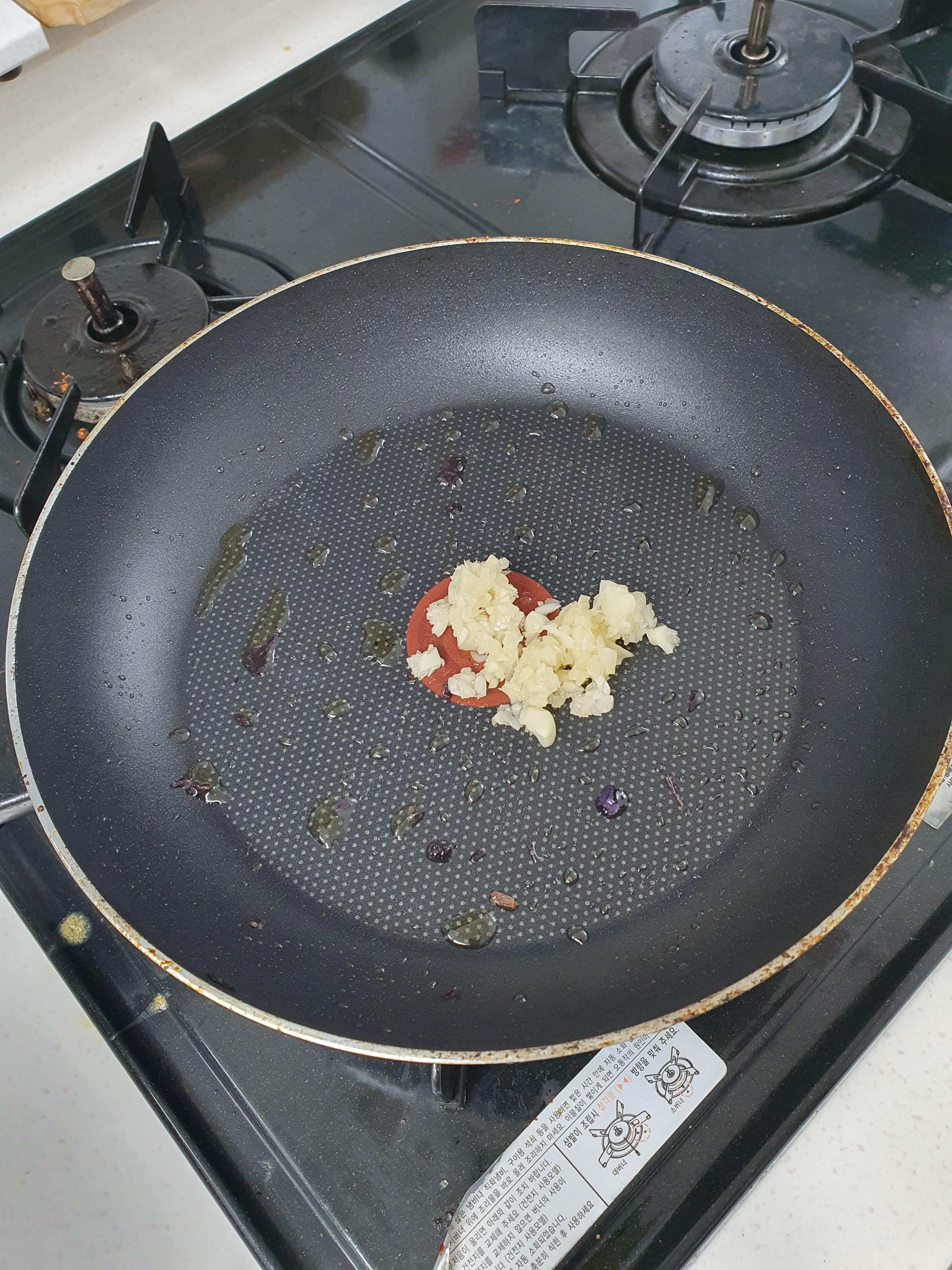 팬에 올리브유와 마늘을 둘러 줍니다.