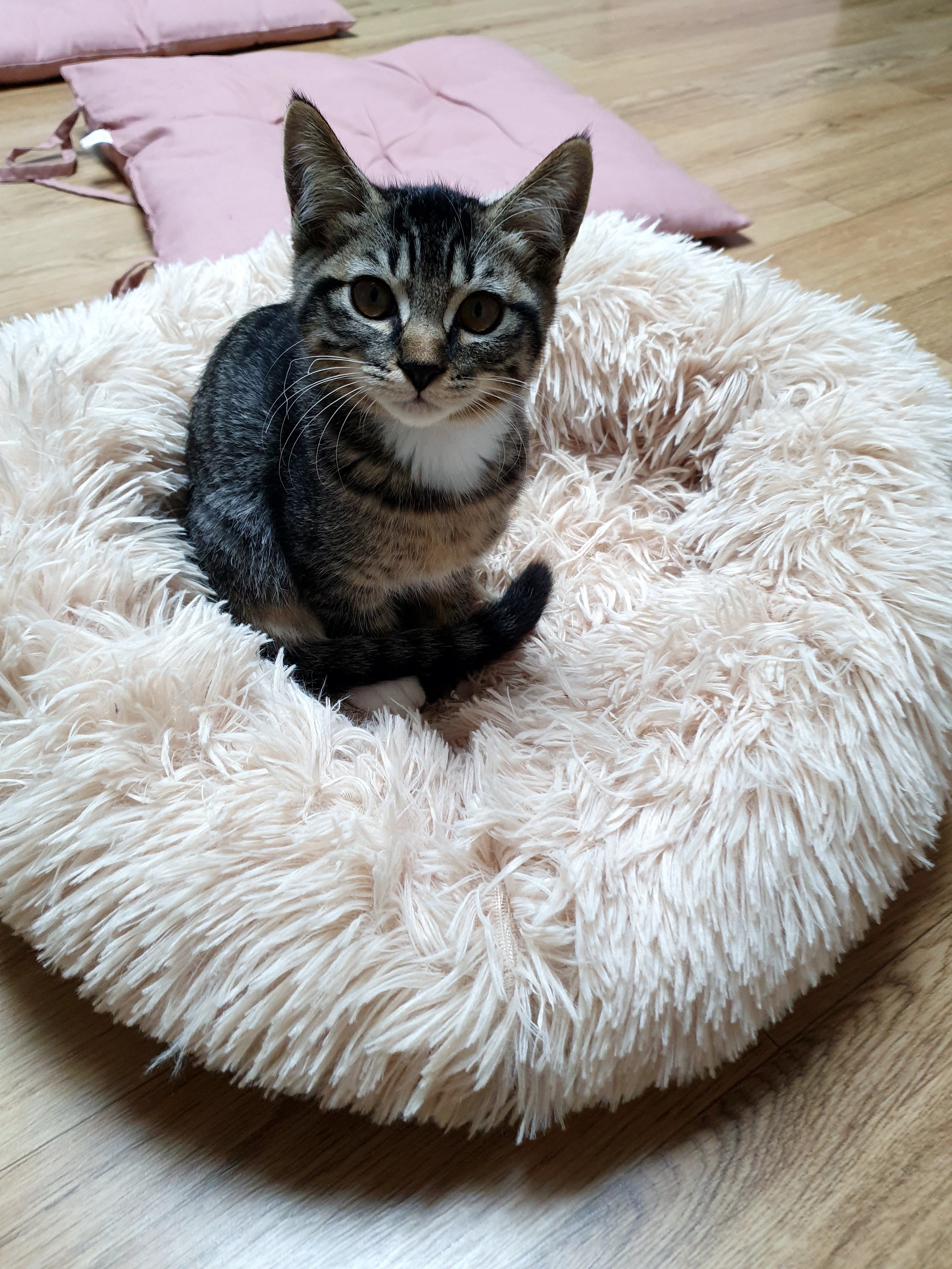 송이가 다소곳이 식빵 굽는 자세로 앉아 있습니다.