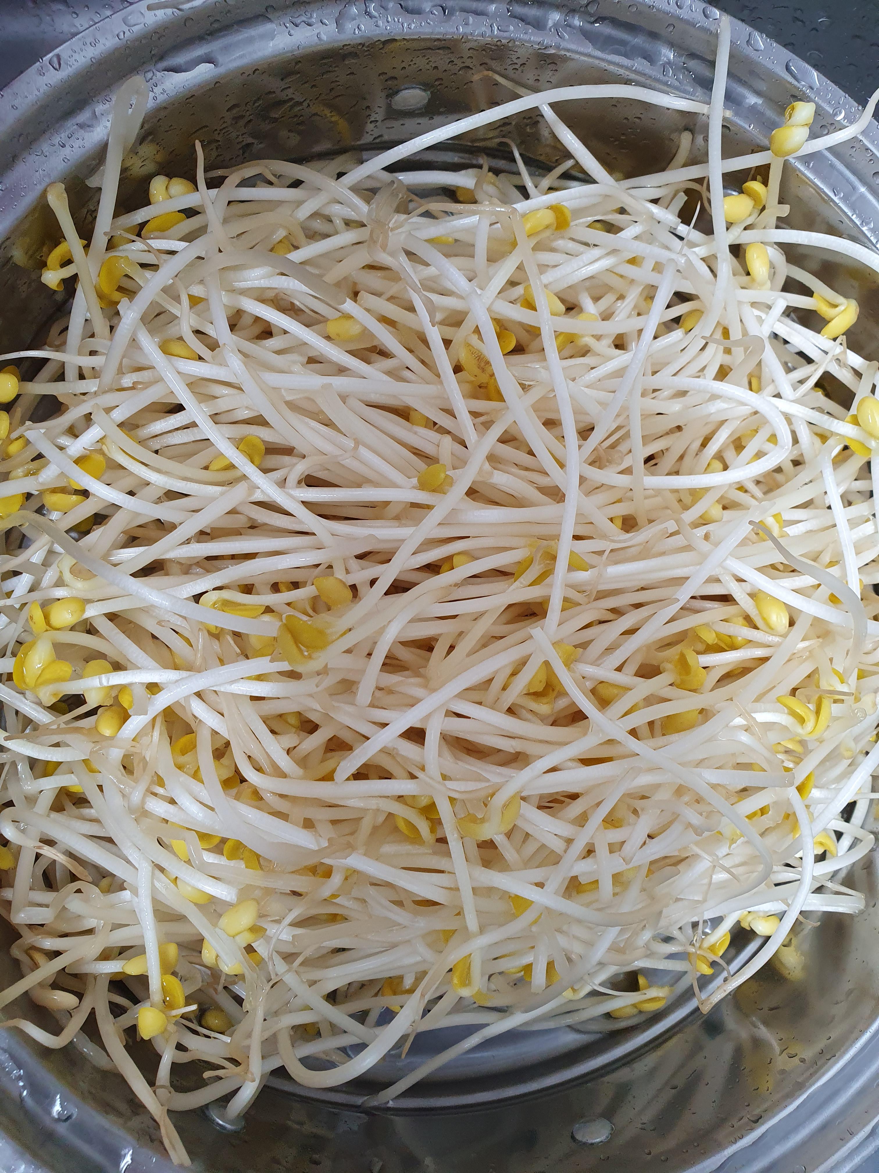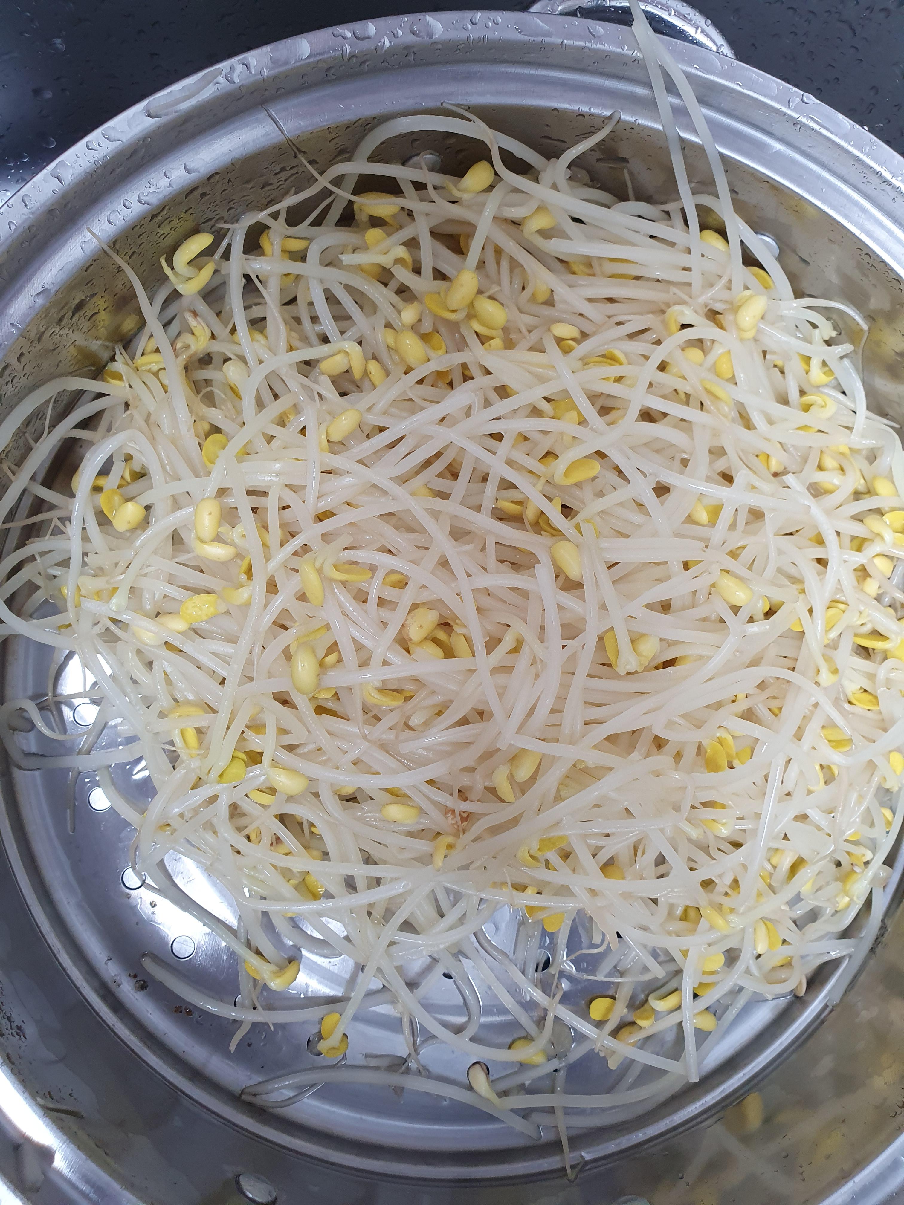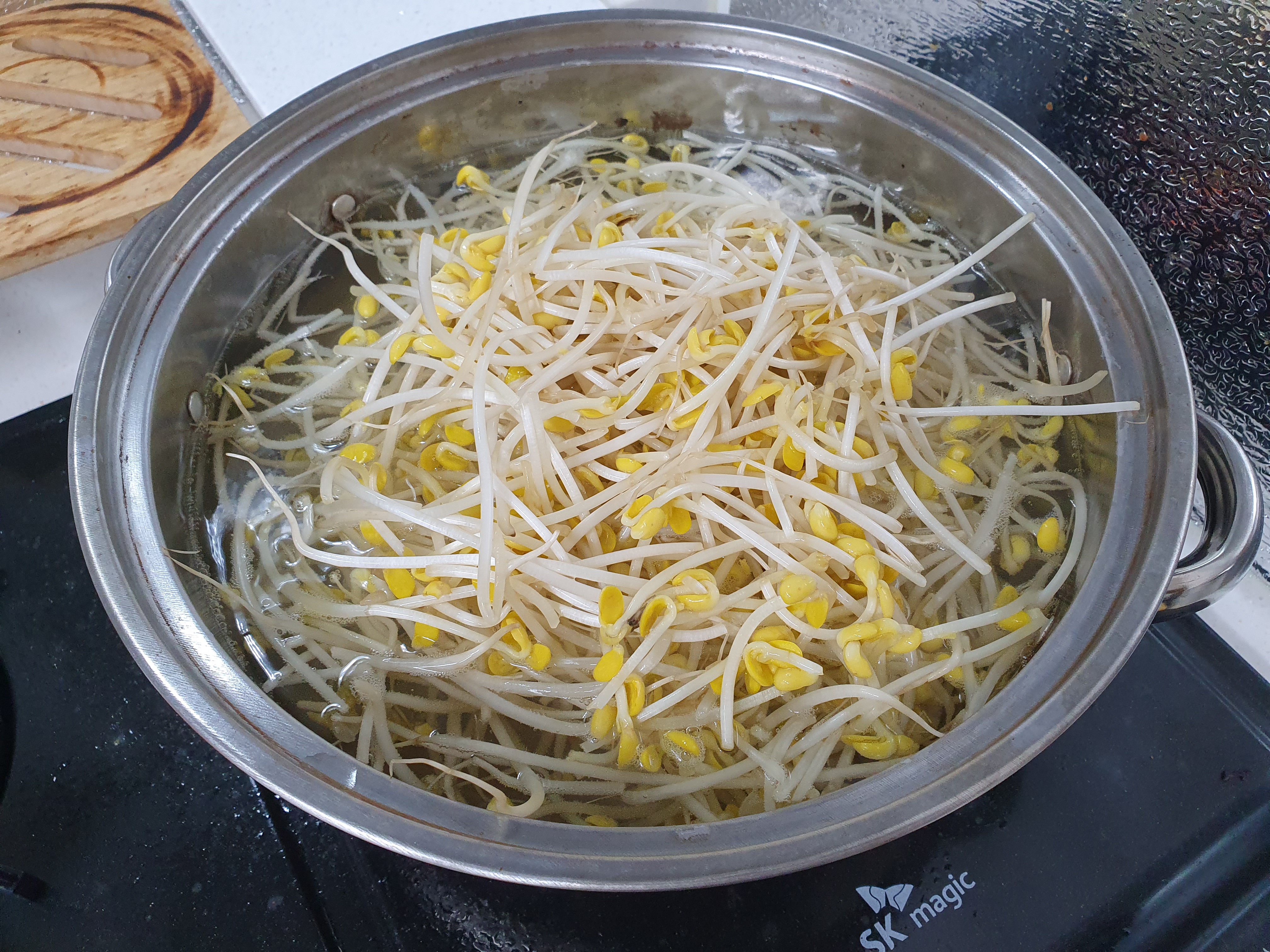 콩나물을 5분 정도 뚜껑을 덮은 채로 삶아 줍니다.
