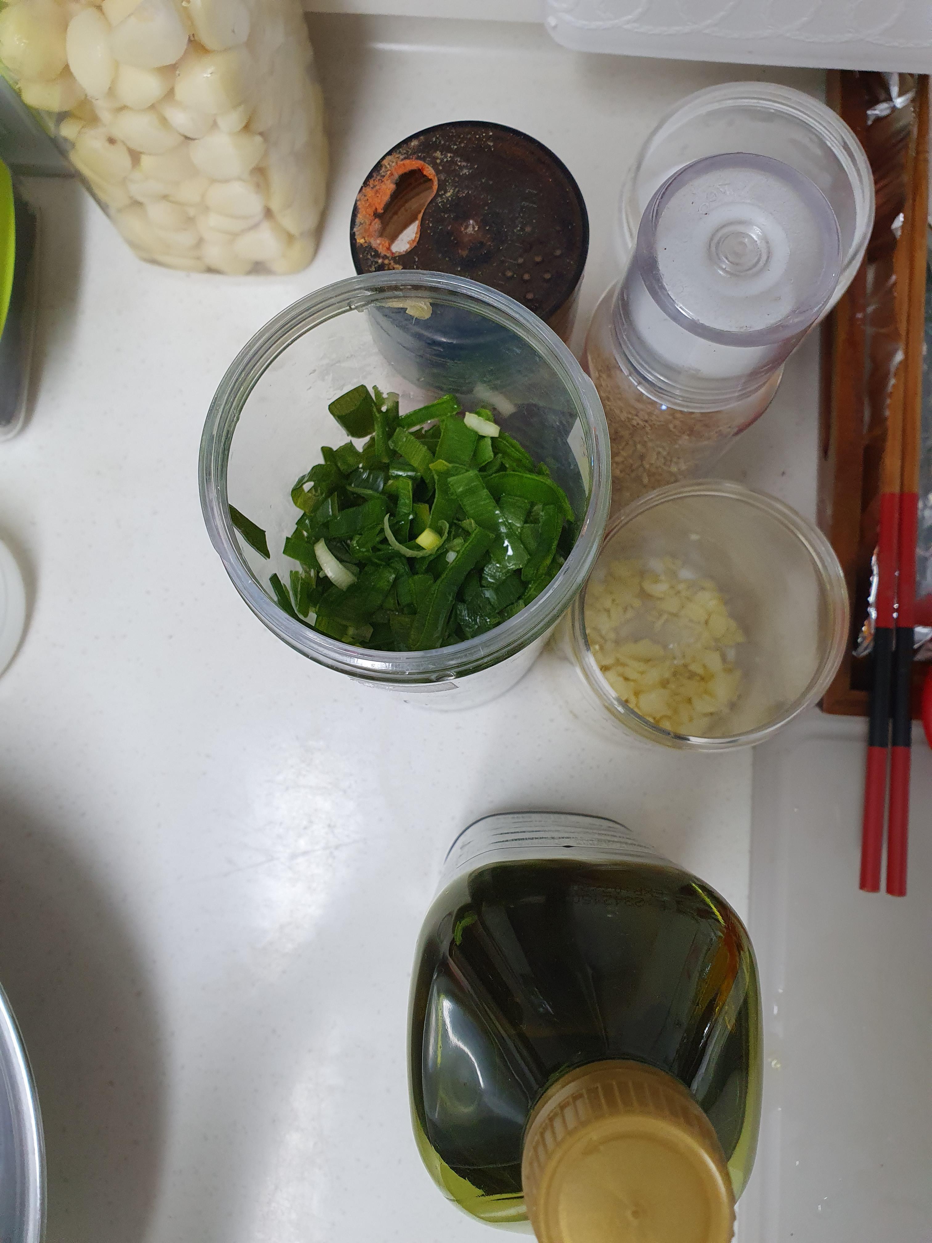 무칠 때 들어가는 양념으로는 올리브유, 마늘, 파, 통깨, 고춧가루, 소금입니다.